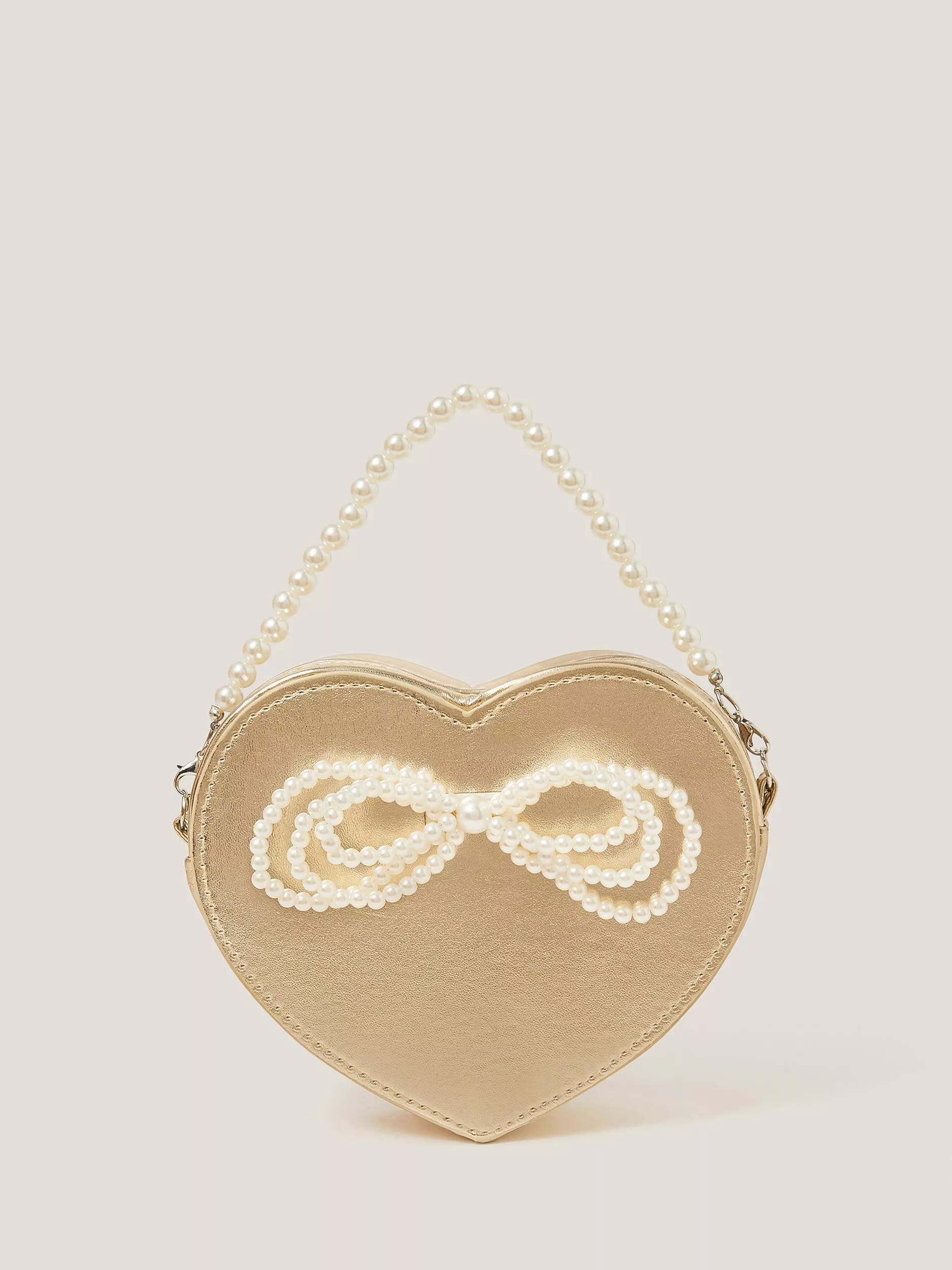 Gilded for a party finish, this Monsoon bag boasts an adorable heart profile with a faux pearl bow and top handle. Fastening with a zip, it's the perfect place to keep their sweets, lip balm, and accessories.