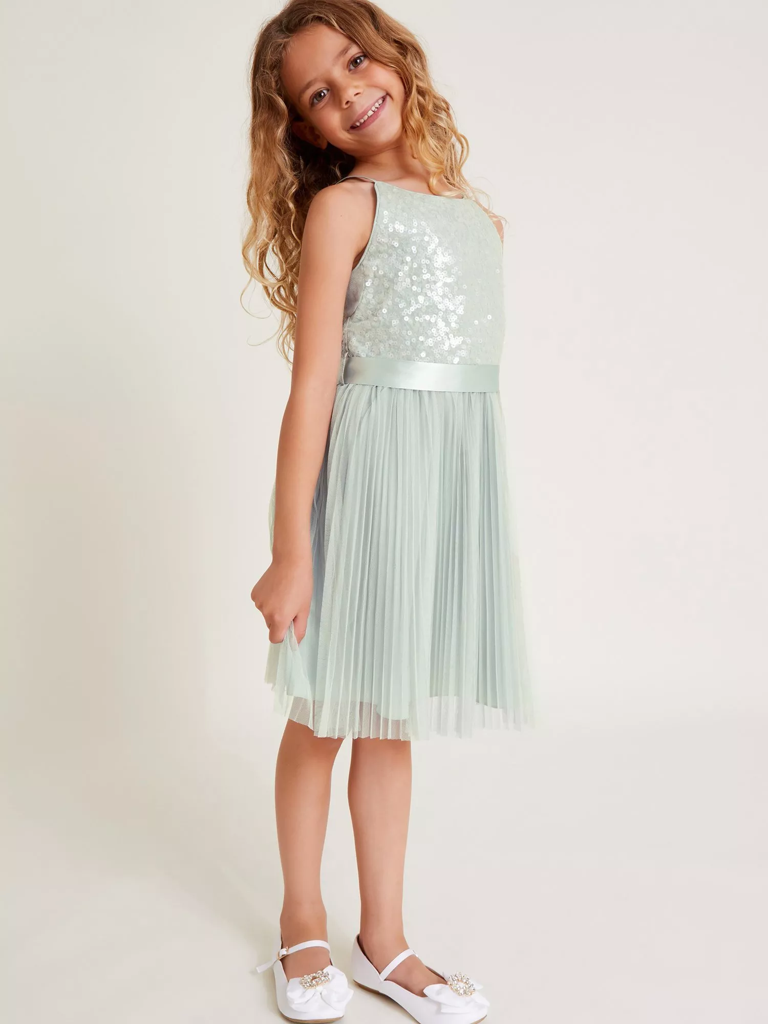 This party dress features a super-sparkly sequin bodice and a knife-pleated skirt. Perfect for twirling and dancing, it's finished with a satin bow on the waist and a zip fastening at the back.