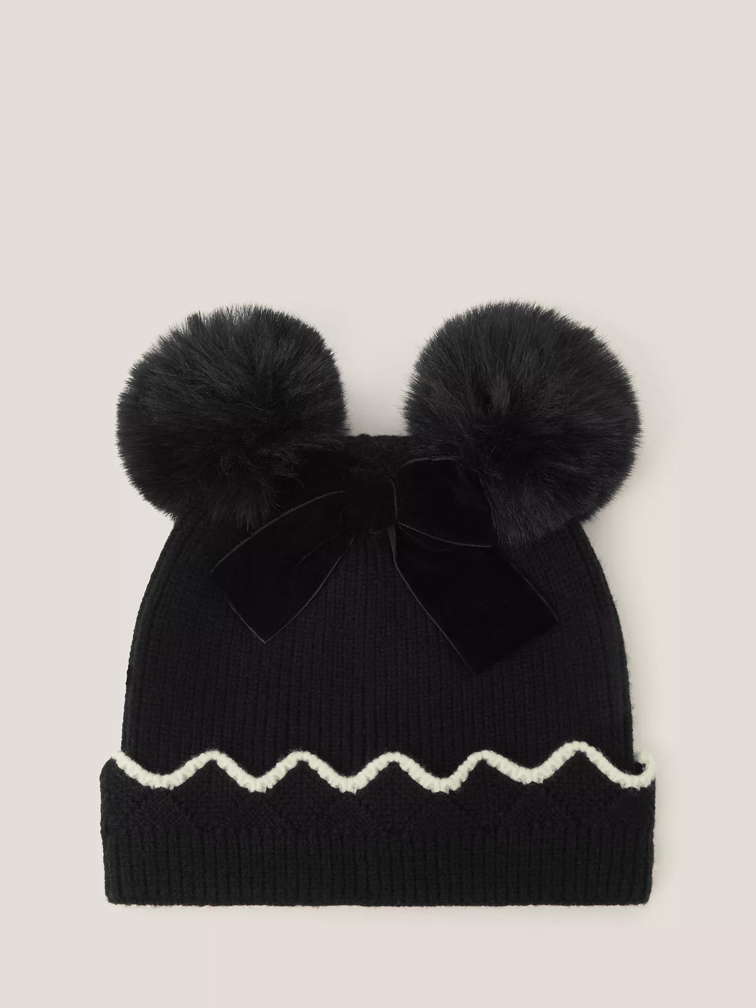 Designed in ribbed knit with a scallop trim, this adorable hat features a fluffy pom-pom top. Finished with a decorative velvet bow.