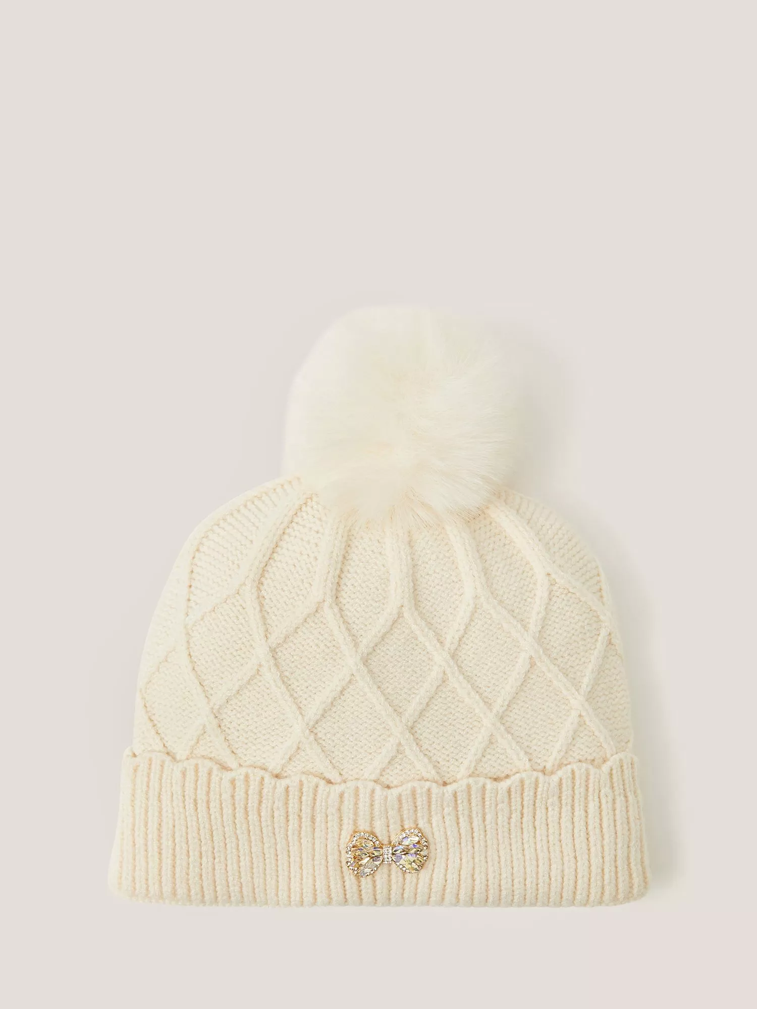 Designed in cable knit with a ribbed trim, this adorable hat features a fluffy pom-pom top. Finished with a decorative bow.