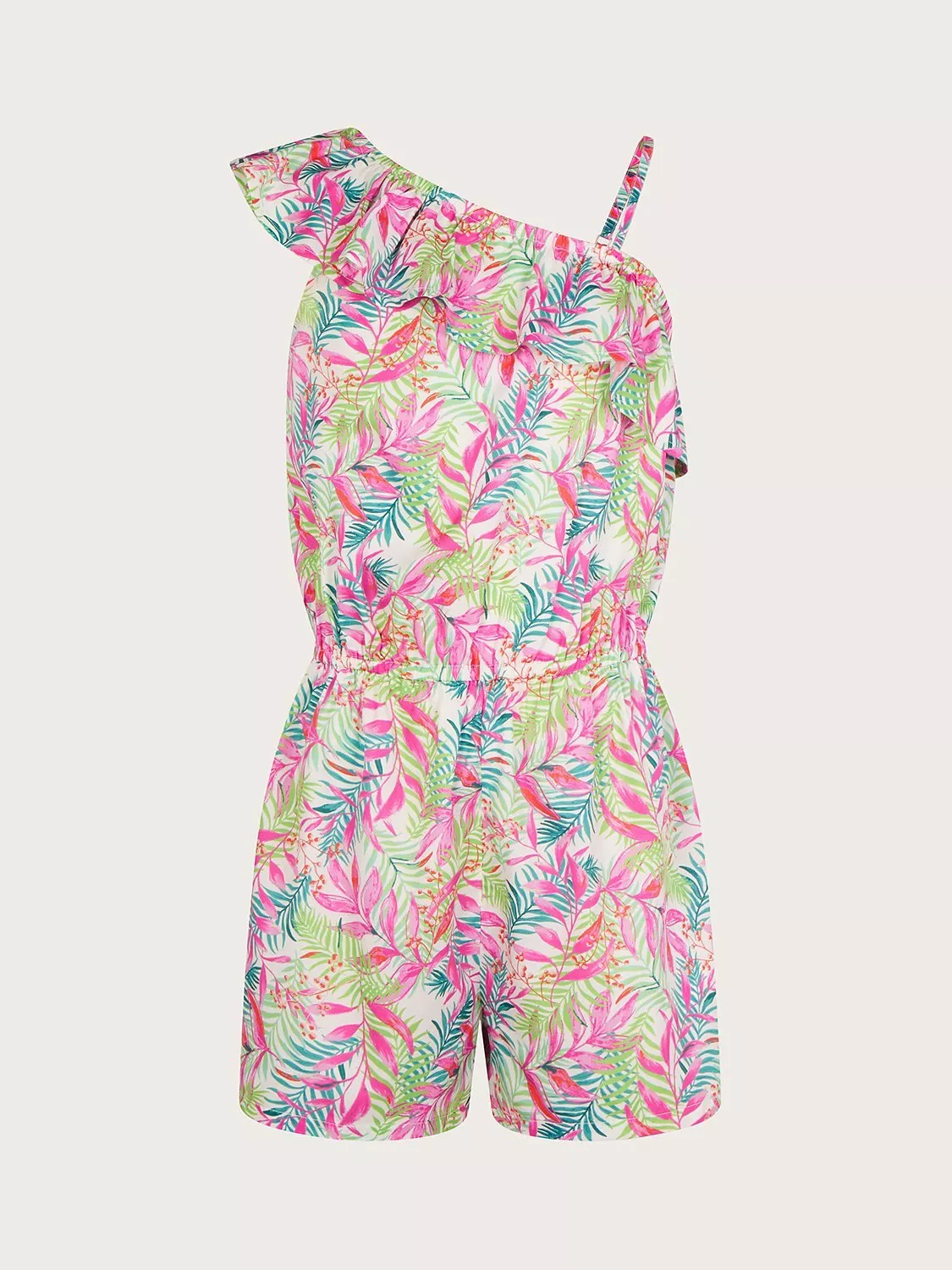 Trimmed with ruffles, this one shoulder playsuit by Monsoon is comfortable enough to wear from morning to night thanks to its lightweight fabric and breezy design.