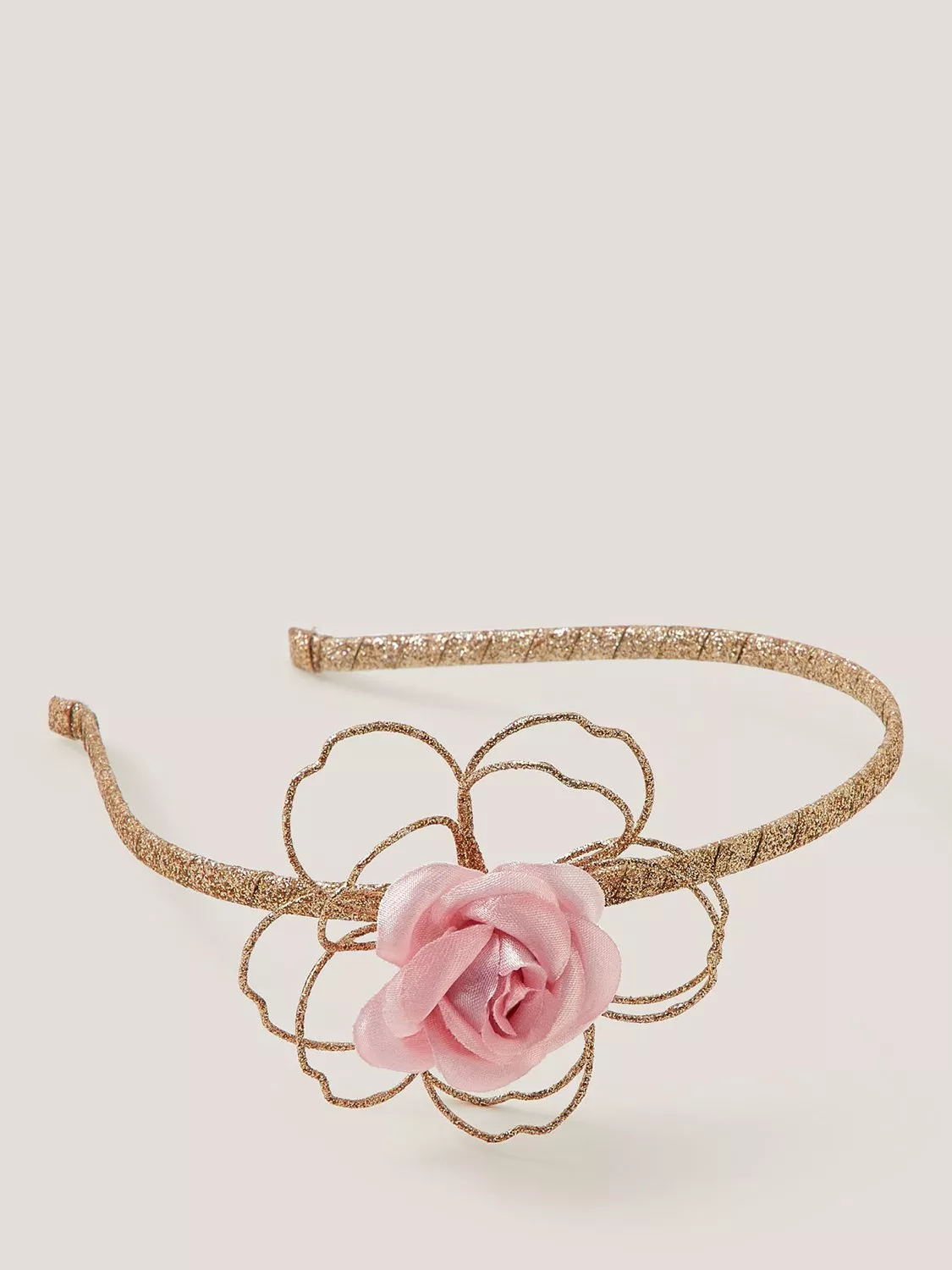 Wrapped in a glittery gold finish, this headband is adorned with a delicate wire flower and a shimmery pink rose.