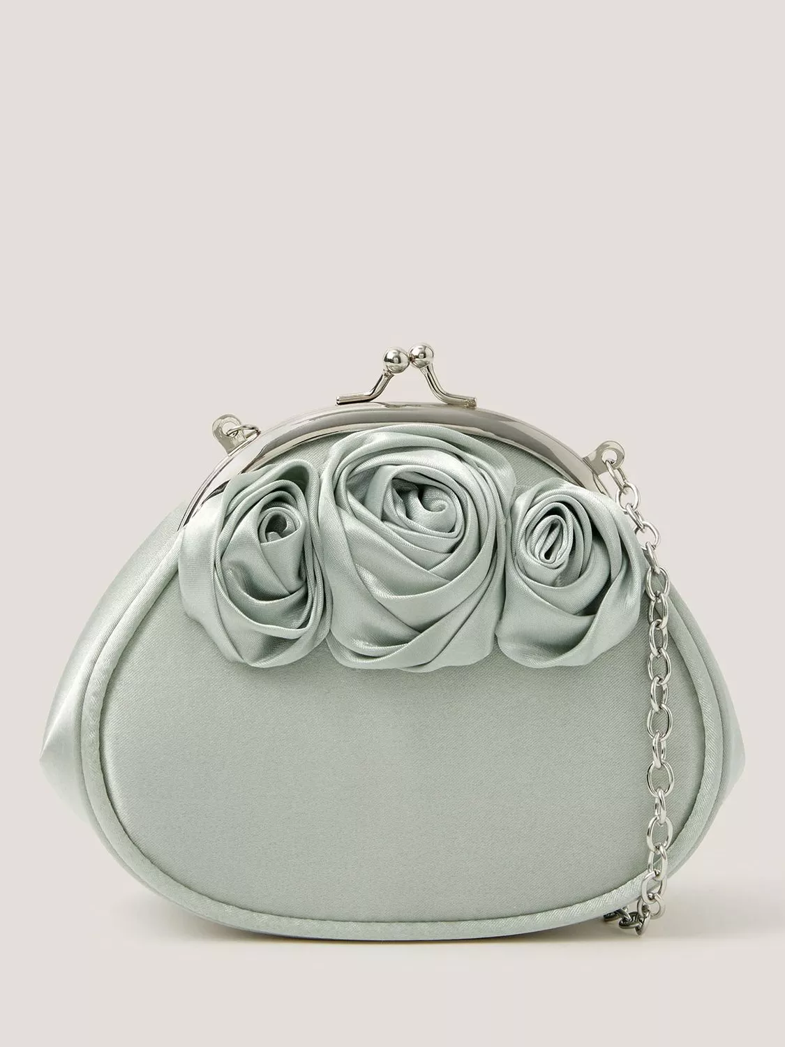 Decorated on one side with soft, satin roses, this is a beautiful bag for bridesmaids and other special occasions.