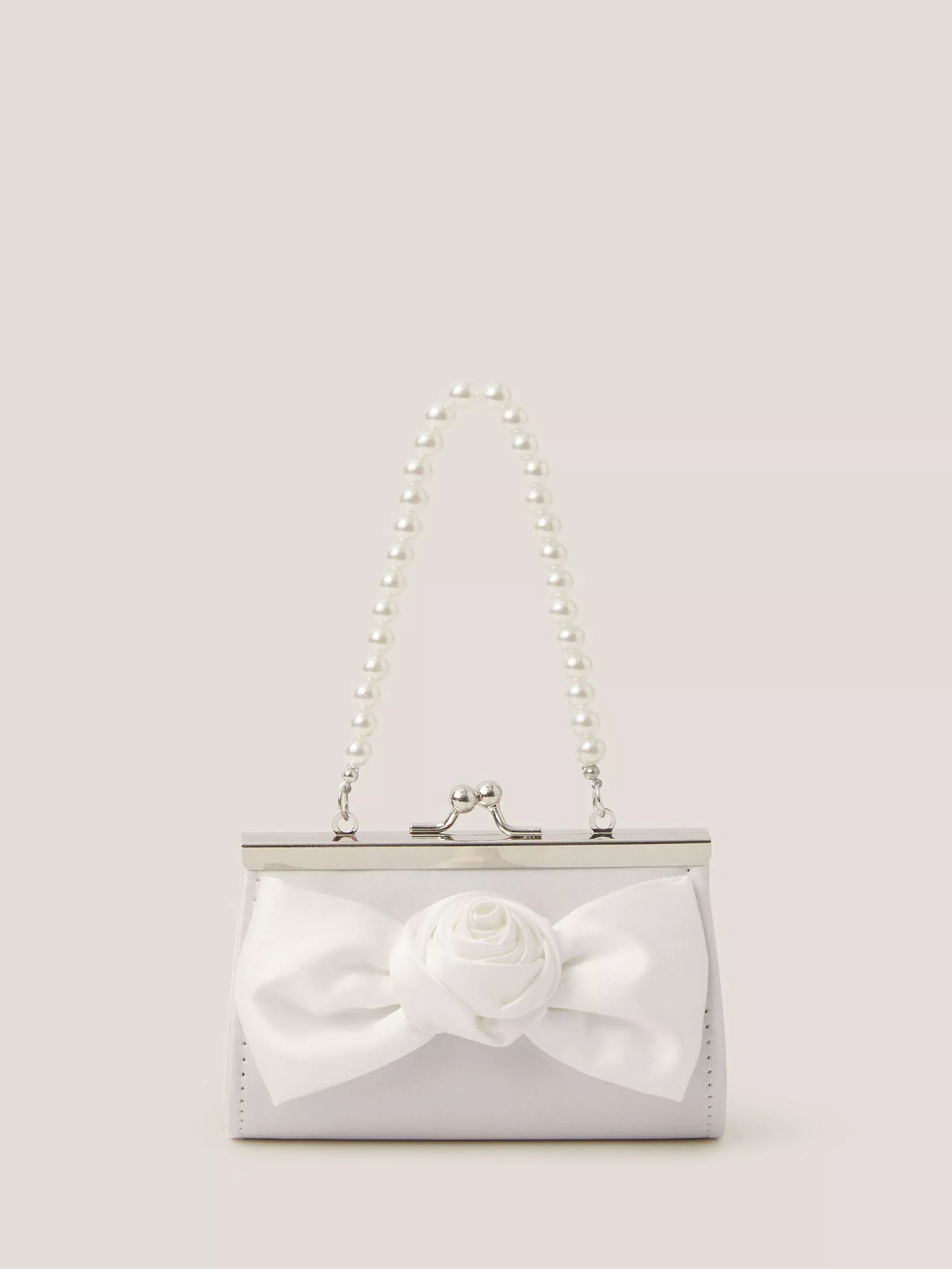 Decorated on one side with a soft, satin bow trimmed with a rose, this is a beautiful bag for bridesmaids, First Communions and other special occasions. It also features a pearl bead shoulder strap.