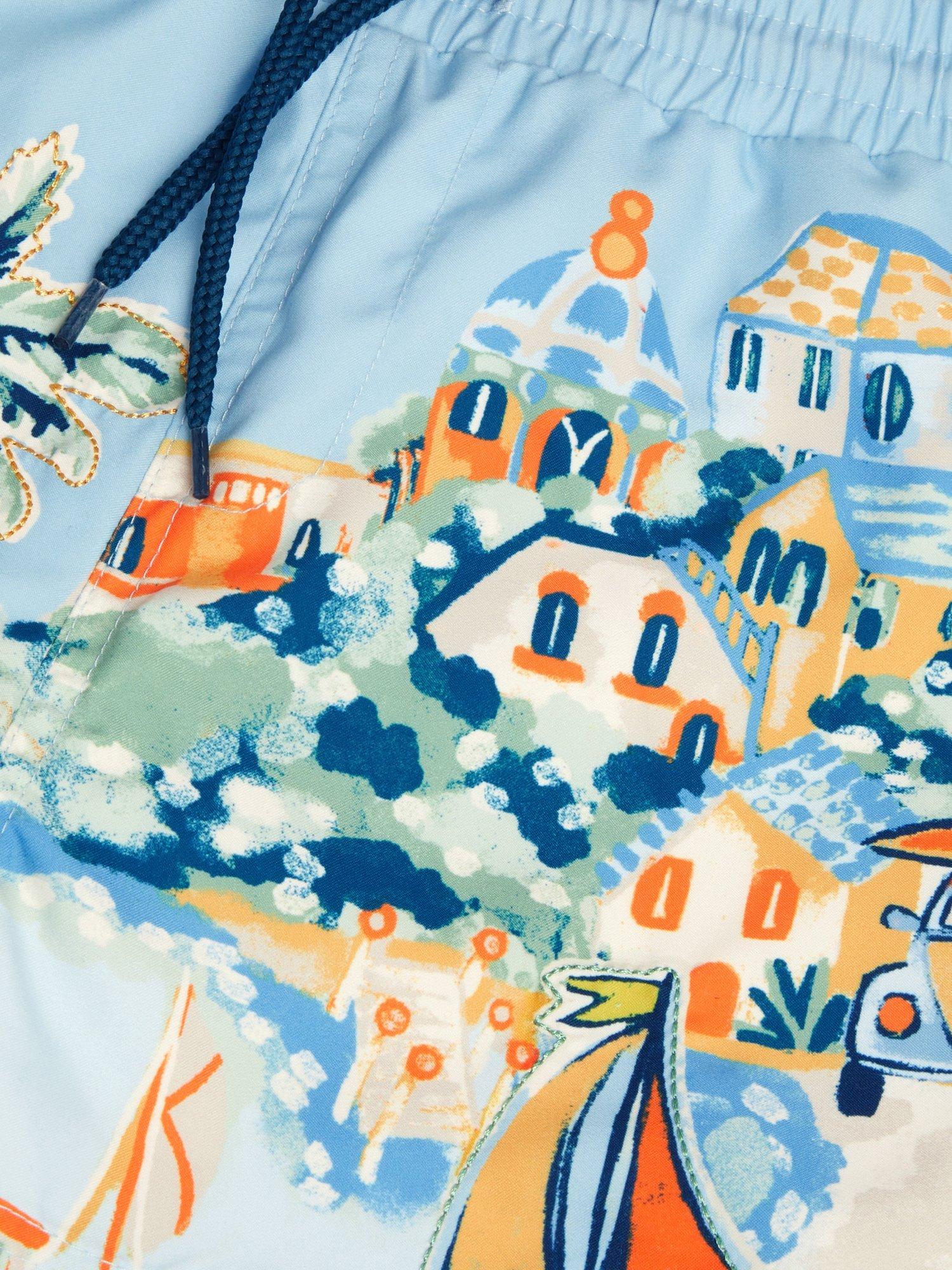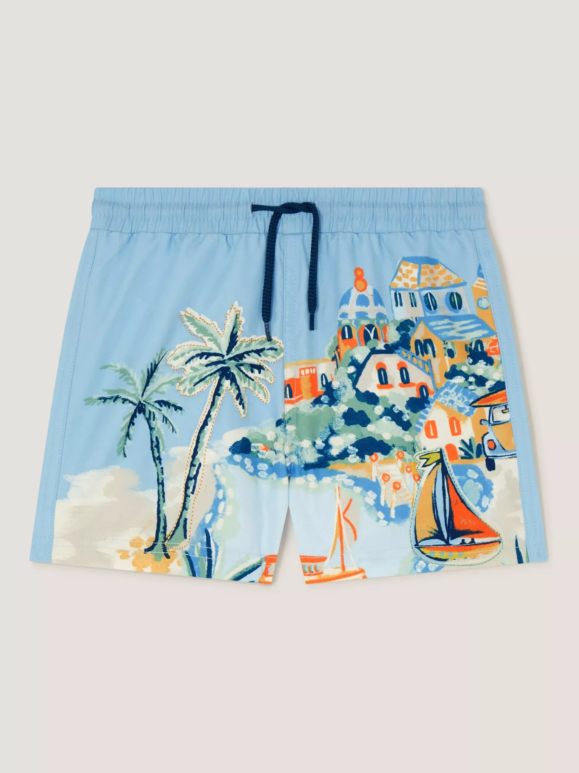 These swim shorts feature a postcard-worthy scene of a tropical harbour view with embroidered finishes. A must-have for the holiday suitcase.