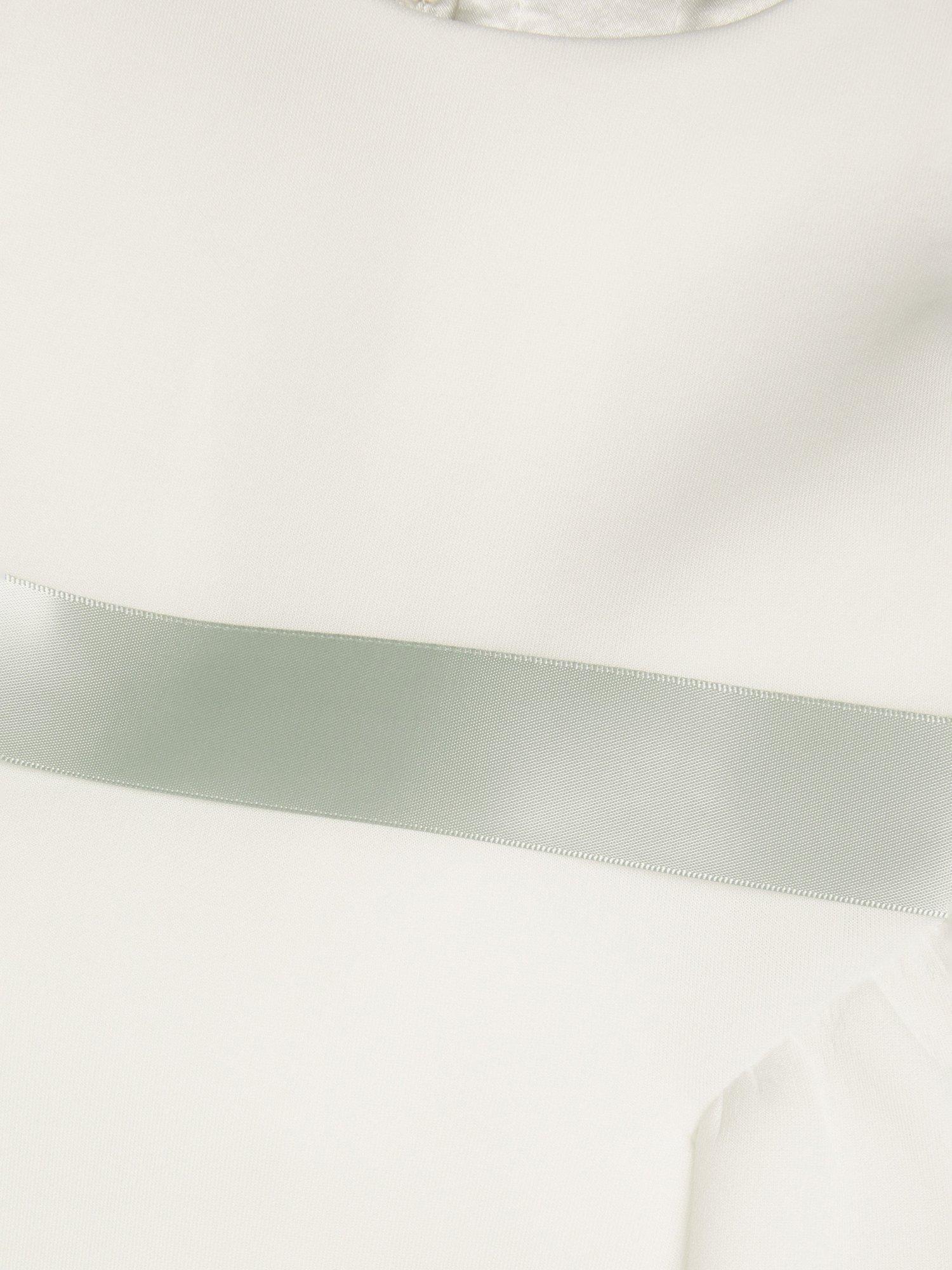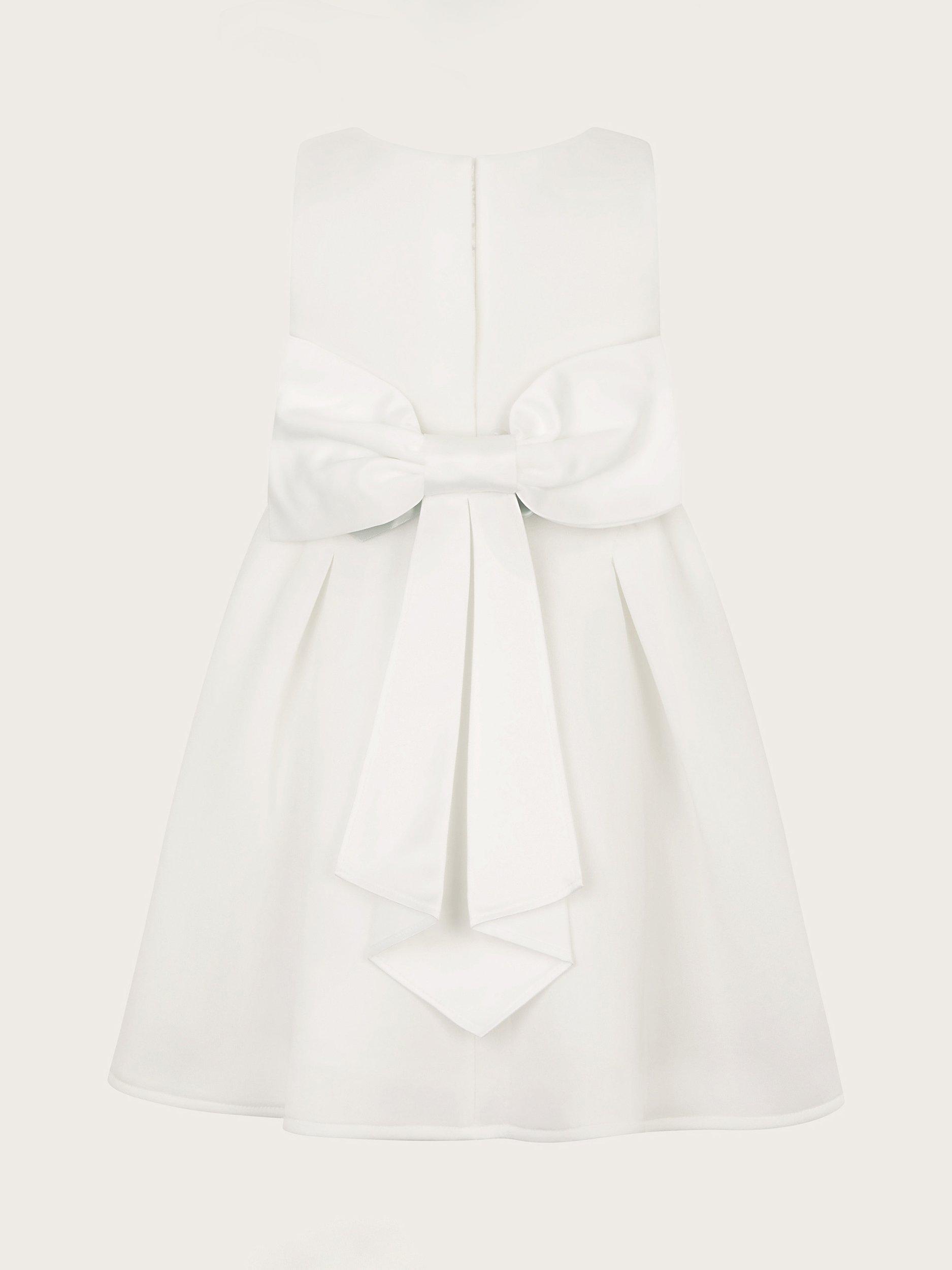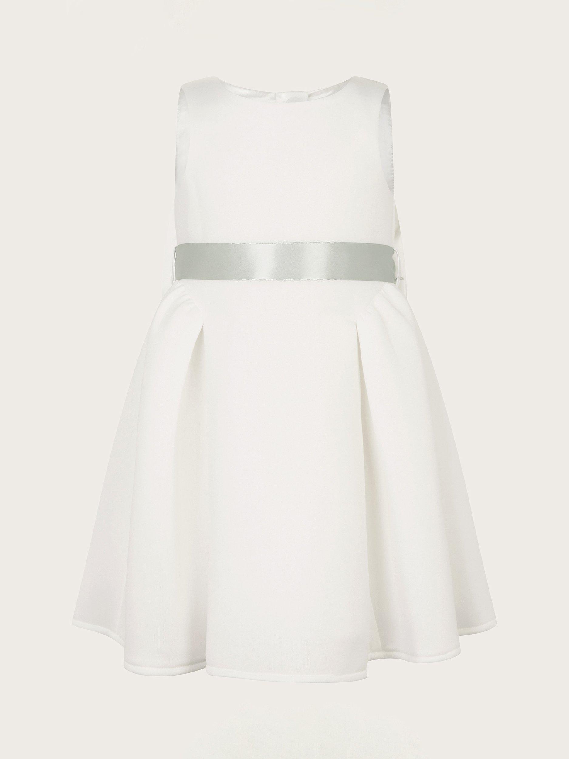 Celebration-ready. This dress is created in soft, scuba fabric with a floral applique belt and cascading bow to the back. Featuring a flared, pleated skirt, with a button through fastening on the reverse.