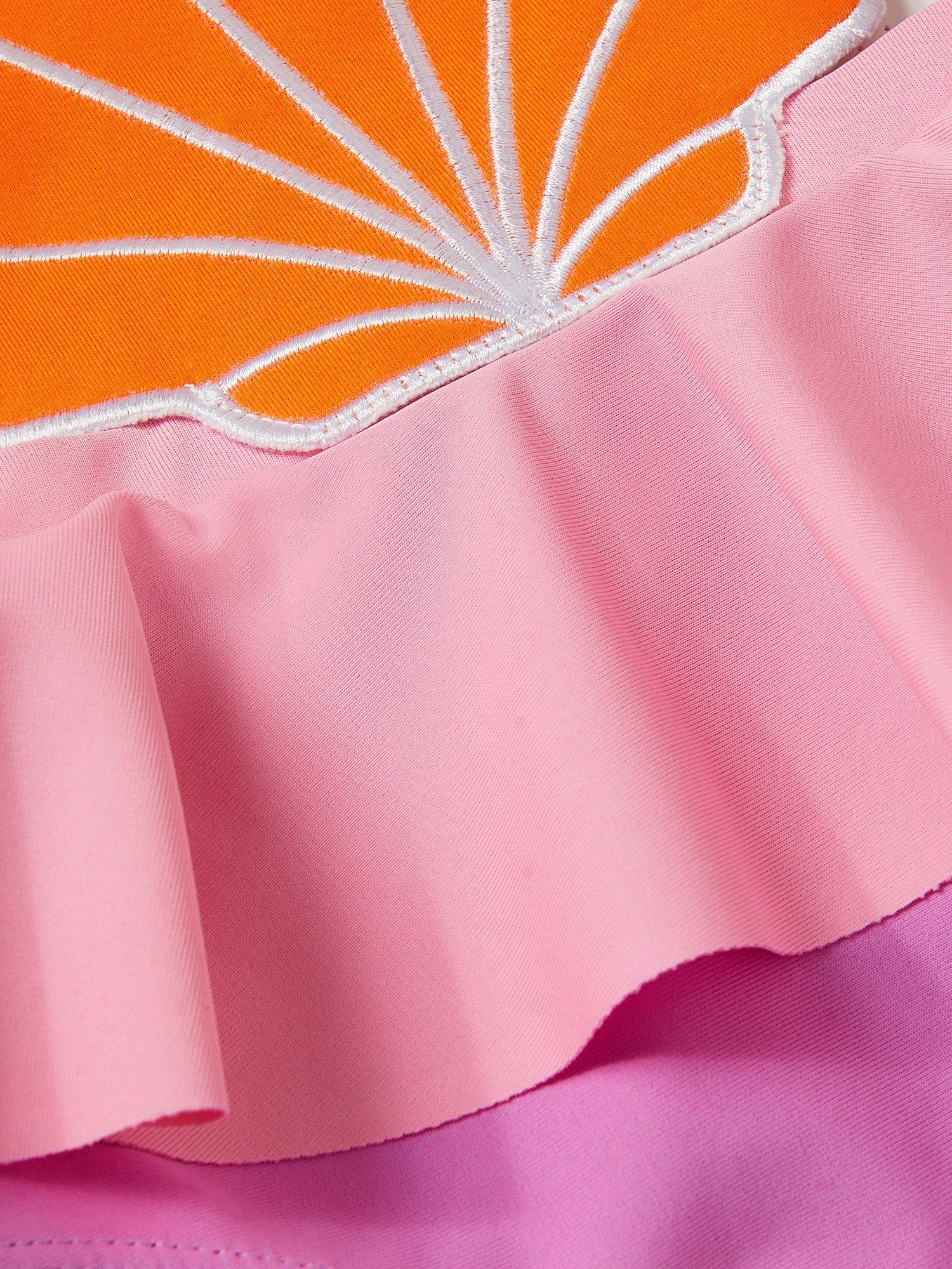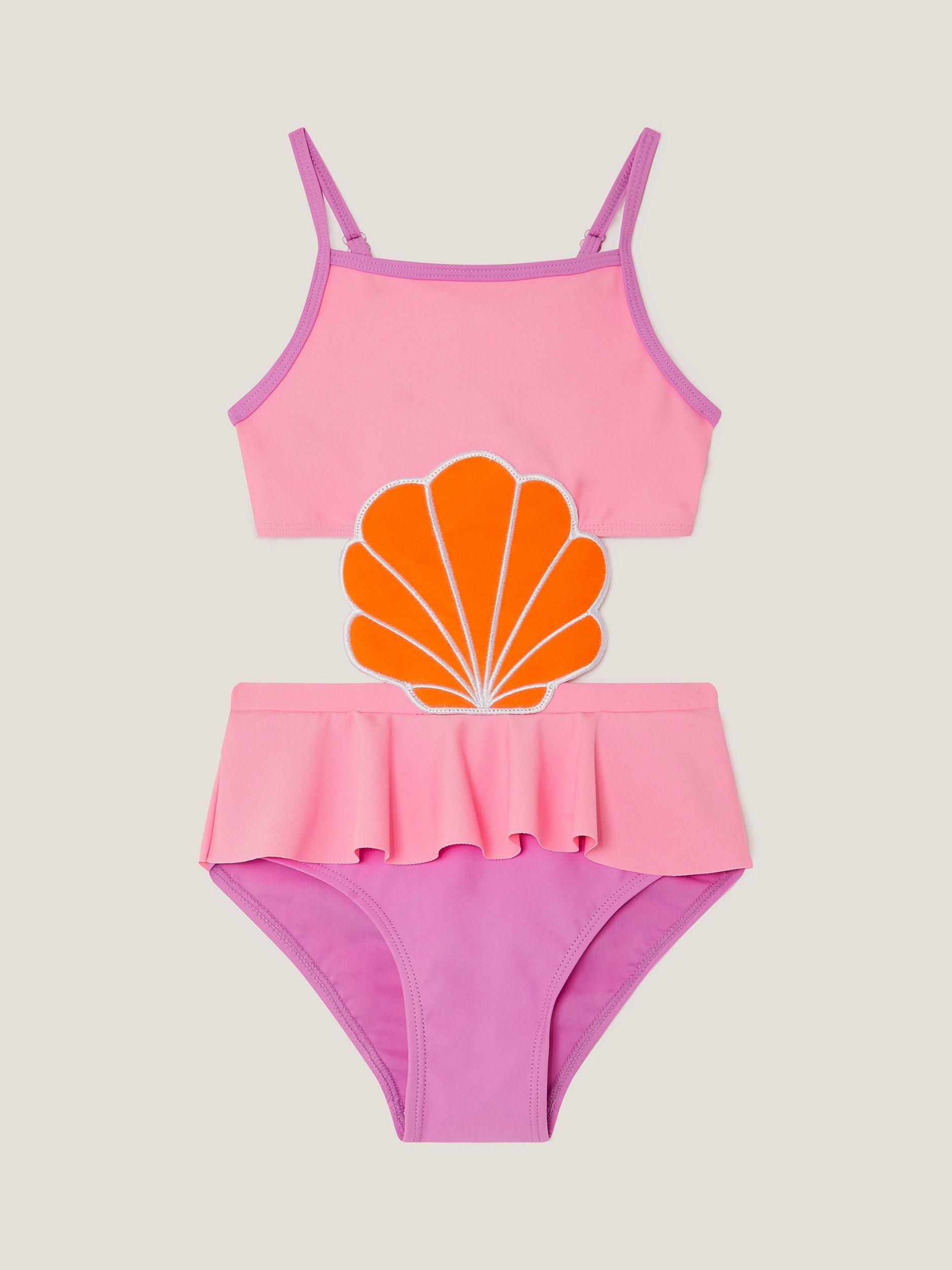 Splish and splash in style with this two-part swimsuit from Monsoon, held together with a bold, bright scallop shell. Designed with a bralette style top and frilly bottoms to match. Please note that this product can only be returned with the hygiene seal still in place.