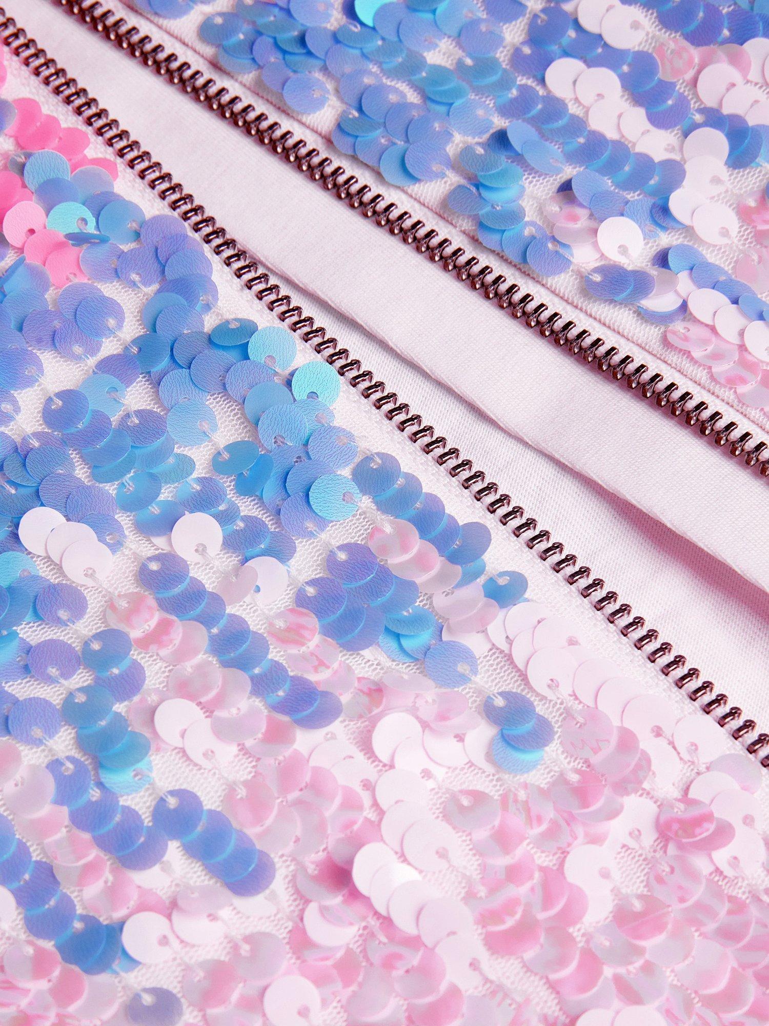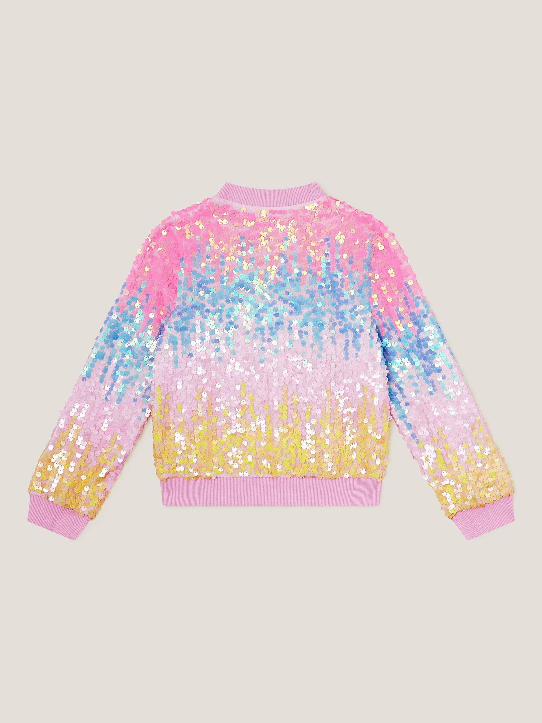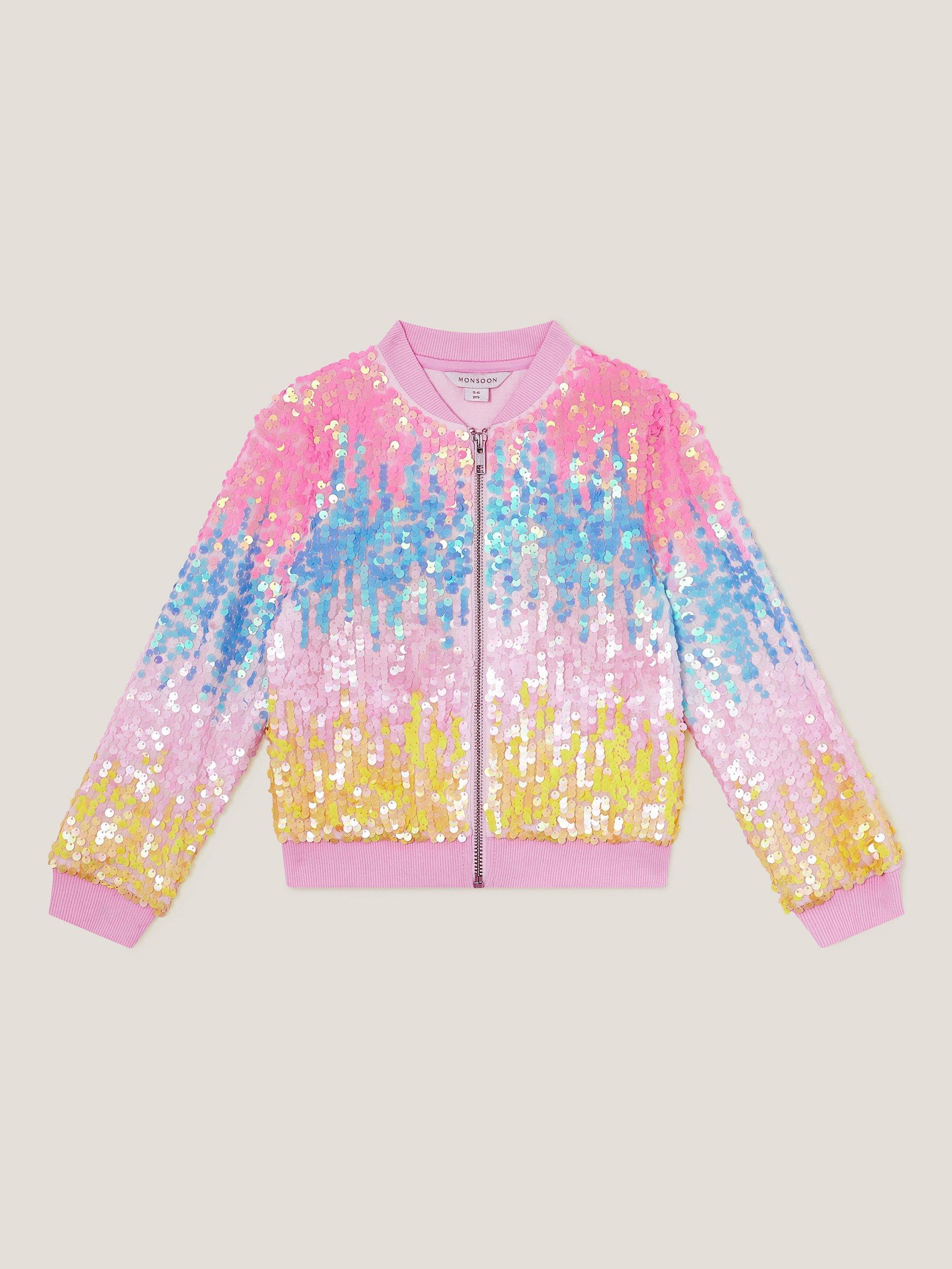Disco diva! The perfect layer to go over all their party looks, this bomber jacket is bedazzled with sparkly sequins in a dreamy ombre finish. Complete with a front zip fastening.