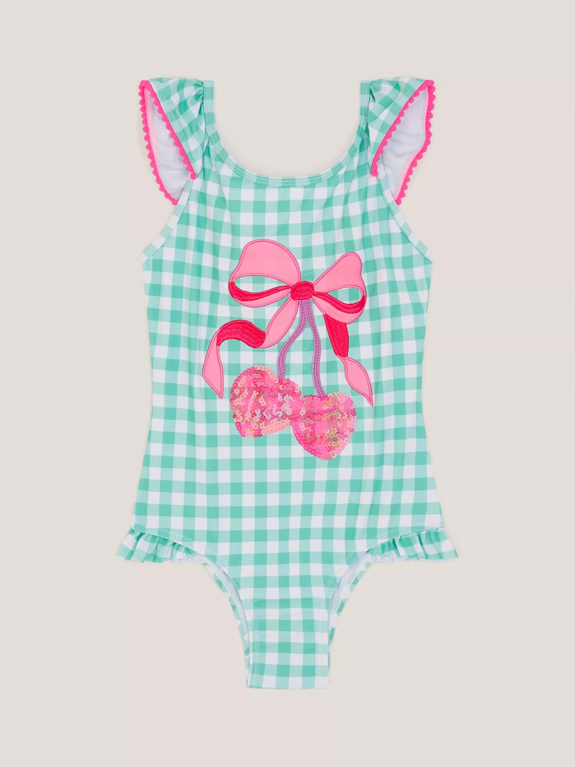 Freshly picked for all their splash-time adventures, this swimsuit is patterned with green gingham and a sequin cherry design. Finished with frills at the shoulder straps and leg cuffs.