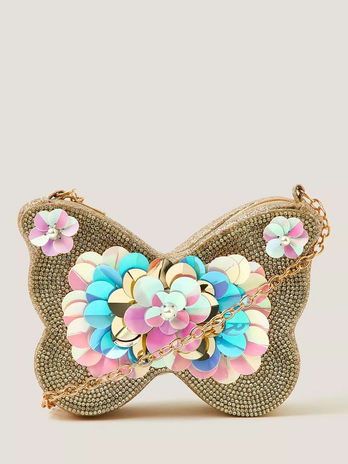 Shaped like a butterfly and embellished with gold rhinestones, iridescent sequins and pearly beads, this bag is the ultimate party accessory. Finished with a zip fastening and long chain strap.