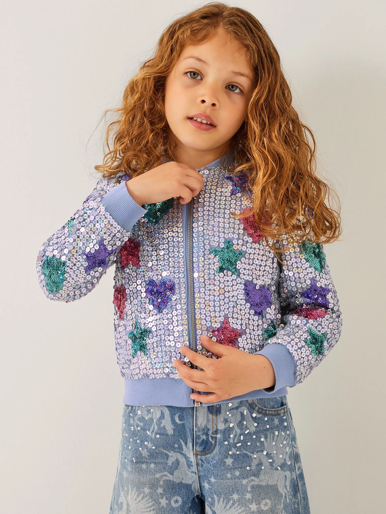 The perfect layer for all their party outfits. Designed in a bomber style, this sequin-adorned jacket from Monsoon features colourful heart and star motifs with a front zip fastening to finish.