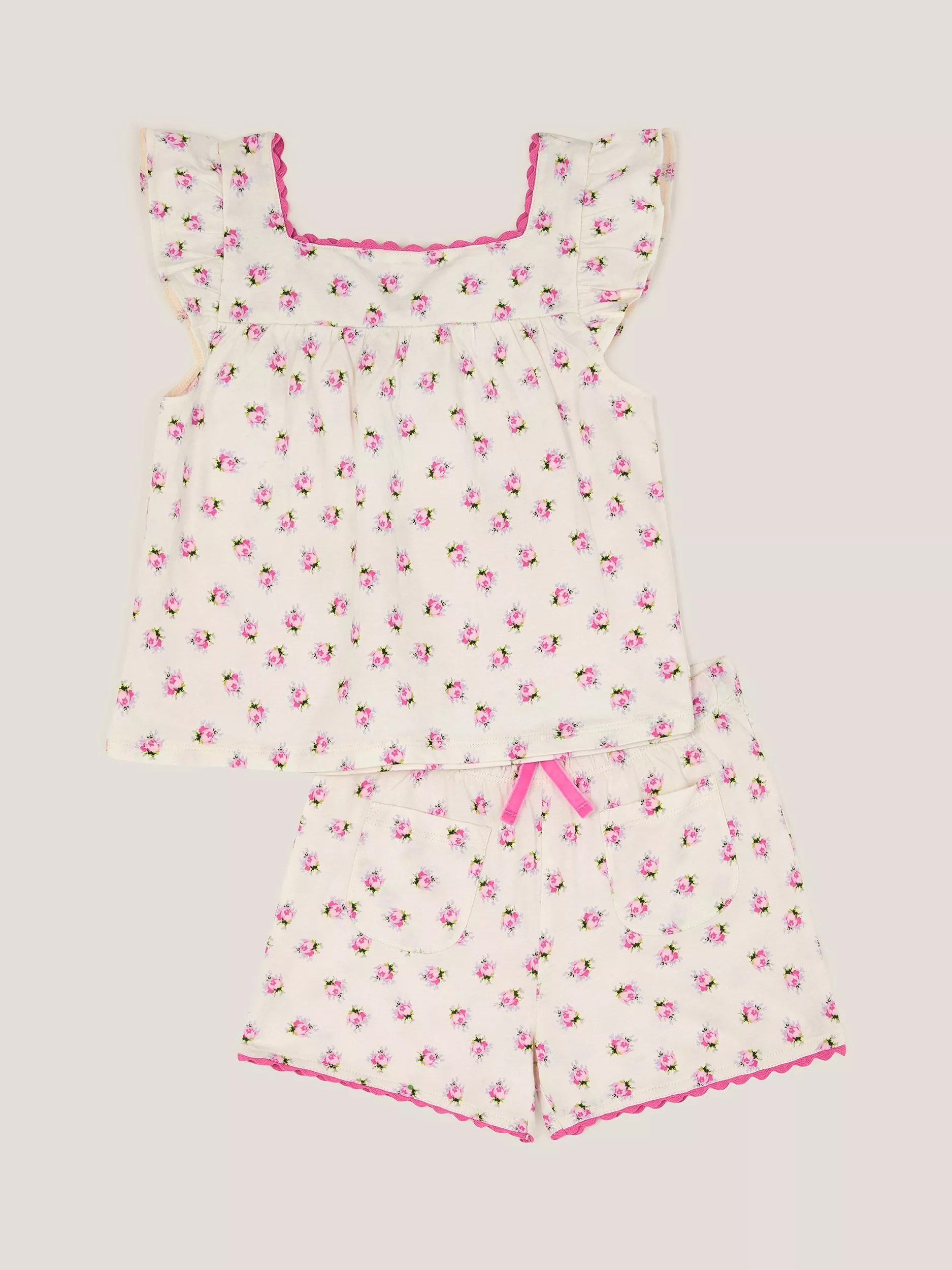 Making dreams extra sweet. Perfect for warm, balmy nights in the summer, this PJ set includes a frilly jersey top and matching short, both decorated with pink roses and scalloped trim.