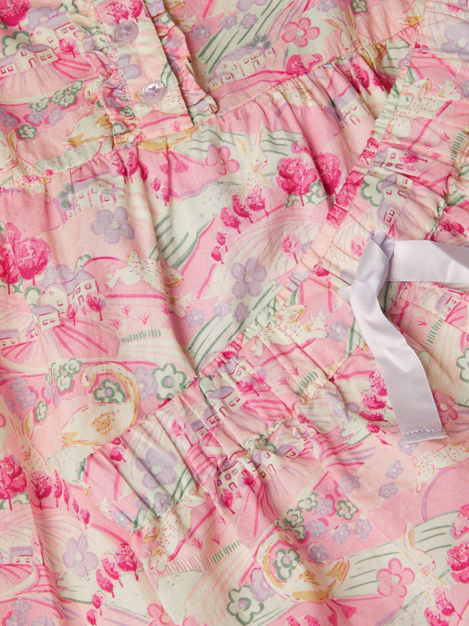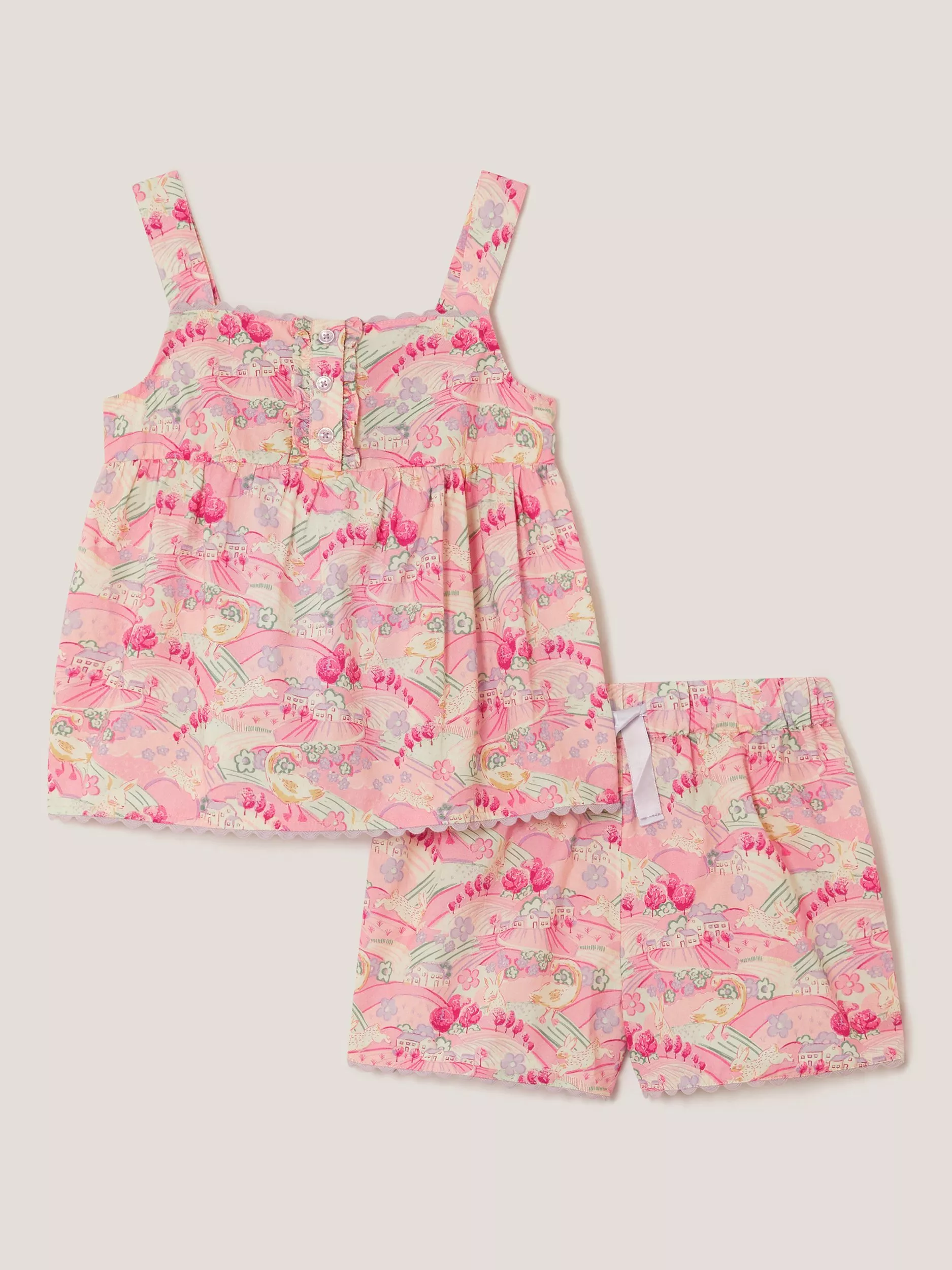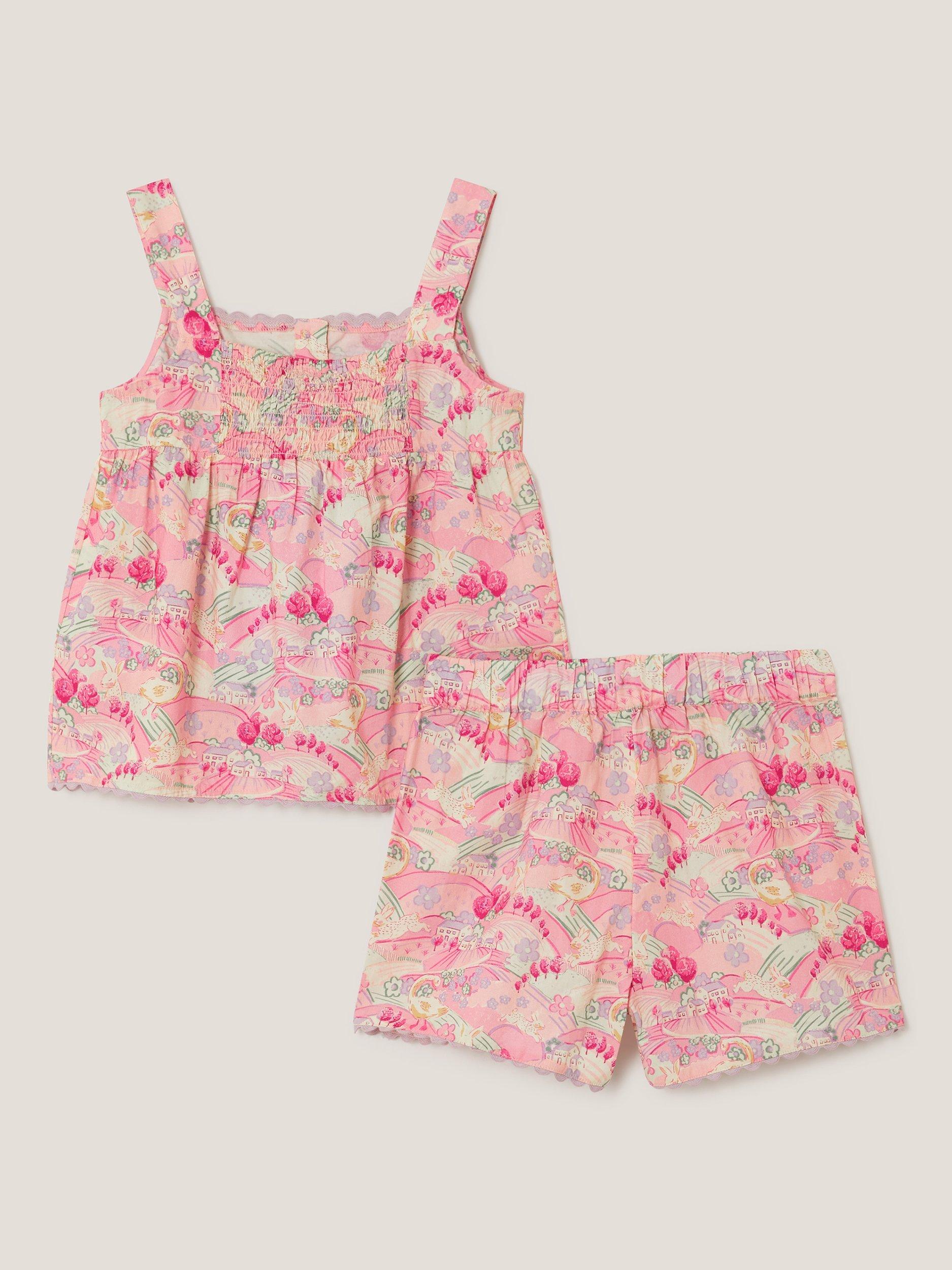 Made for balmy evenings and bright early mornings, these pyjamas add endless joy to their bedtime routine. The set includes a cami top and shorts, both patterned with a springtime countryside scene over the baby pink cotton base.