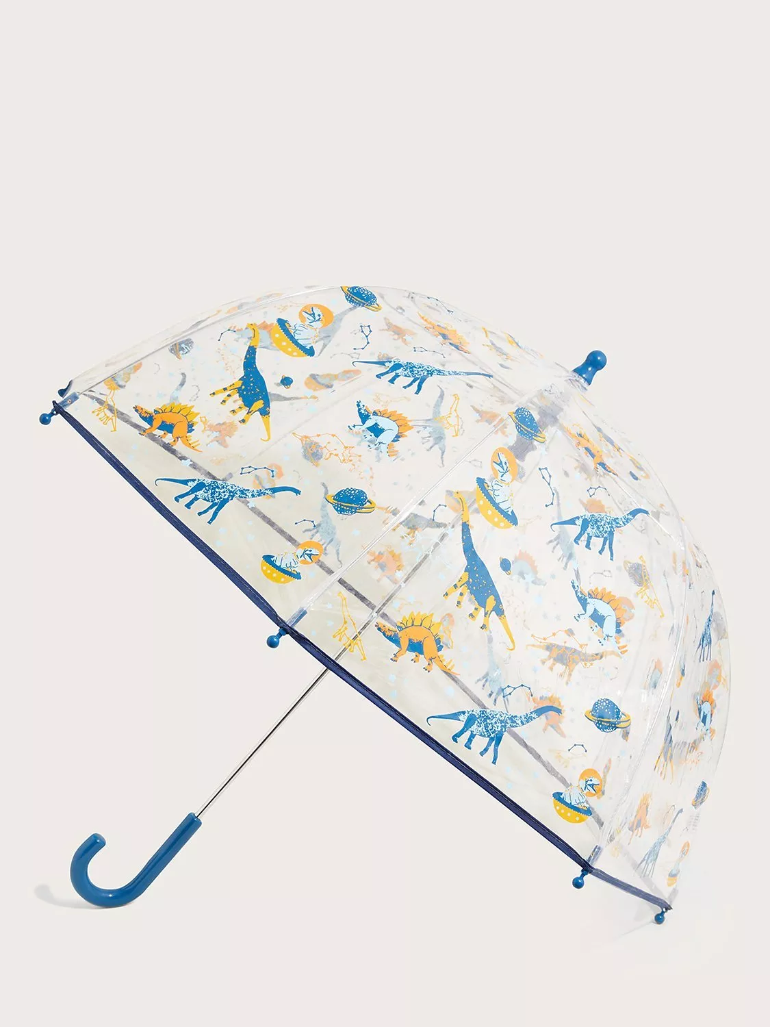 Keep them well protected from all the elements with this domed umbrella, featuring a transparent cover with a fun dinosaur print.