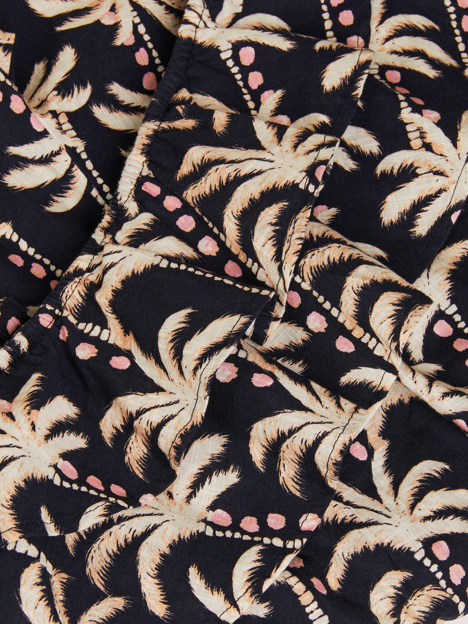 This sleeveless playsuit features an asymmetric neckline and a playful palm pattern, designed for comfort and movement during adventures.
