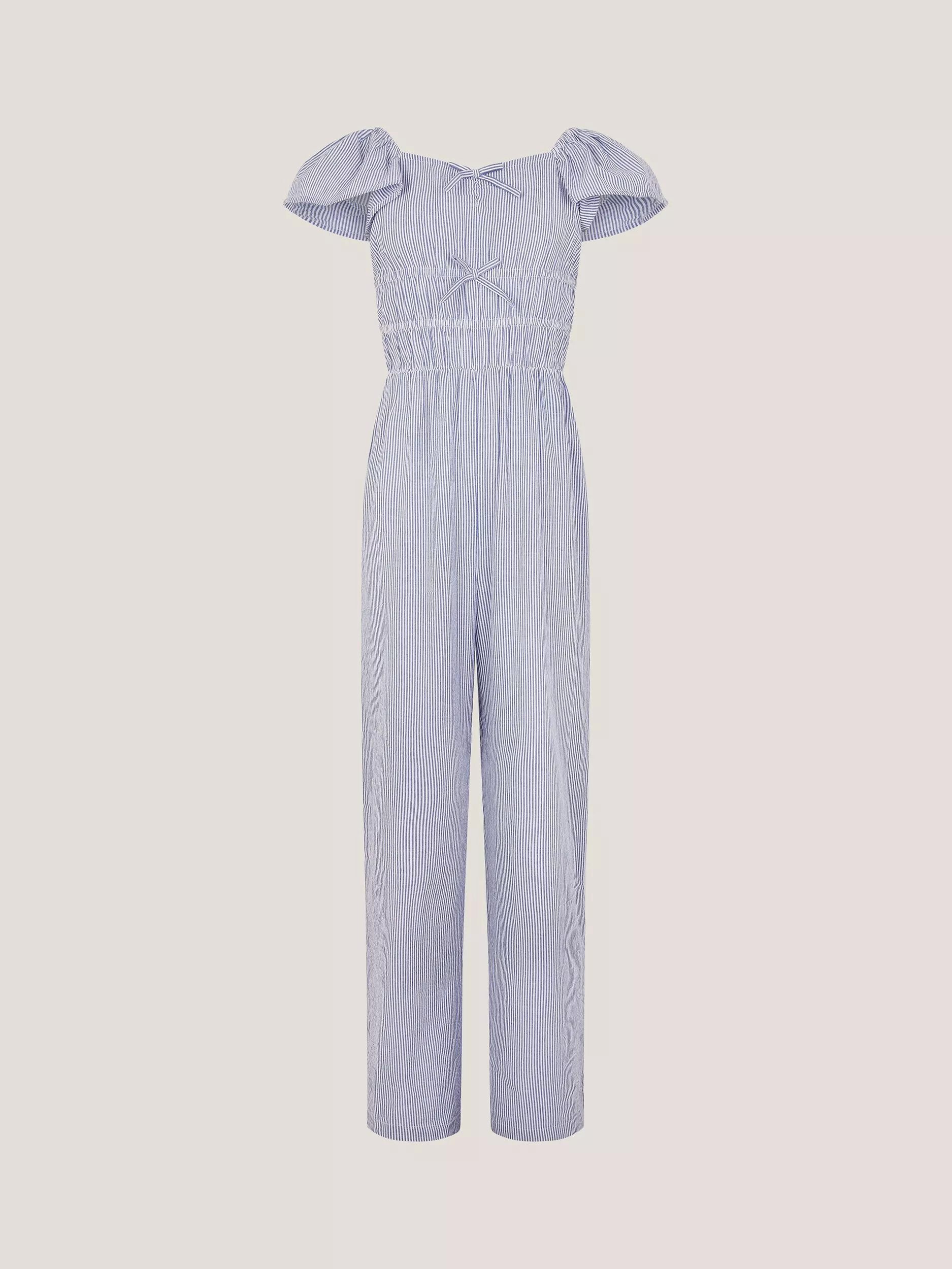 This cotton jumpsuit features a square neck and short sleeves with a subtle striped pattern, offering comfort and style. Finished with a stretchy waistband and bow details.