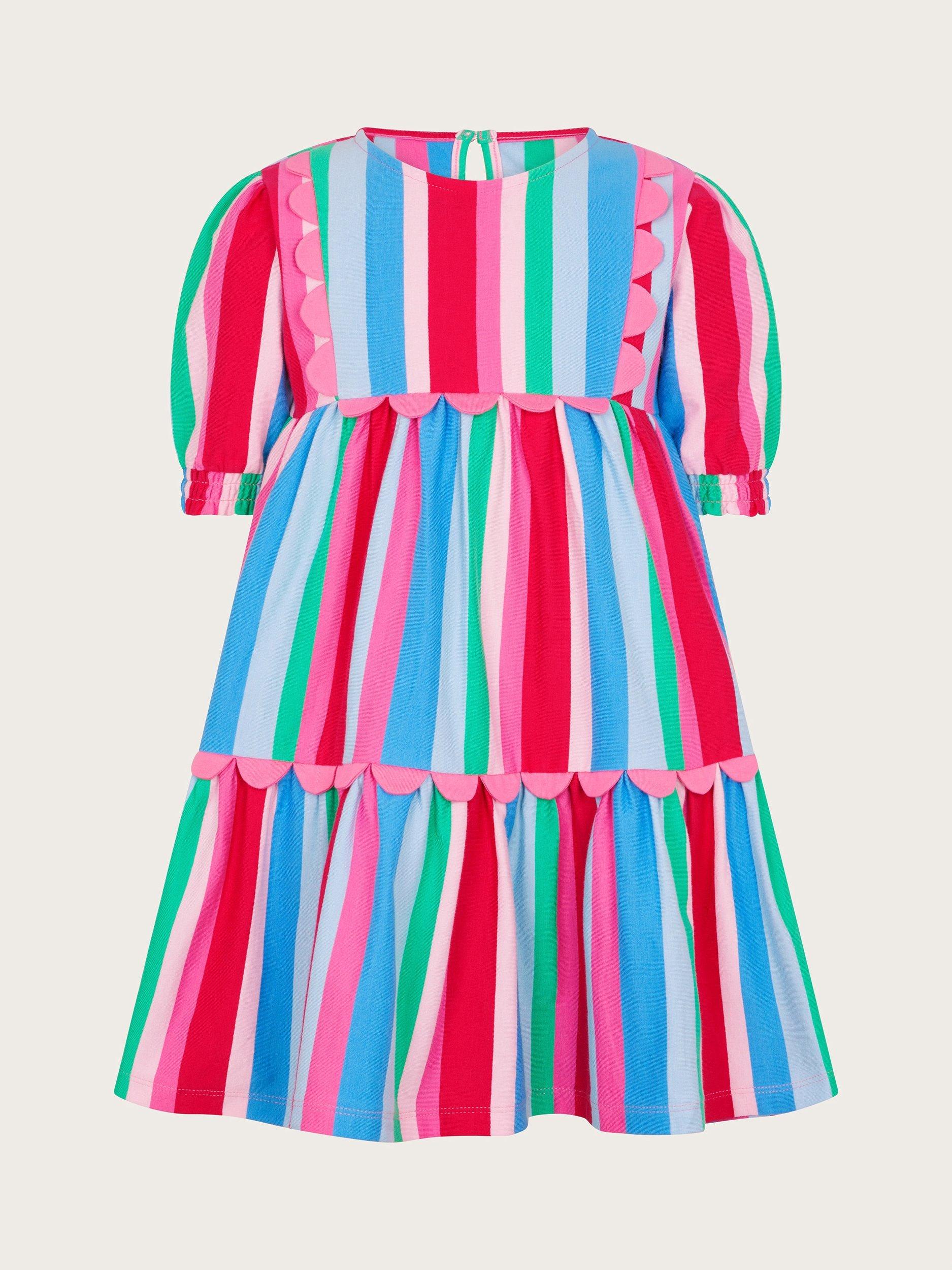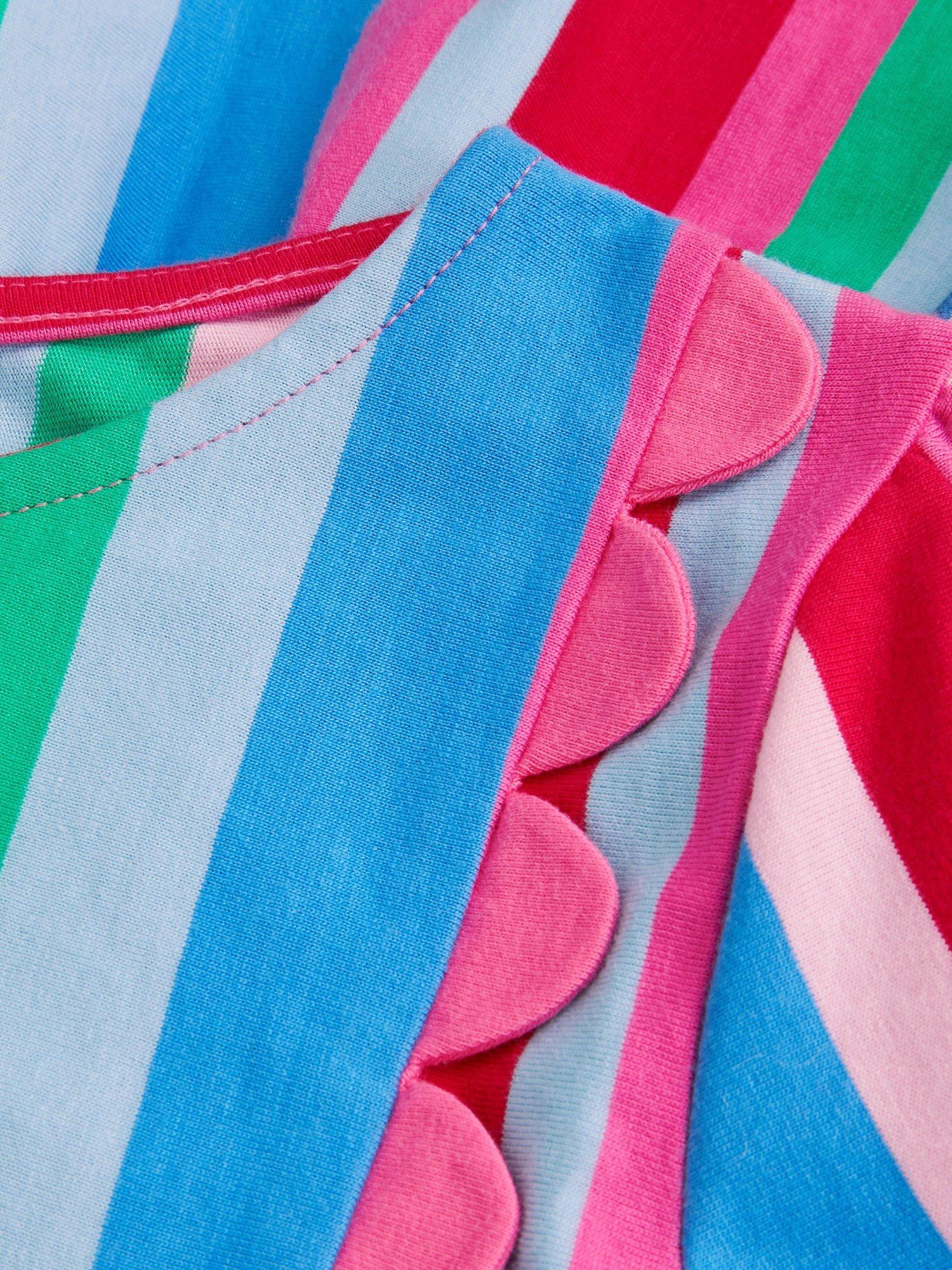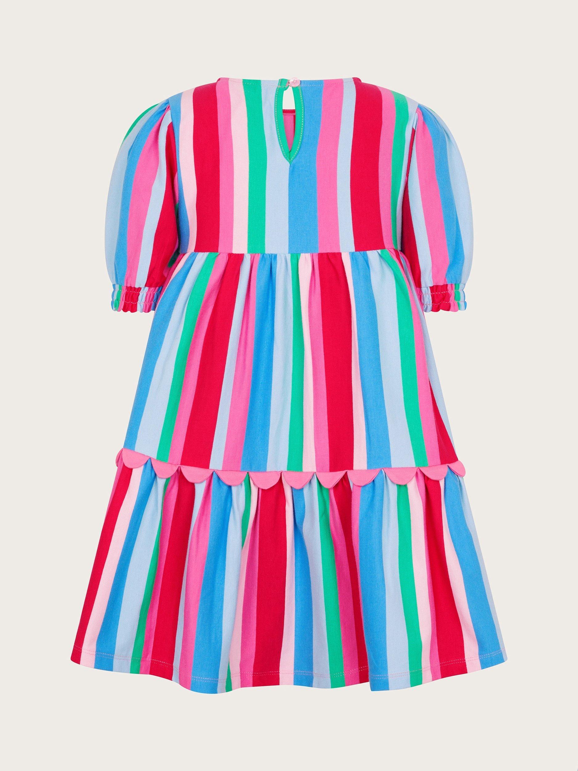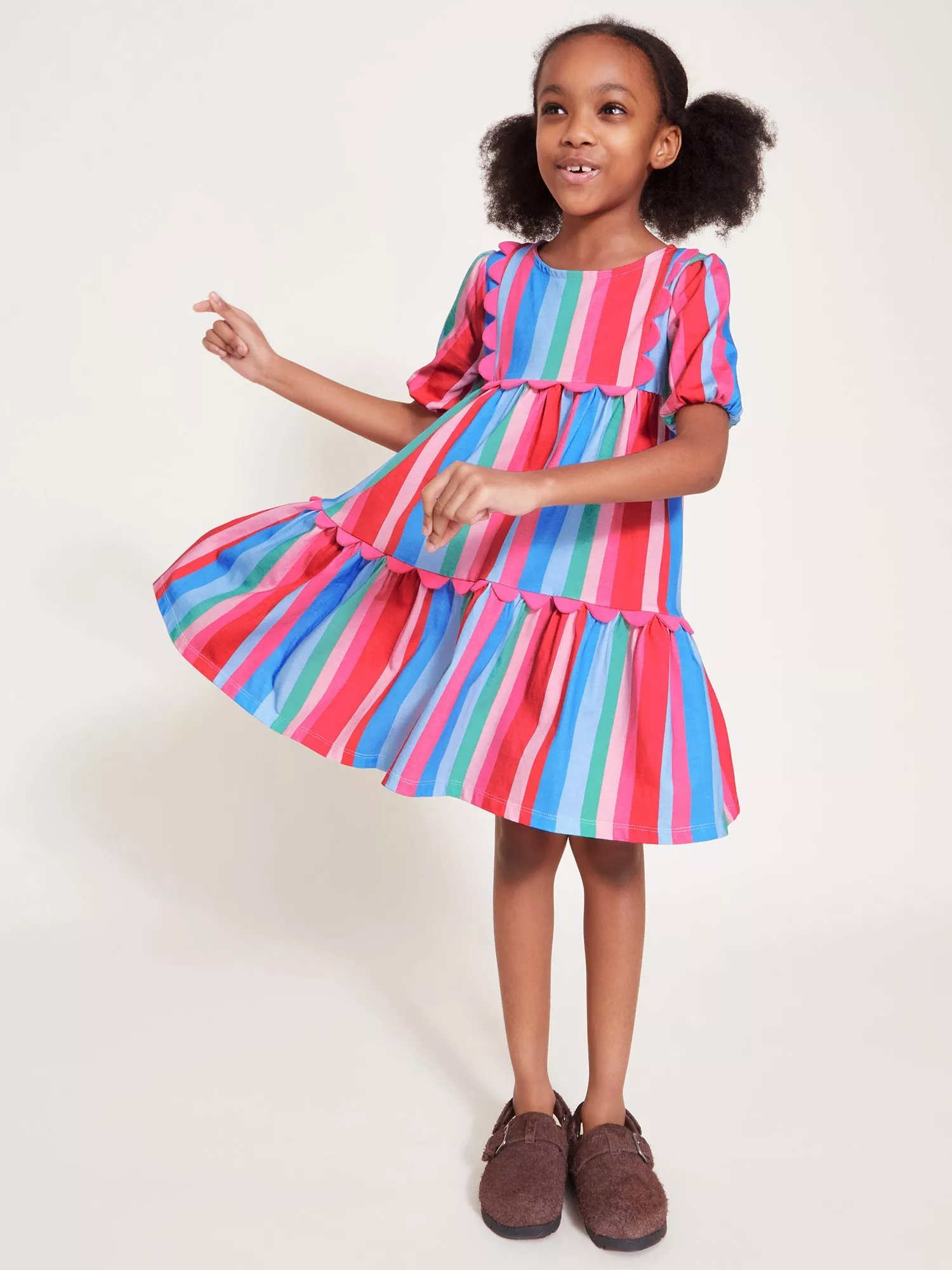 Be your own rainbow. This jersey dress features short cuffed sleeves and a knee-length tiered skirt. The colourful stripes run throughout the piece, with scallop detailing through the placket and tiered skirt. Fastens with a keyhole button fastening on the reverse.