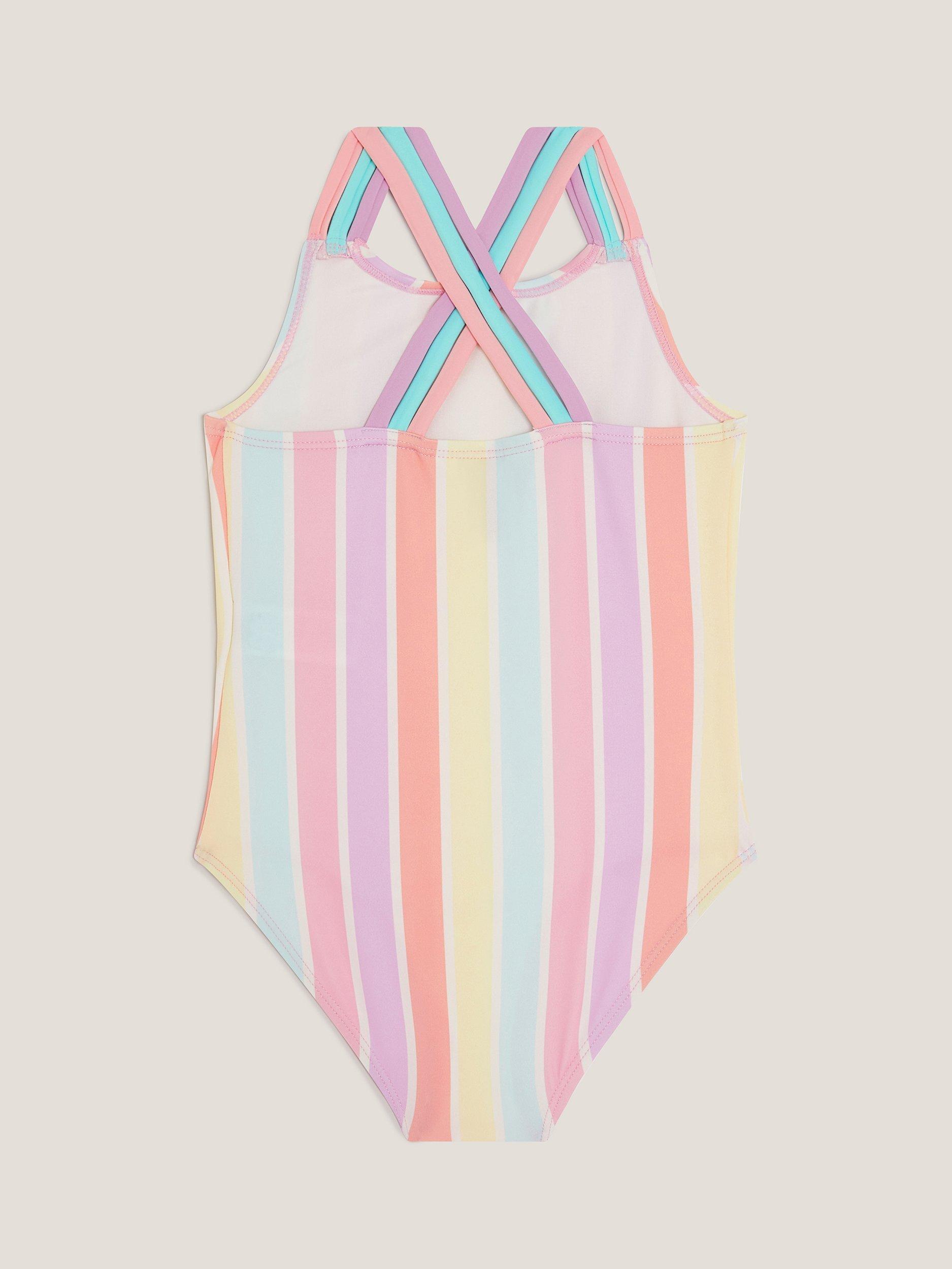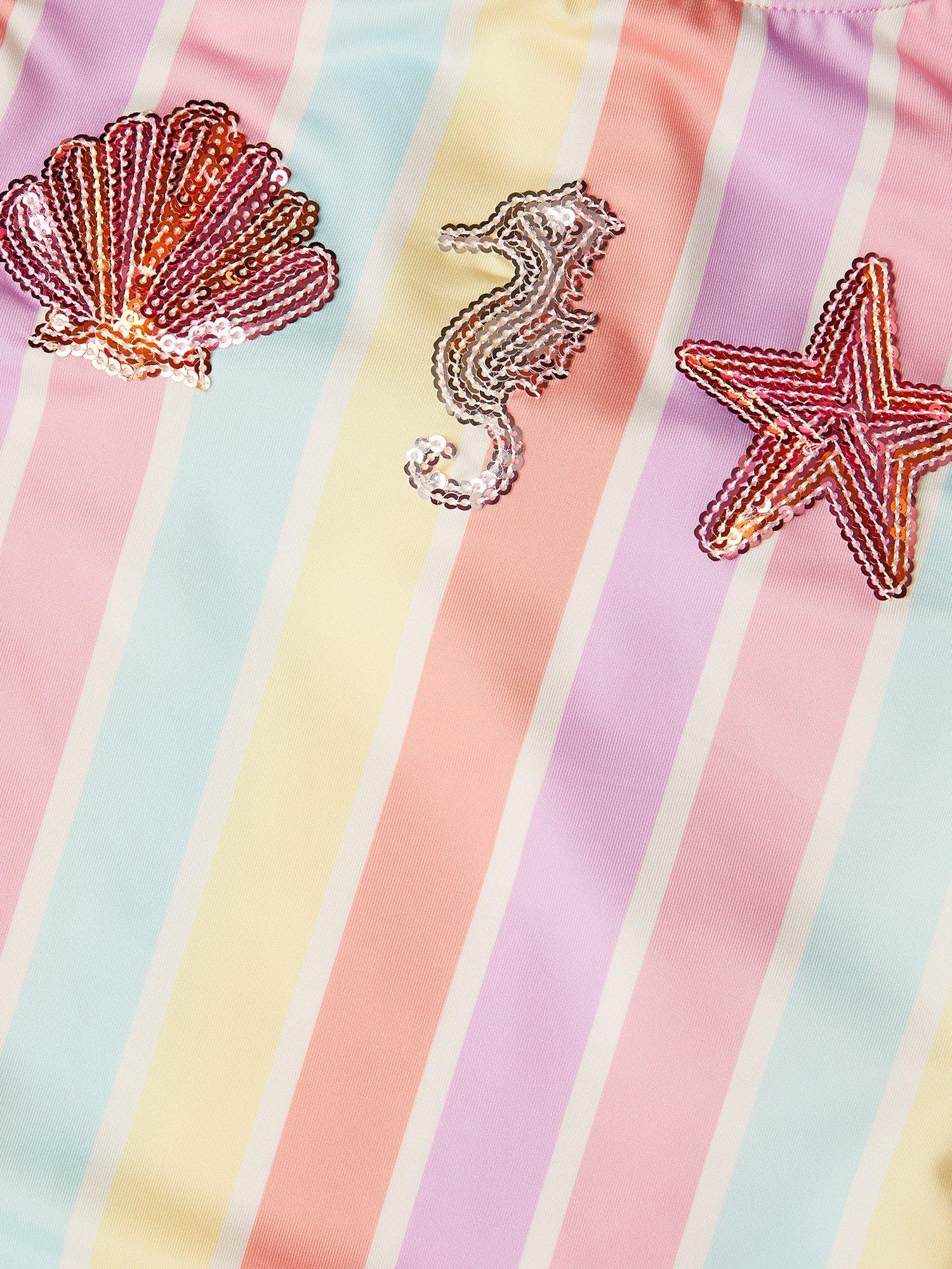 Striped with candy-coloured pastels, this one-piece swimsuit from Monsoon is embellished with sparkling under-the-sea friends through the front. Finished with cross straps over the back.