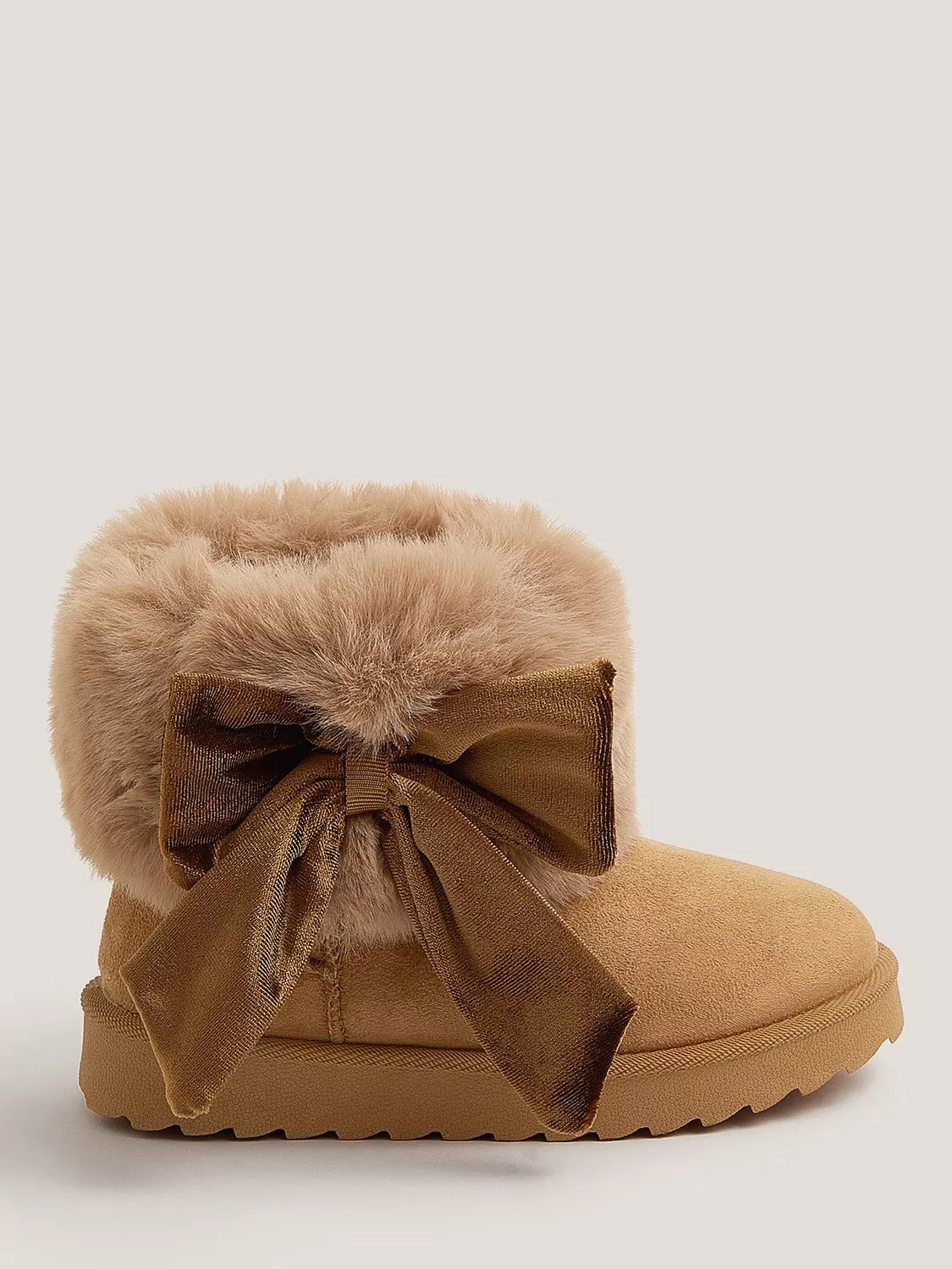 Keeping their toes toasty warm, these suedette boots feature fluffy cuffs and cute velvet bows. Finished with a snuggly lining and a slight flatform sole.