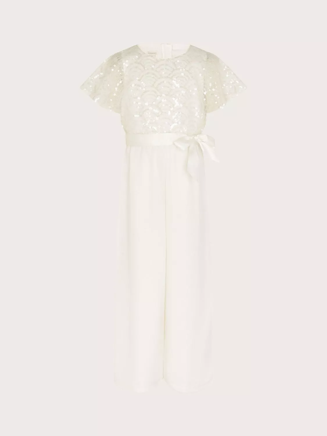 This is the perfect piece for a trendy bridesmaid or flower girl, this jumpsuit from Monsoon is finished with a tie belt and sequin detail. It features an embellished bodice, cape sleeves and a wide cut through the leg.