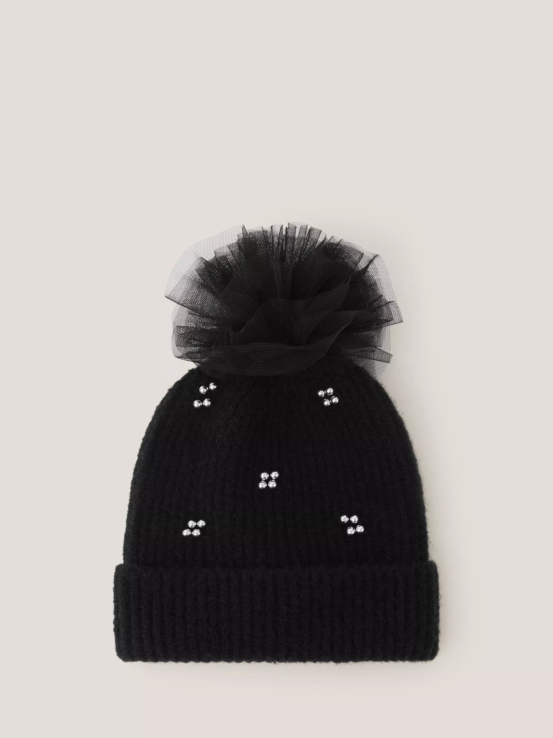 Guaranteed to keep them cosy, this chunky knit beanie features a tulle pom-pom top and classic turn-up brim. Finished with sparkly embellishments.
