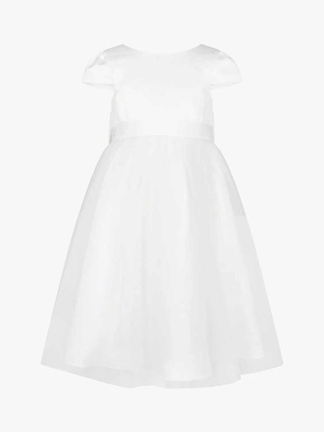 Ready to look the part, this enchanting bridesmaid dress will melt hearts. Featuring an exaggerated bow detailing to the back, this dress offers a round neck, short puff sleeves and a mesh overlay skirt. Pair with matching ballerinas and a floral headband for a polished look. Fastens with a concealed zipper to the back.