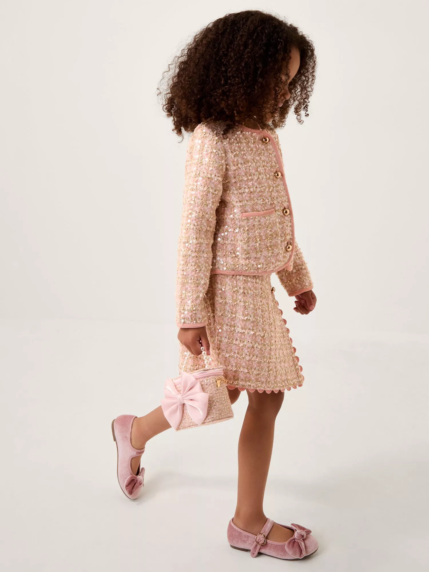 The perfect layer to go over all their summer looks, this tweed jacket is bedazzled with sparkly sequins in a dreamy pink finish. Complete with button fastenings.