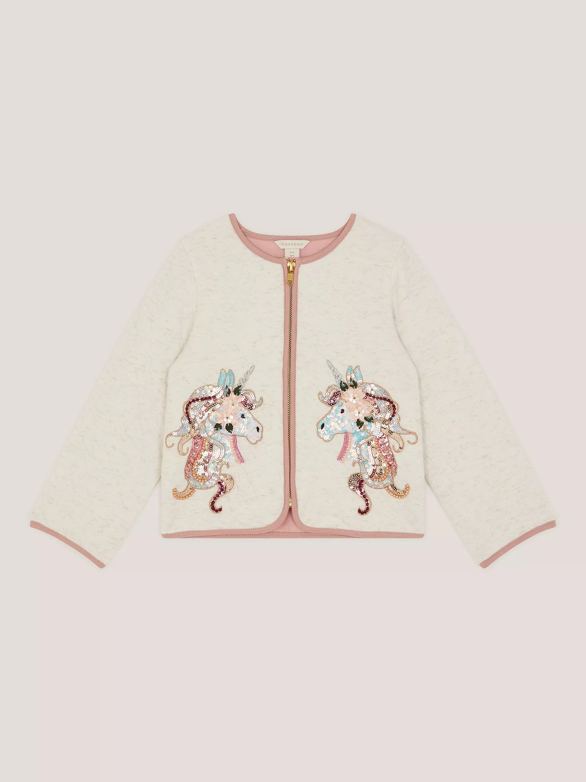 Designed in a bomber style, this jacket features sequin-adorned unicorns with a front zip fastening to finish.