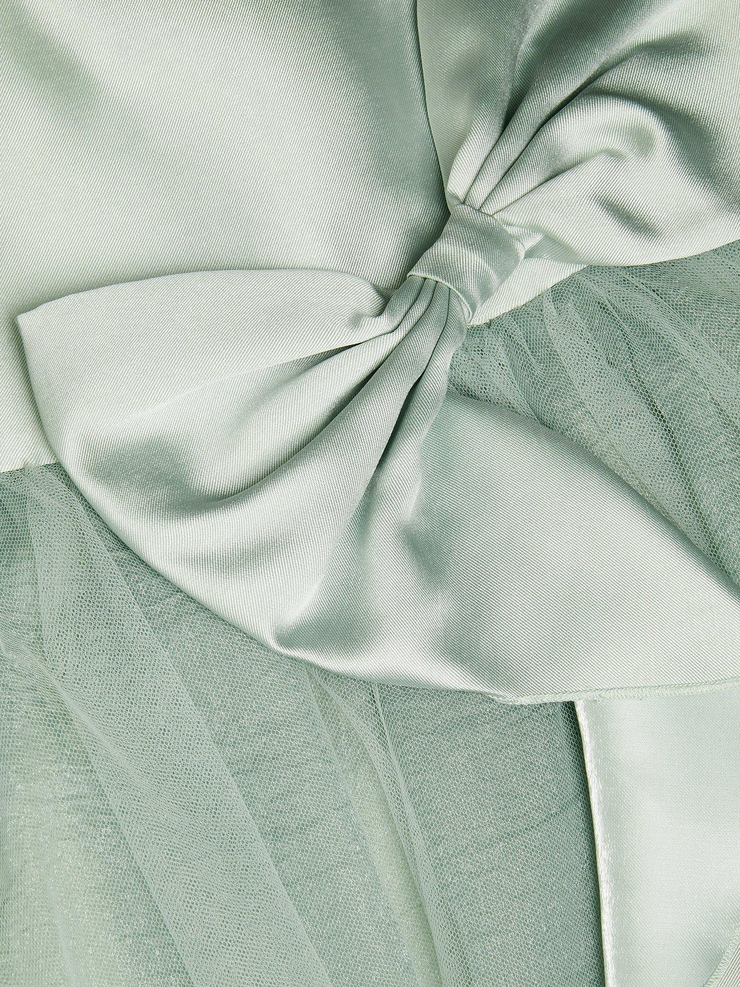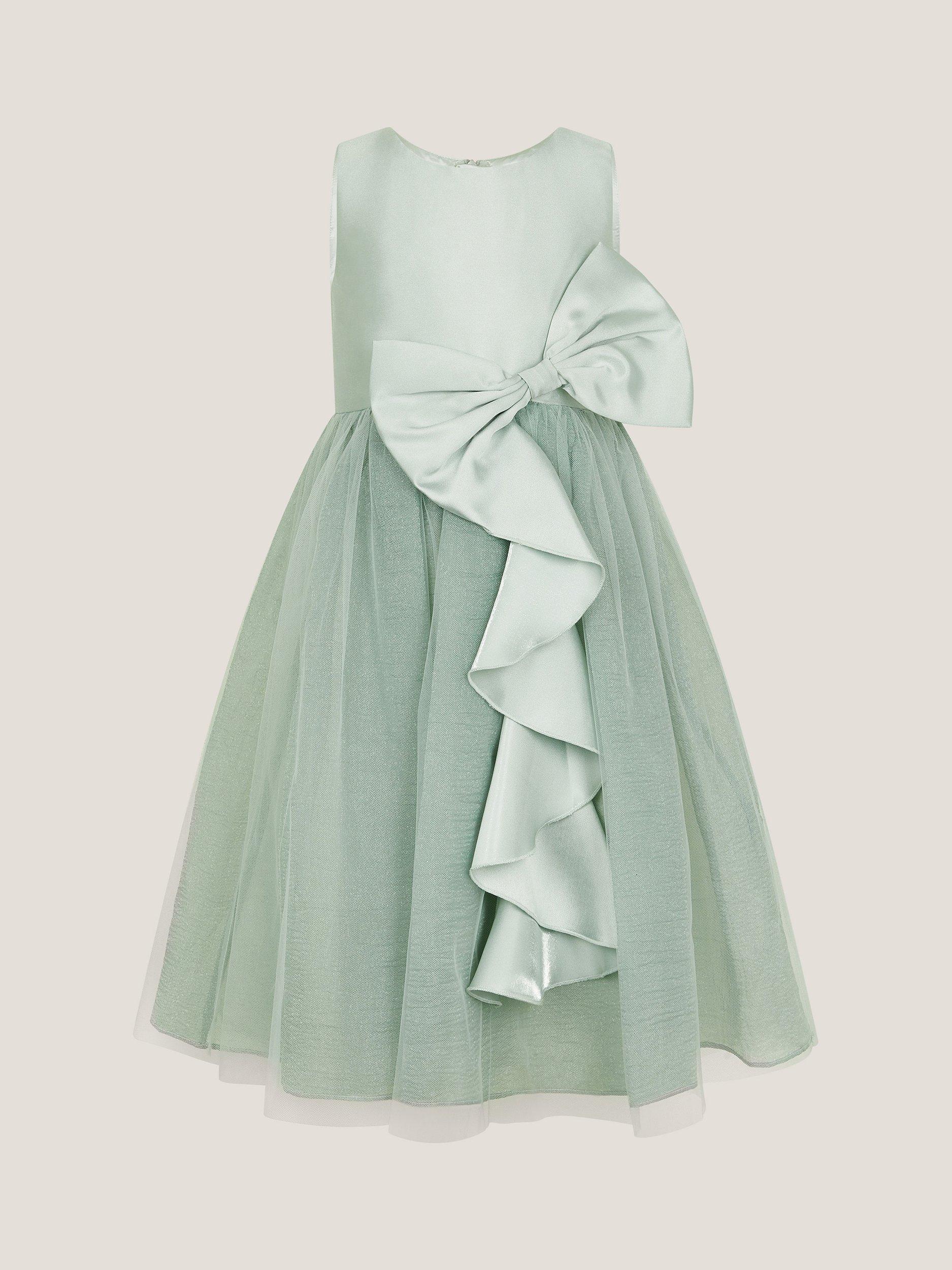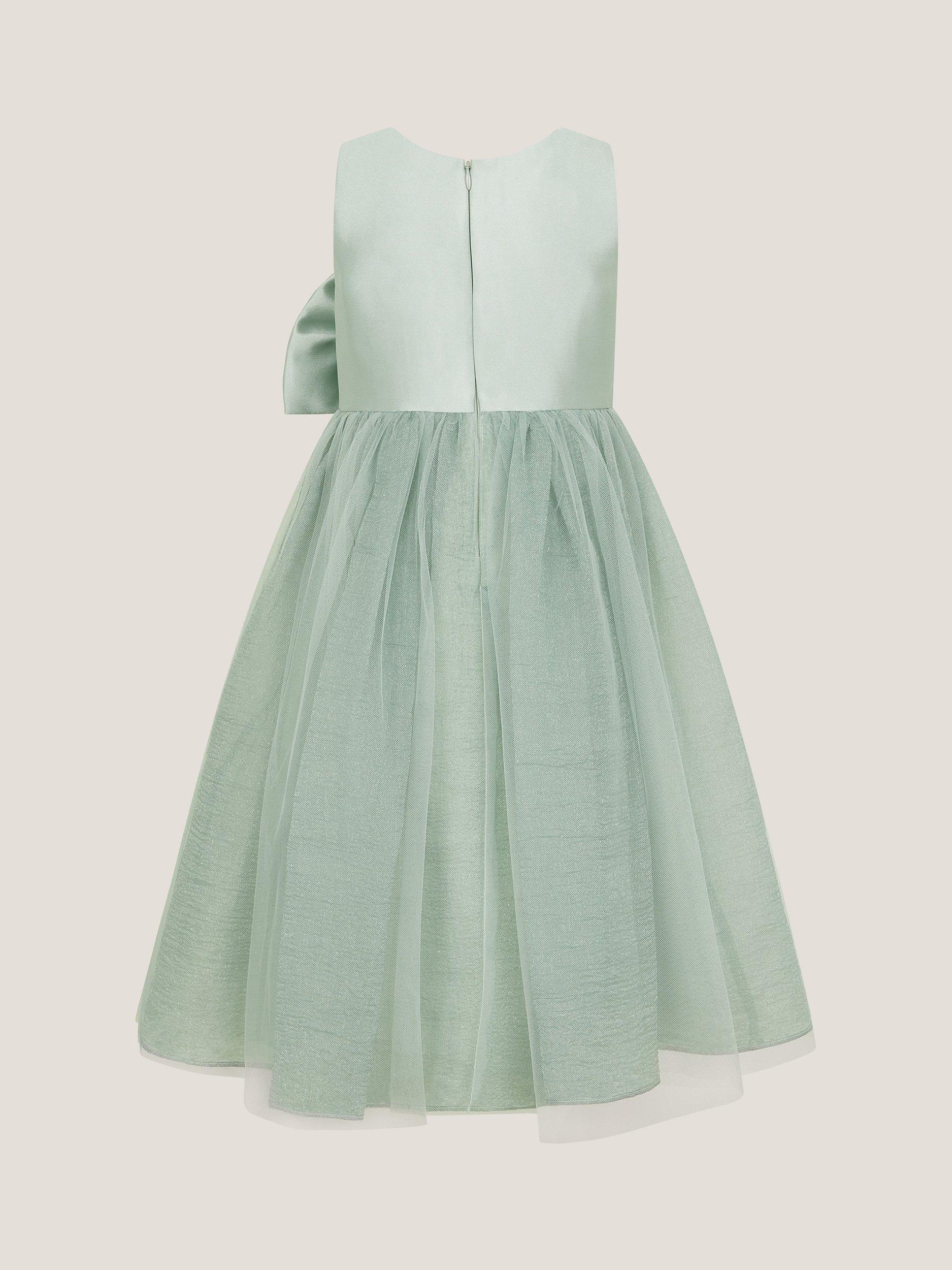 Designed with a tulle-topped skirt and a showcase waterfall bow, this eye-catching dress features a sleeveless bodice and flared skirt, secures with a zip fastening on the back.