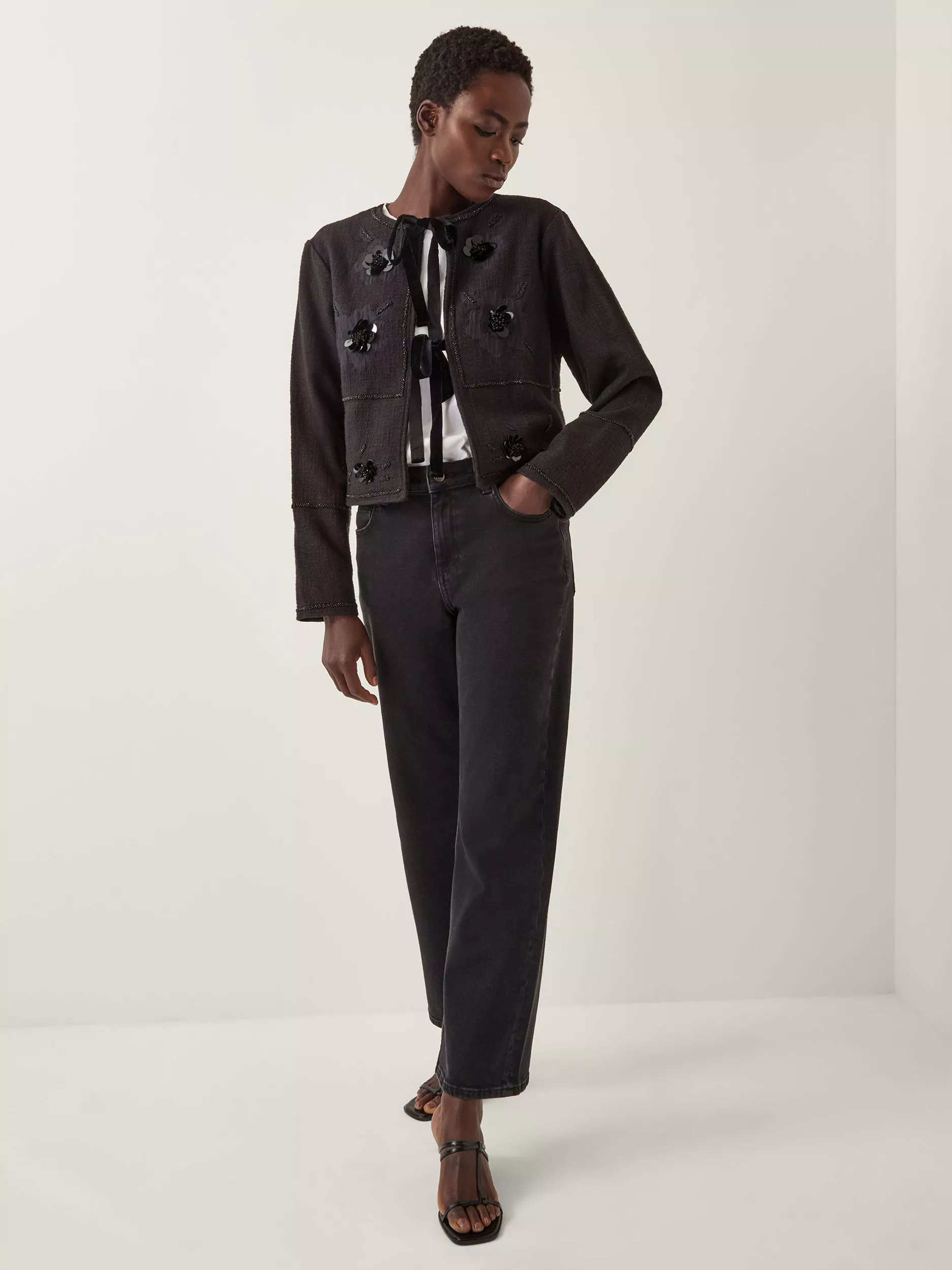 A velvet tie front jacket by Monsoon, crafted from breathable cotton for all-night comfort. Its embellished details add a spark to your look, for the ultimate party piece.