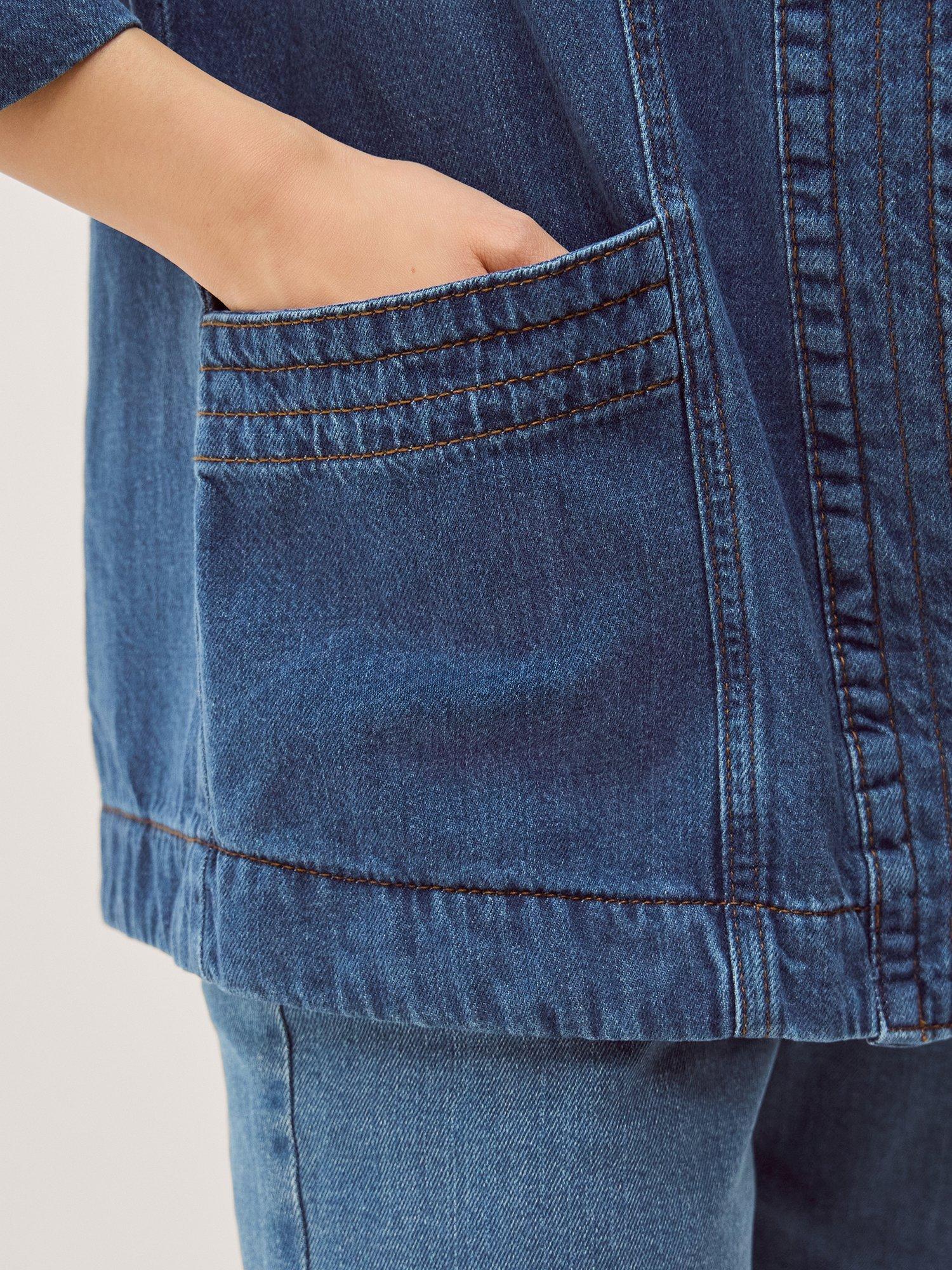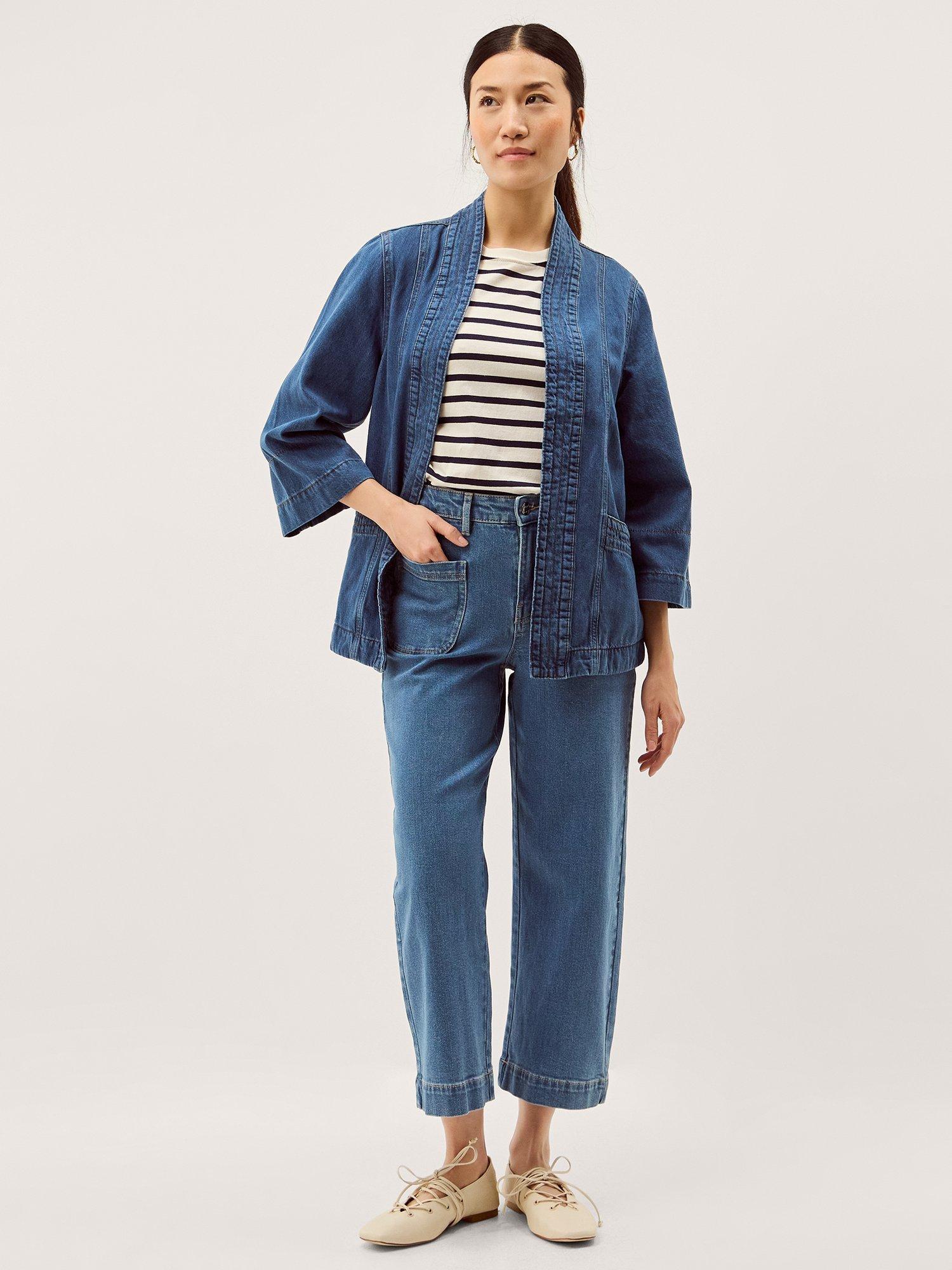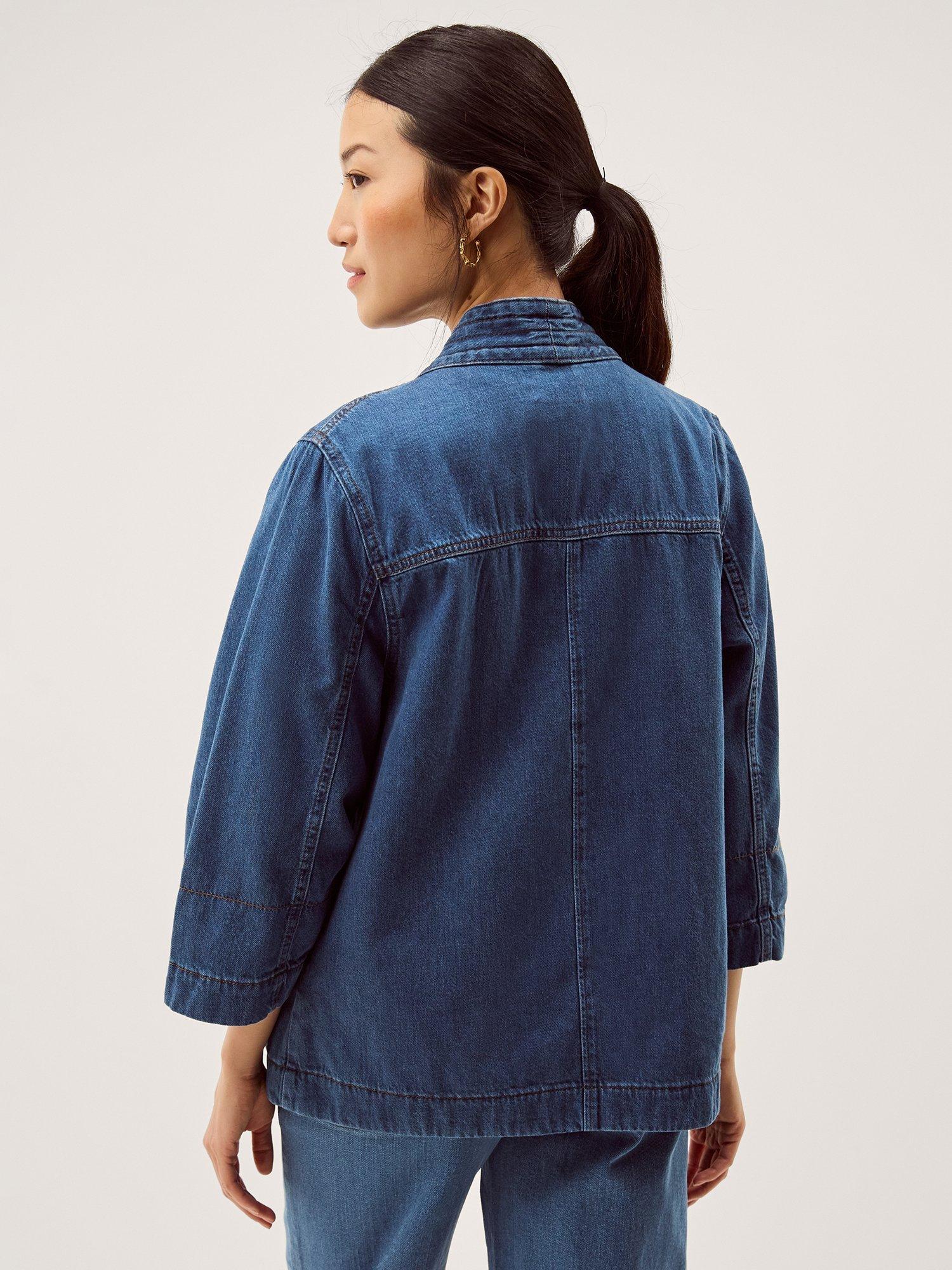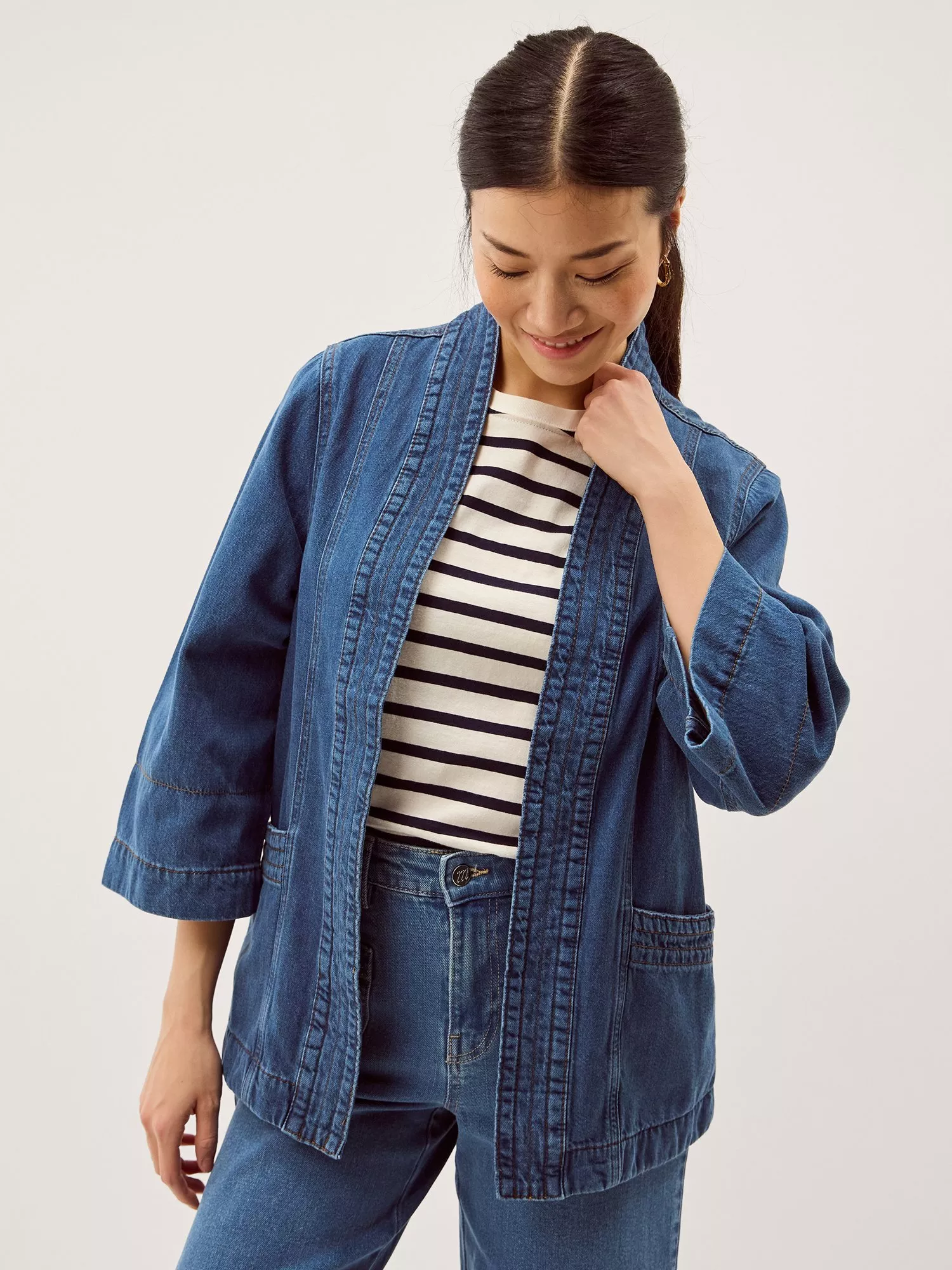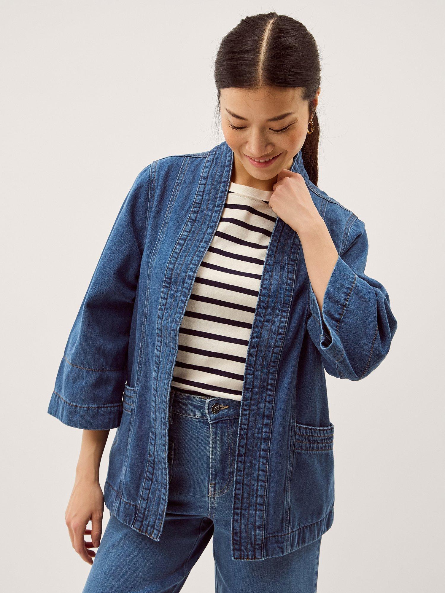 This regular-cut denim jacket brings easy charm to your daytime plans. Softly structured with three-quarter sleeves and an open neck, it lets you move comfortably and layer, serving practical style for every outing.
