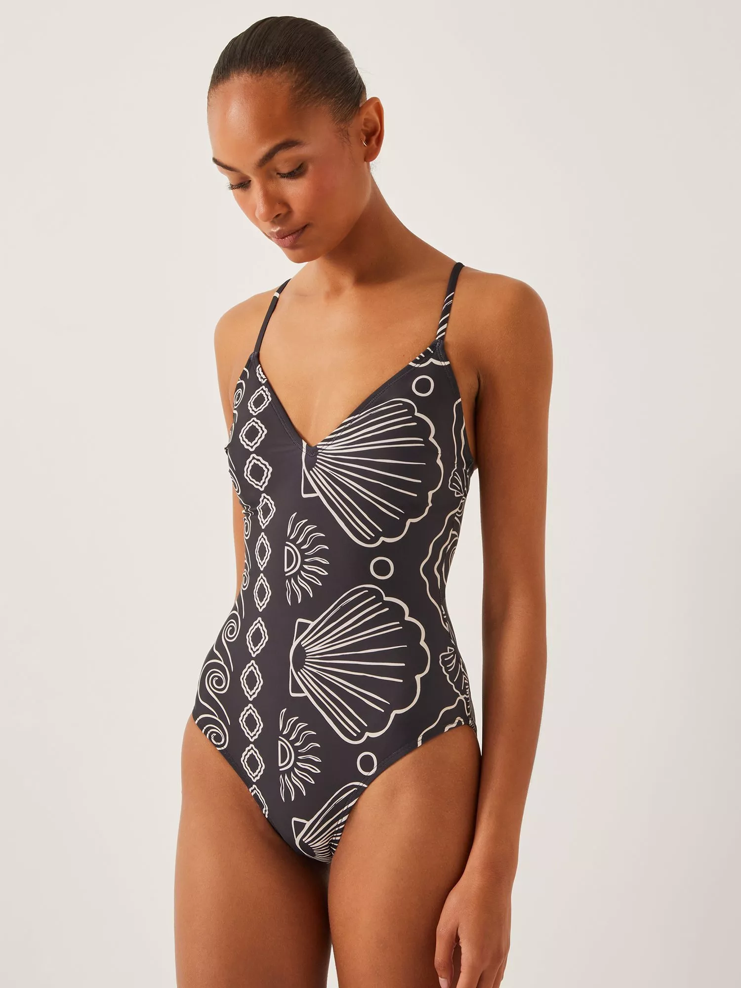 Take me to sunshine. Designed in neutral tones, this one-piece is splashed with a beach-inspired print for a decorative finish. Featuring a v-neck and clasp fastening above the scoop backline.