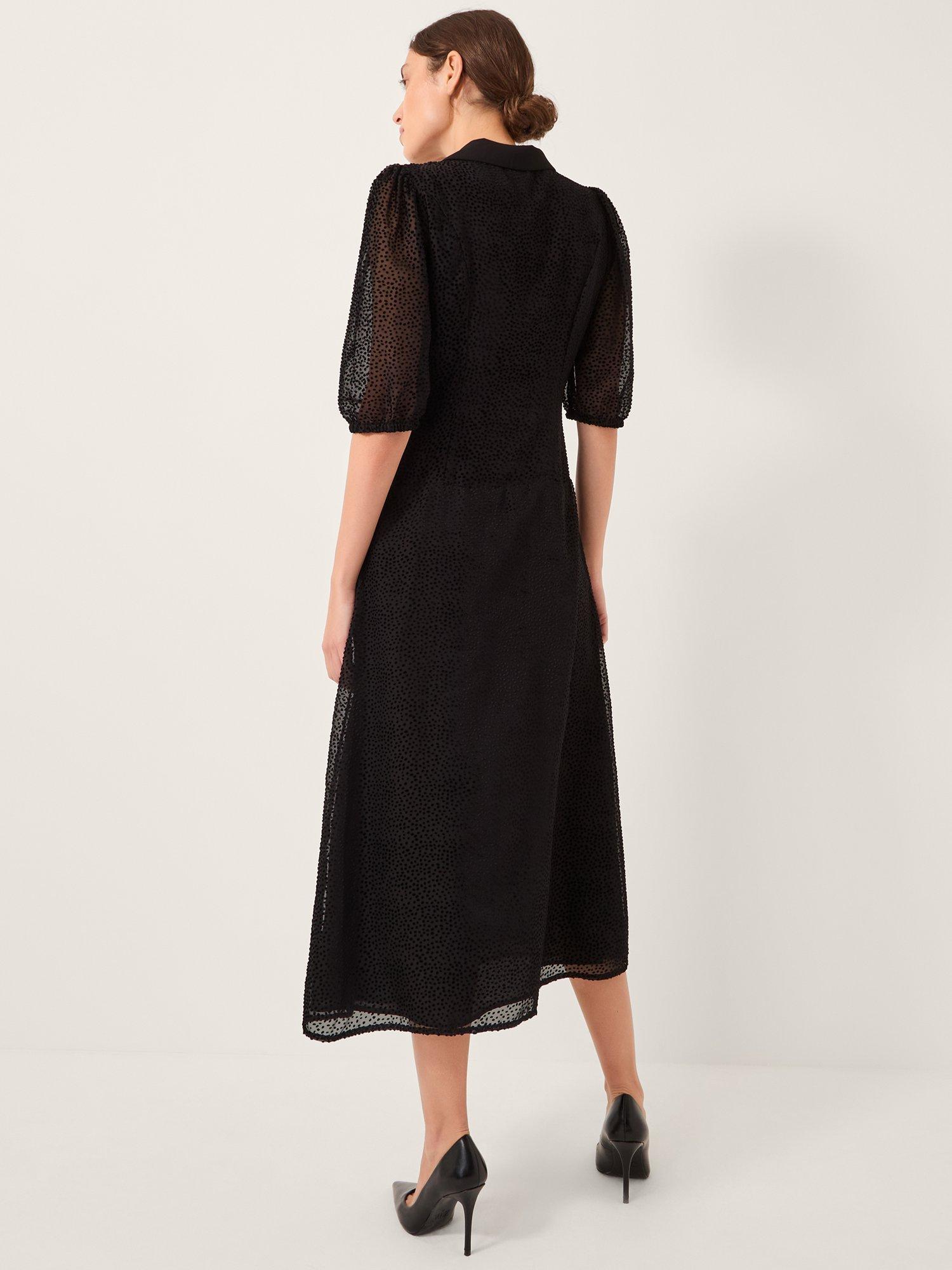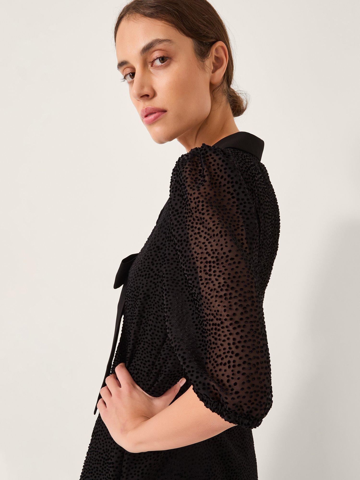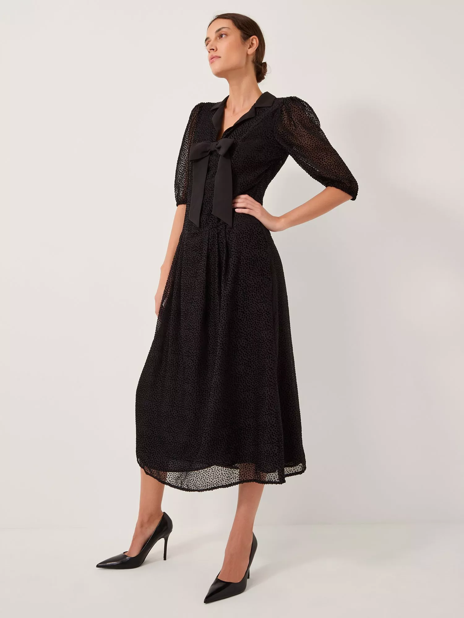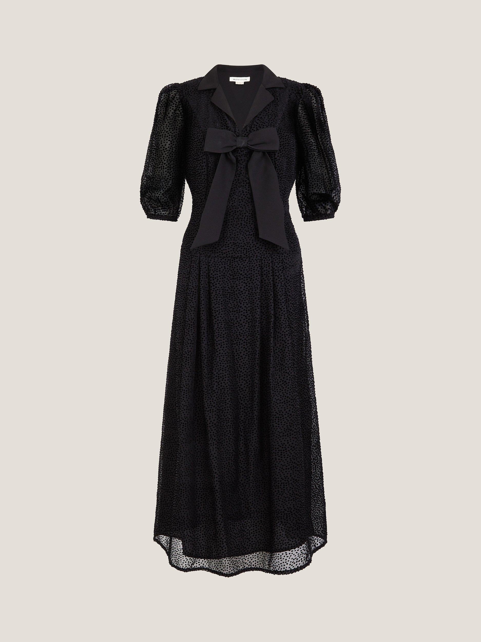 Crafted from sheer fabric with velvet polka dots, this midi dress exudes femininity. Finished with a collared neckline, short puff sleeves, and a statement bow to the front.