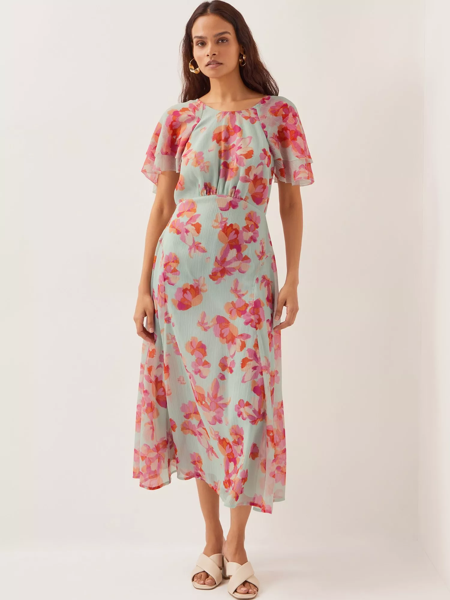 Prosecco, no-secco, this dress. Blossoming with sunset tones on painterly florals, this dress is ready to strut into wedding season. Built with gauzy angel sleeves, a midi-length skirt and cinched waist, pair it with faithful strappy heels for a special occasion finish.