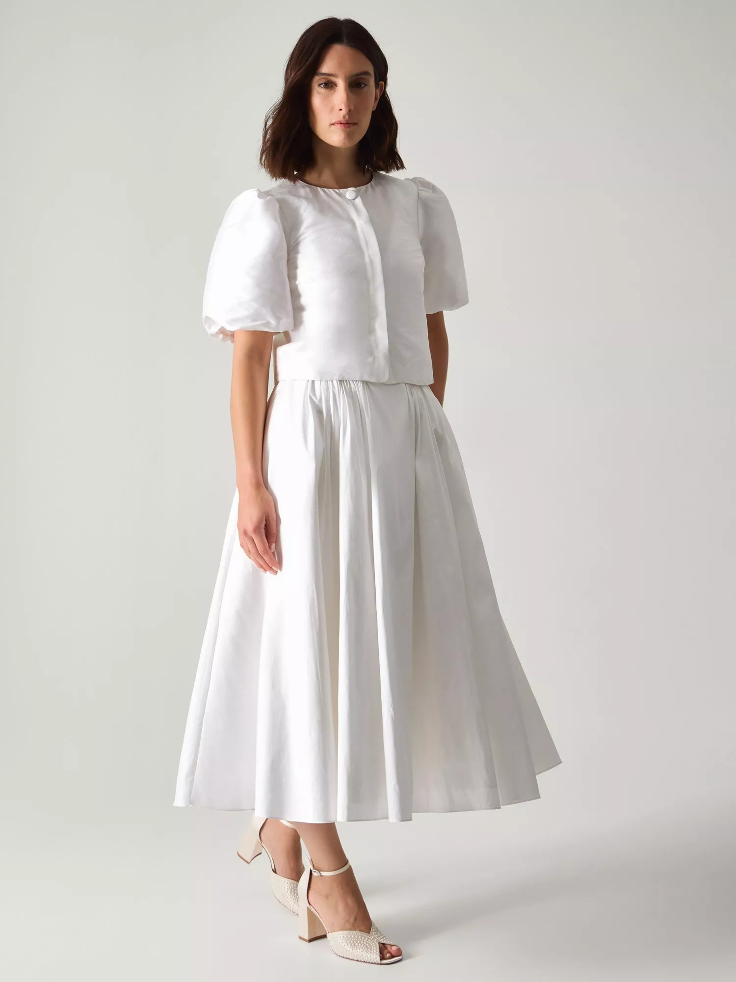 Elevate your wedding look with this cropped jacket. Its round neck and short puff sleeves offer a fresh take on traditional style, adding an elegant layer to your outfit while keeping you comfortable as you celebrate throughout the day.