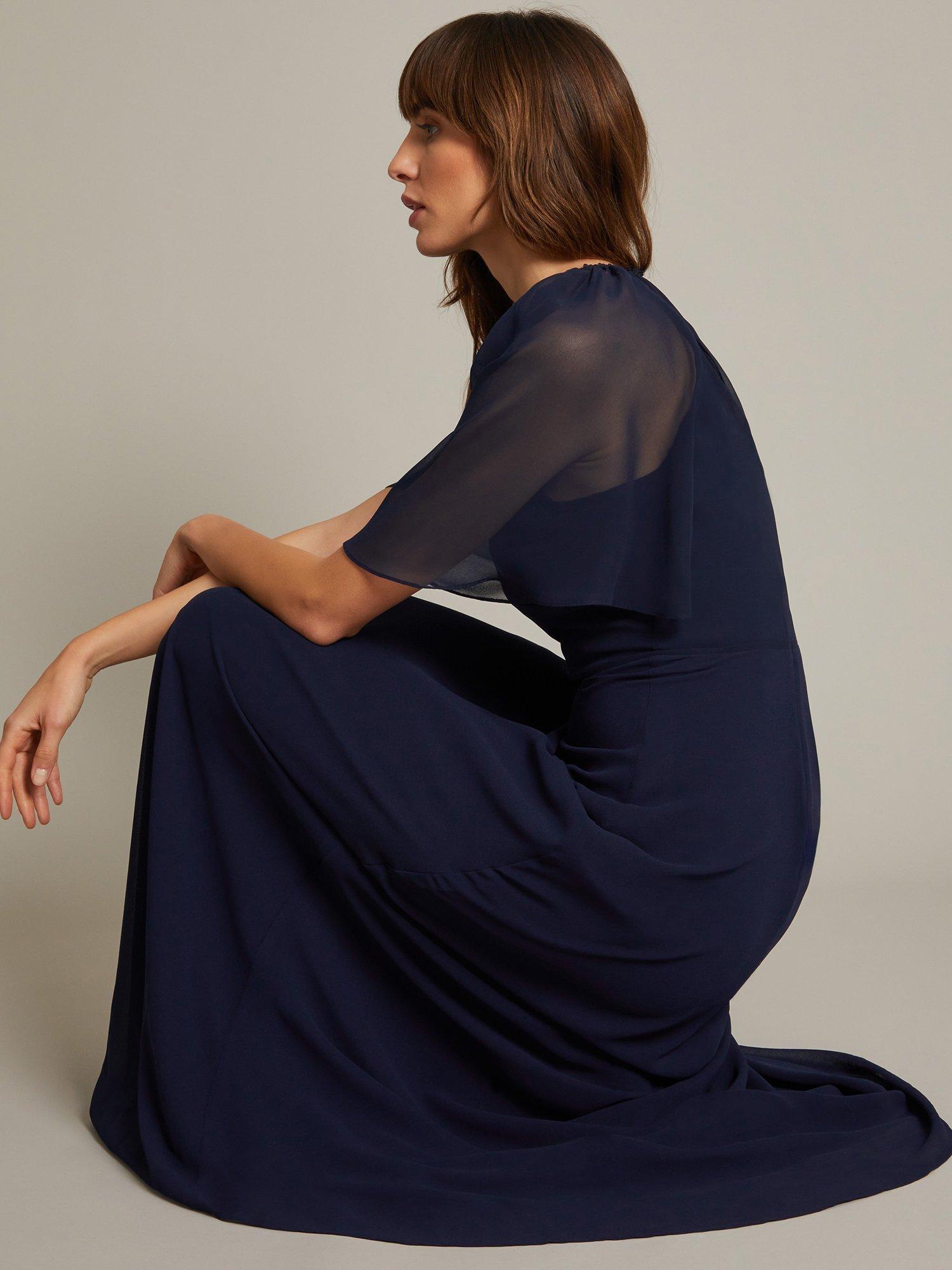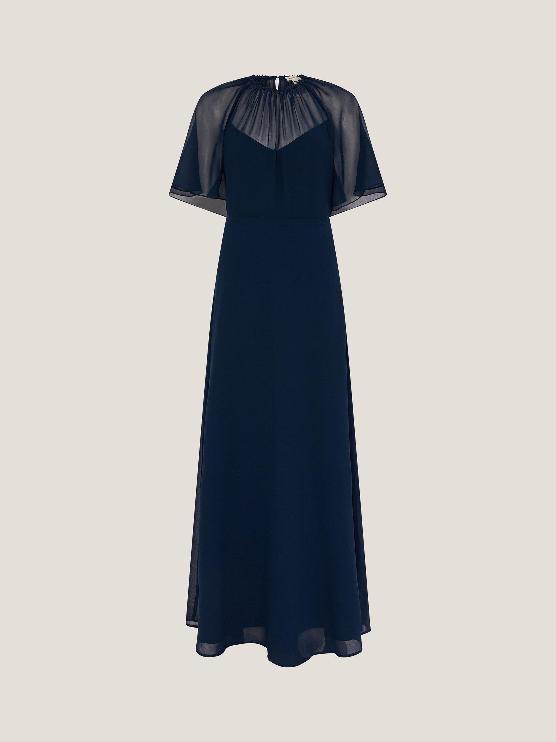 With a wear anywhere appeal, this floor-length dress from Monsoon is made from a lightweight fabric. Framed with a high neckline and short sleeves, this style needs no prints or accents to hold the spotlight.