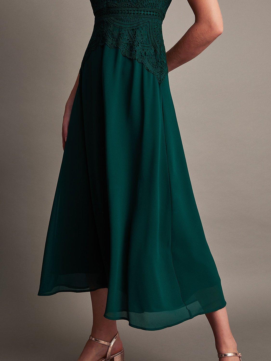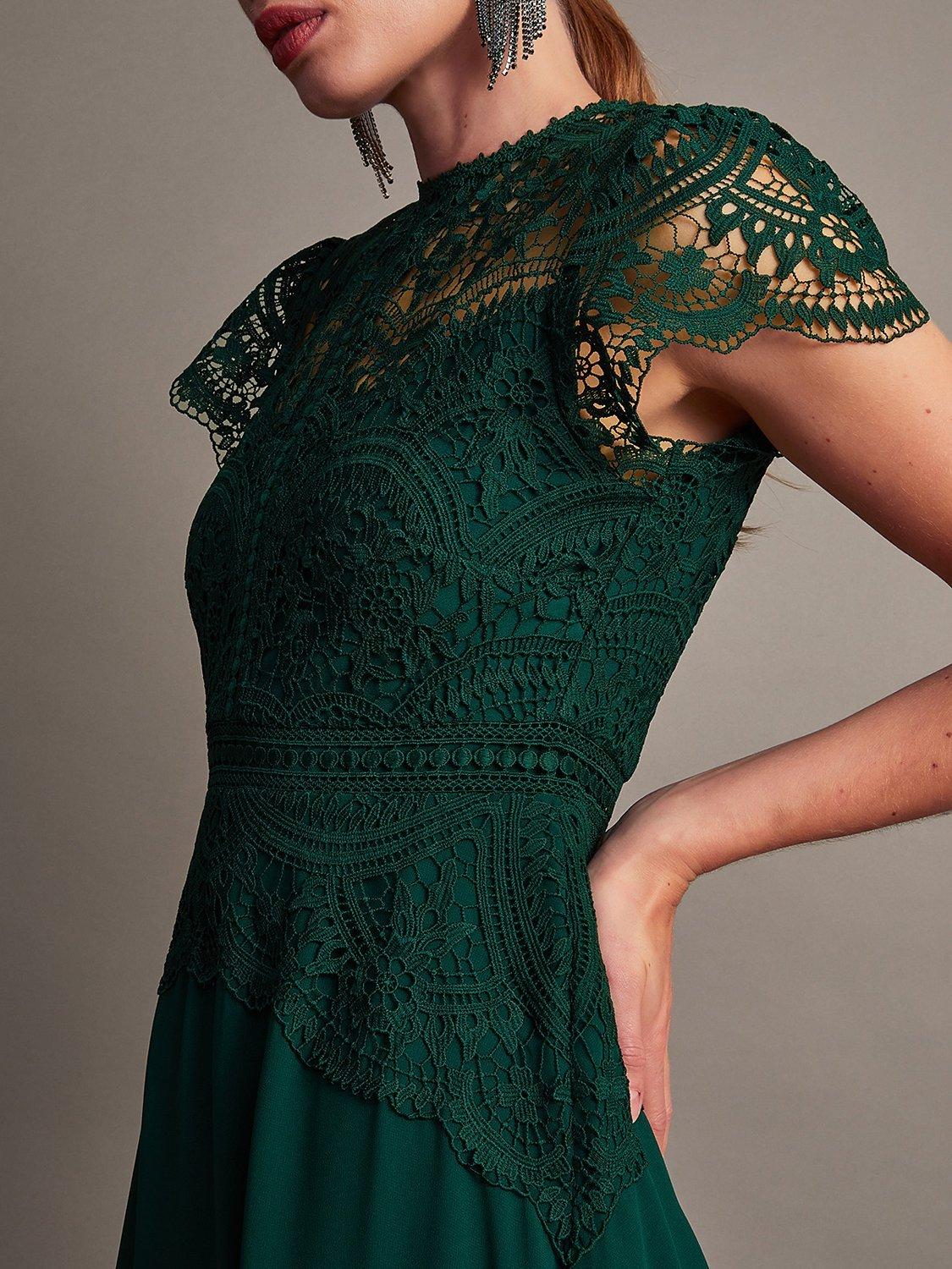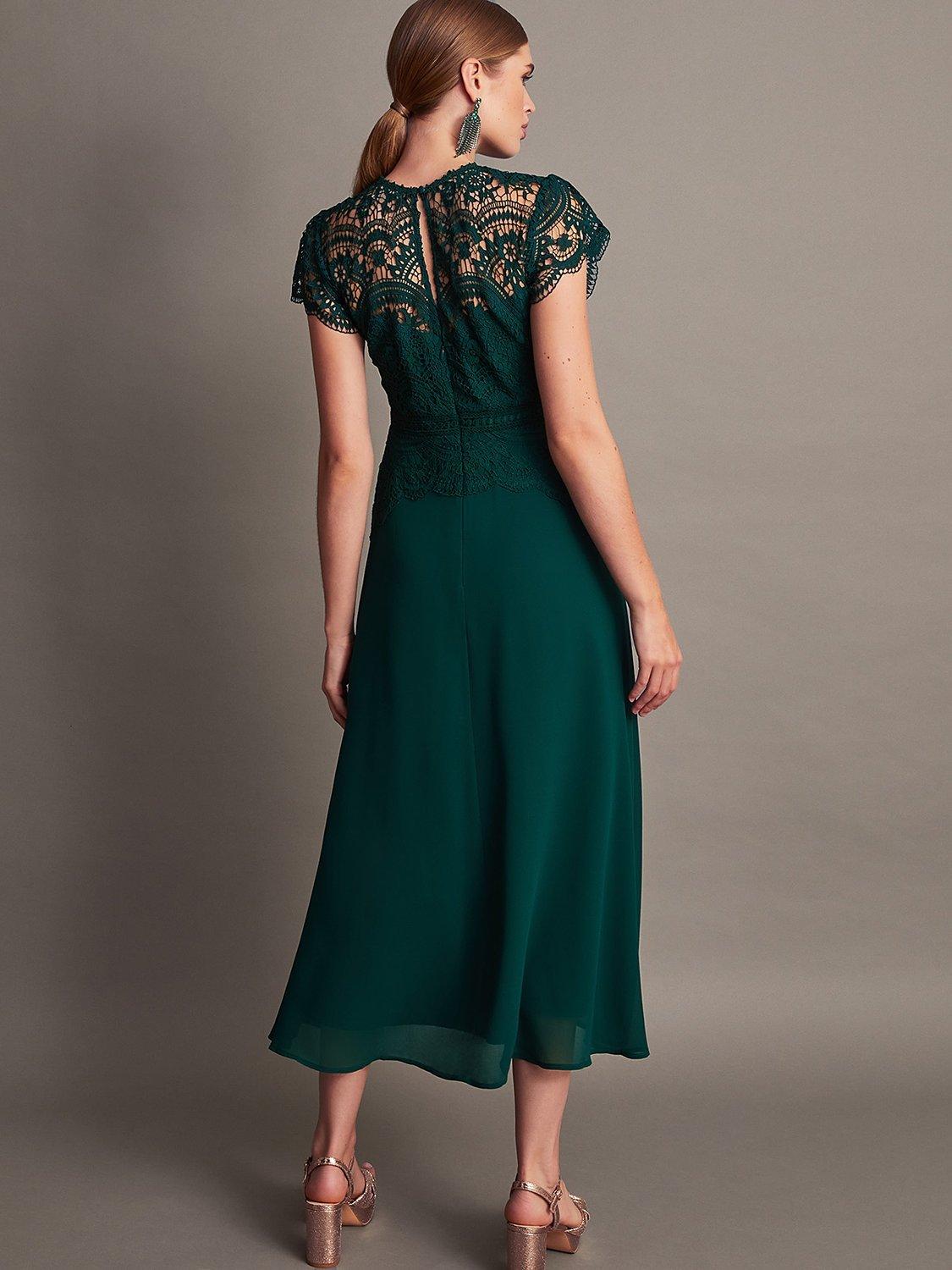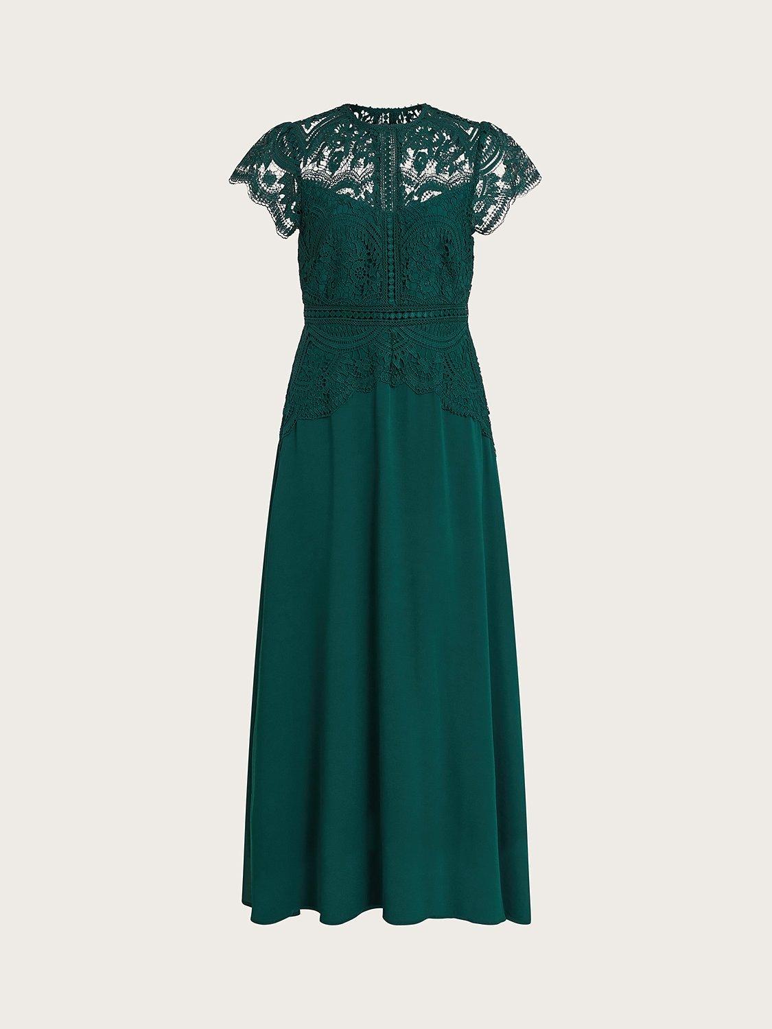Entirely flattering with its A-line shape and intricately embroidered lace overlay bodice, this mid-length dress from Monsoon is made from a smooth fabric carved with a round neck and cap sleeves. Pair with navy accessories to complement.