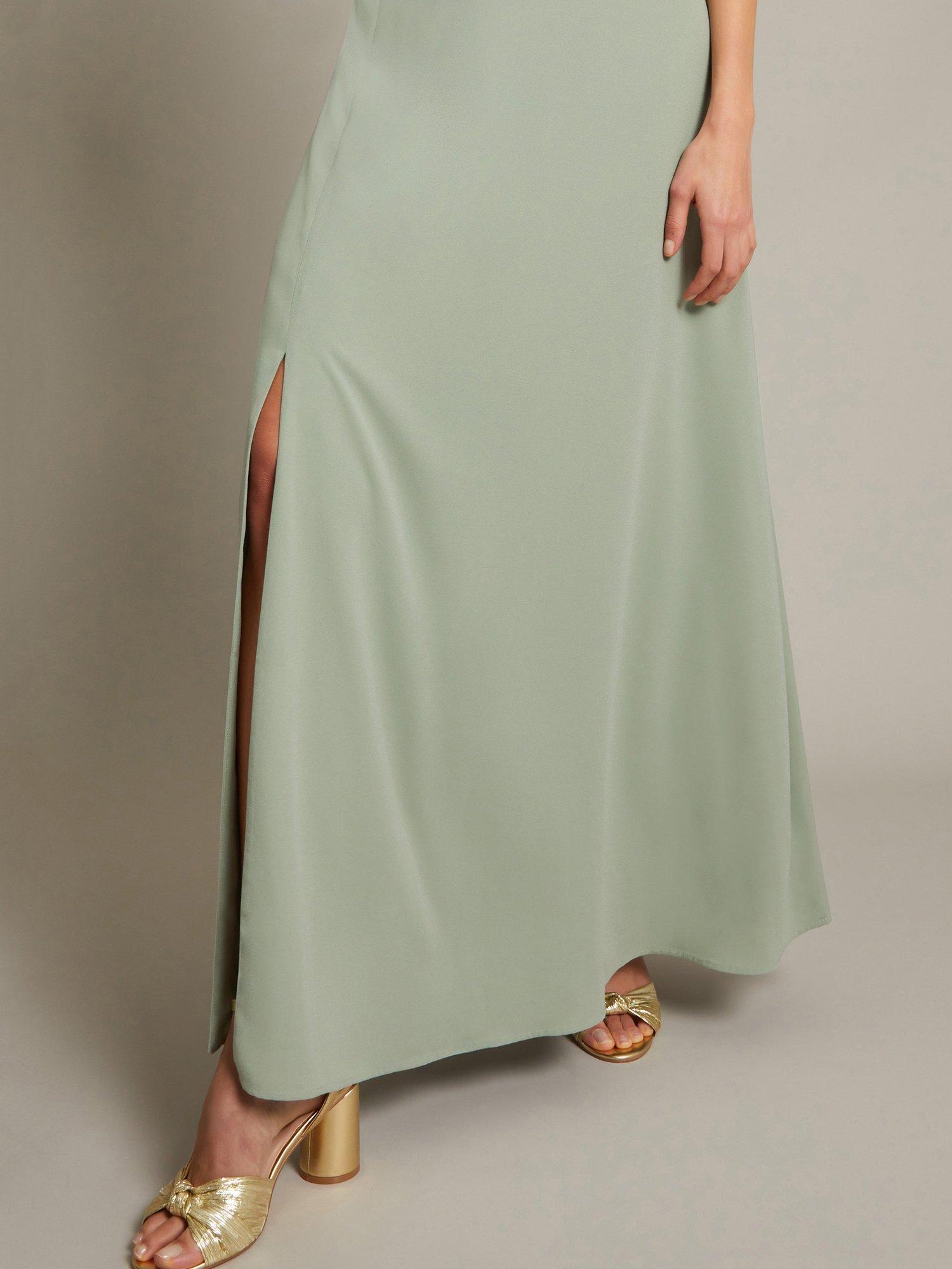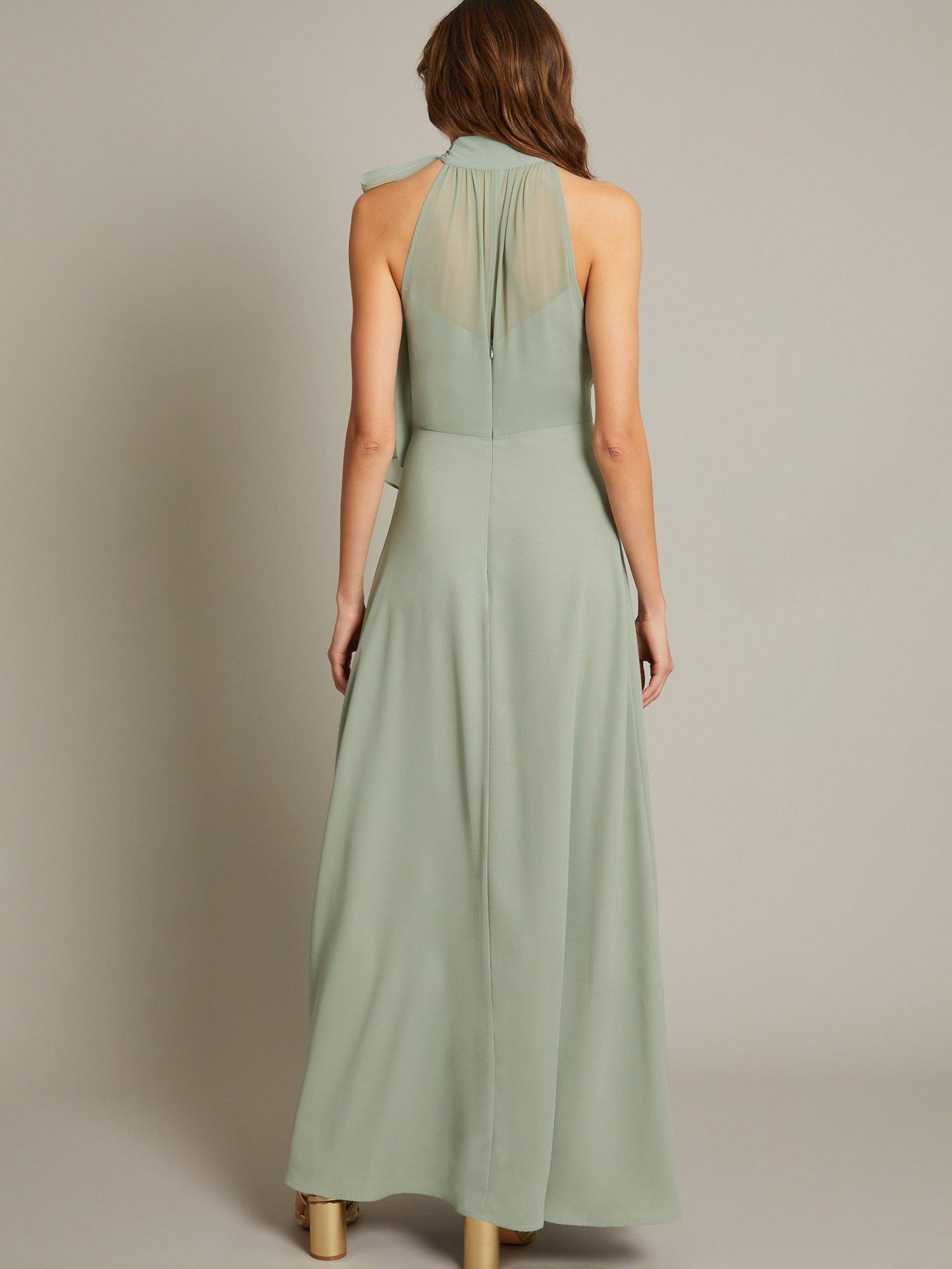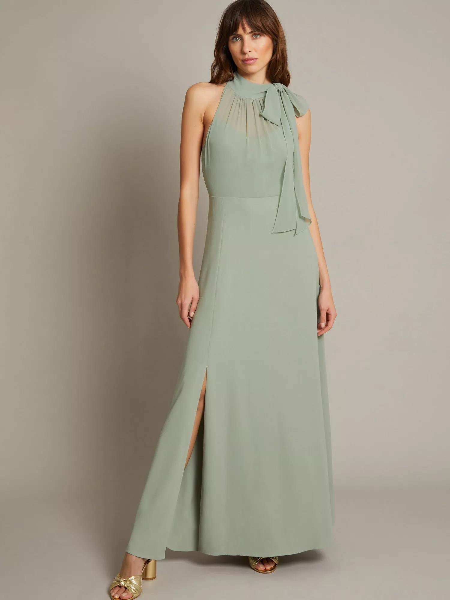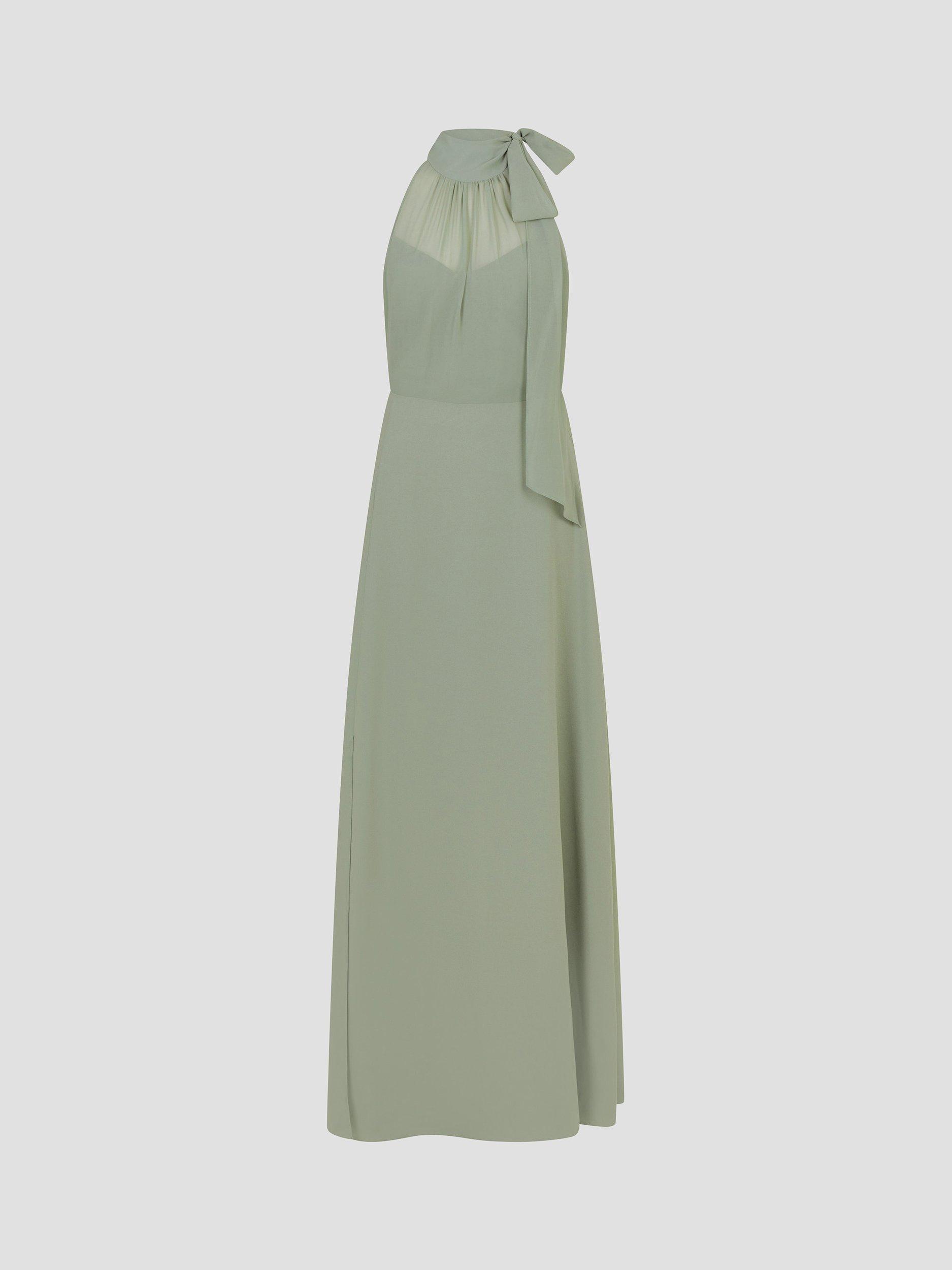 Your search for the perfect occasion dress just ended. Simply elegant, this timeless number is designed with a pussybow halter neck, figure-hugging bodice and side split running through the maxi-length hem. To finish? Sparkling jewels and strappy heels, of course.