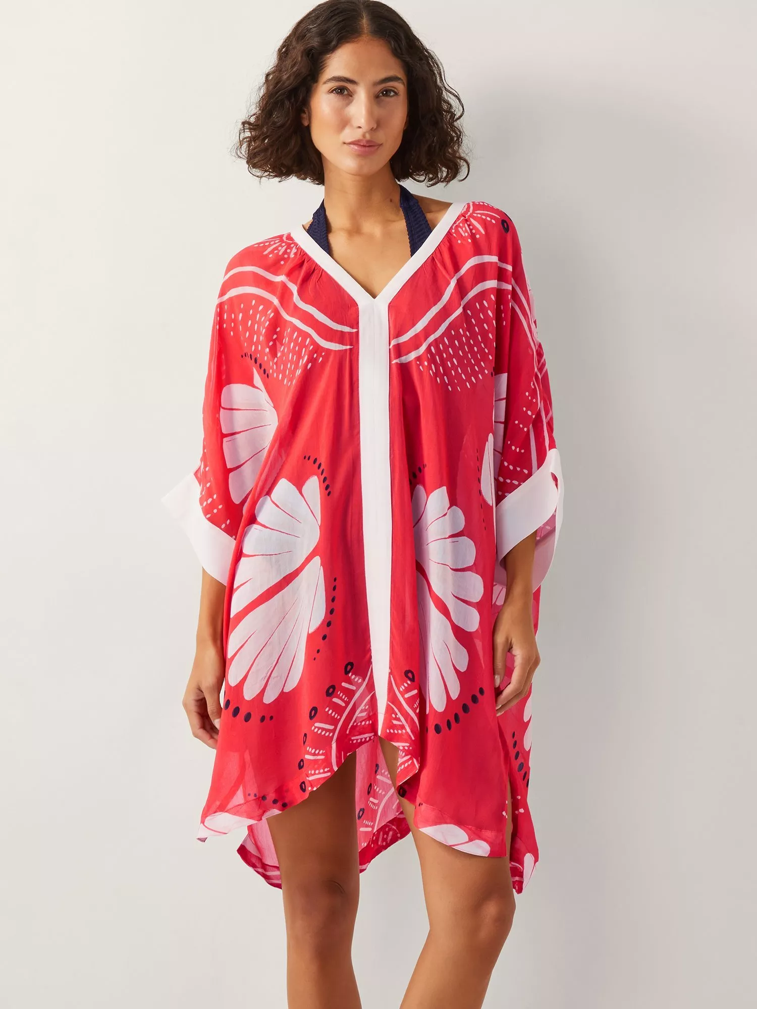 Going somewhere? Decorated with bold scallop shells and dot work designs, this kaftan looks best over swimwear or paired with breezy linen trousers. Finished with a v-neck, draped sleeves and mini-length hem.