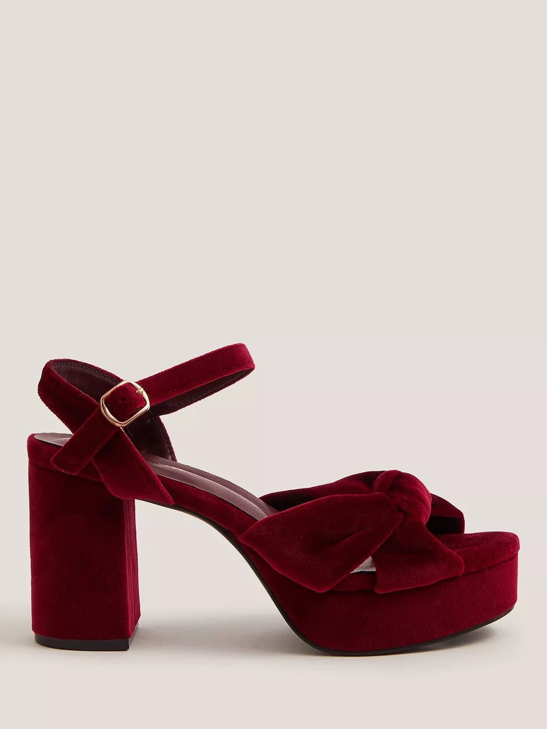 Adding new heights to your night-out looks, this luxe velvet pair feature an open toe design, chunky block heel and platform soles. Fastens with a buckle strap around the ankle.