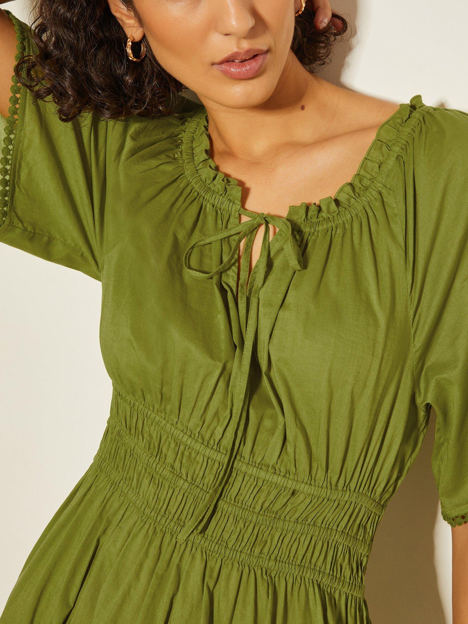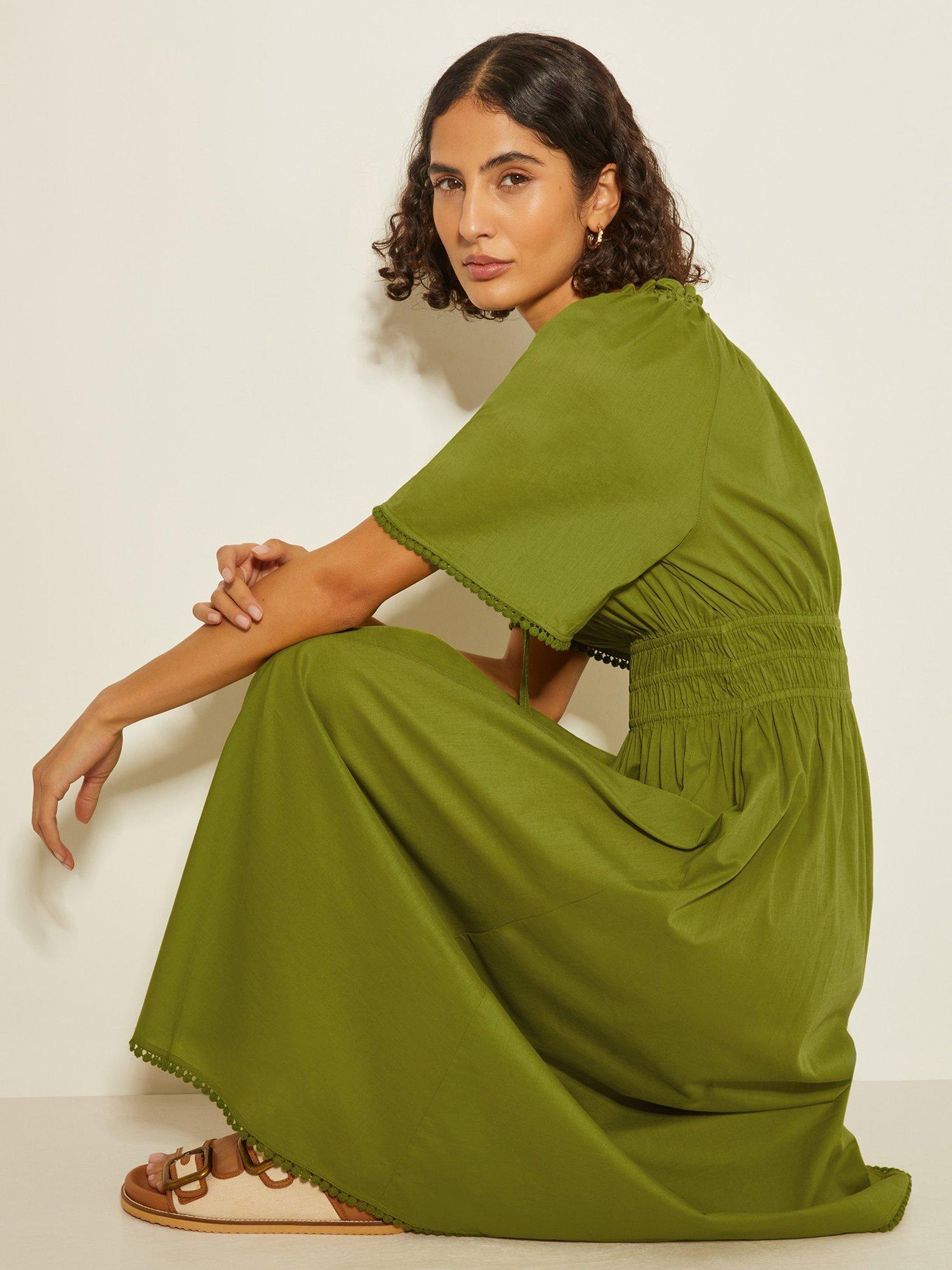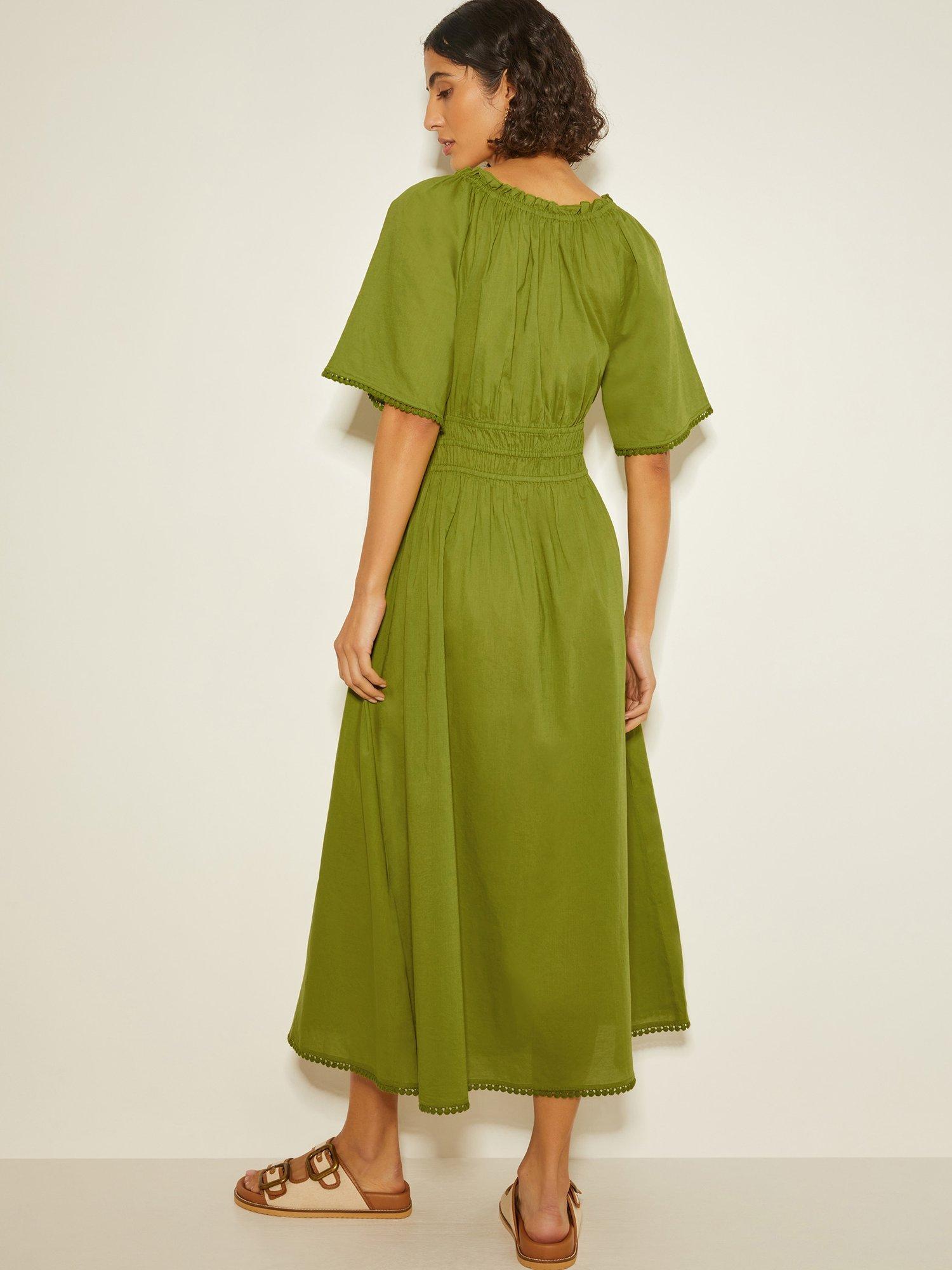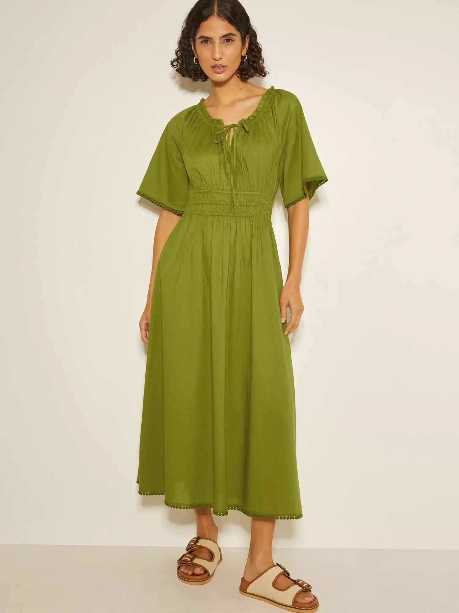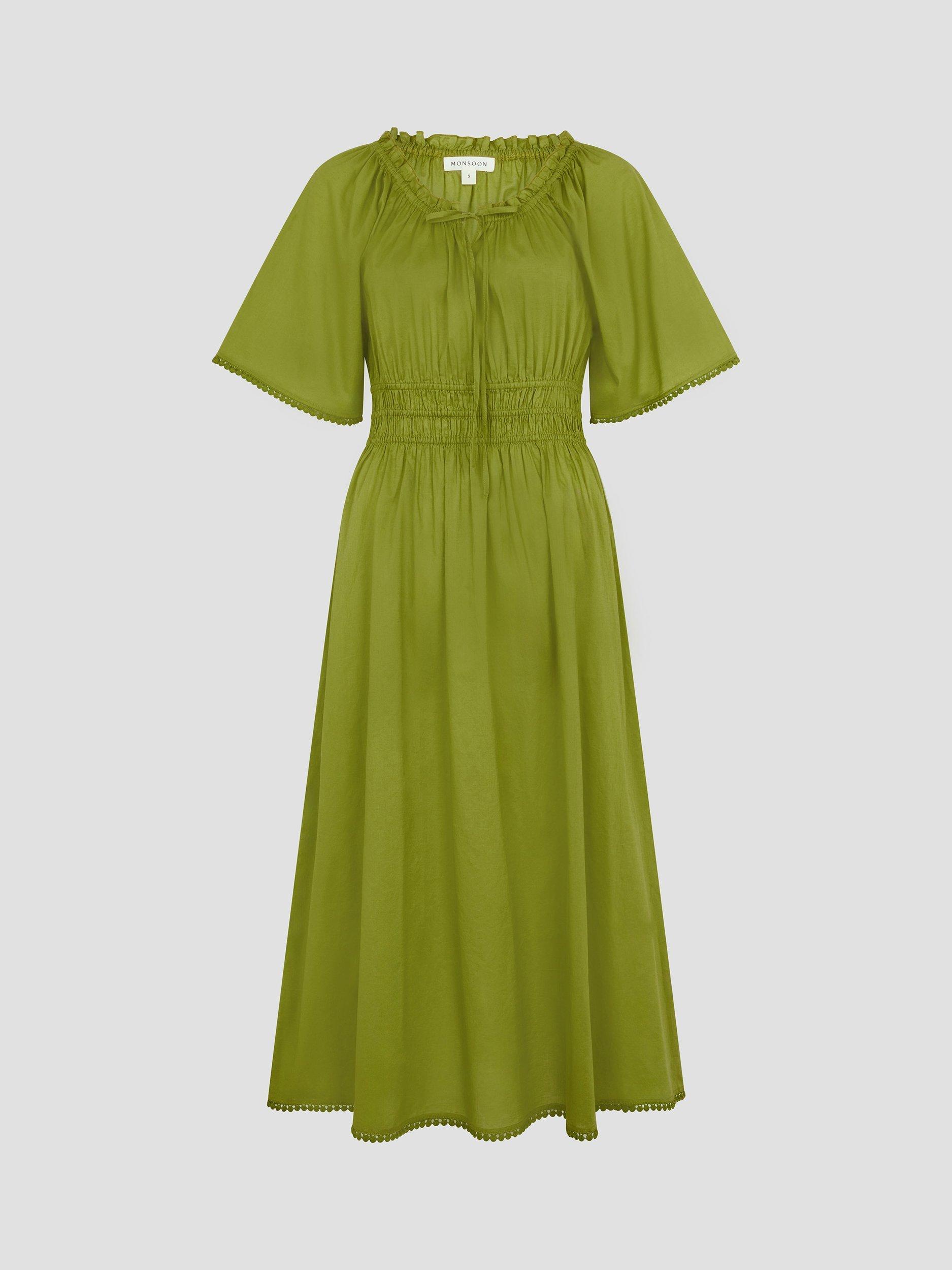 Must-have midi. A sunny-weather staple you need in your wardrobe. Not only does it have short, floaty sleeves, a comfy elastic waist and cute pom-pom trim, this midi dress is cut in a breathable cotton fabric, so you can keep cool whilst looking oh-so chic.