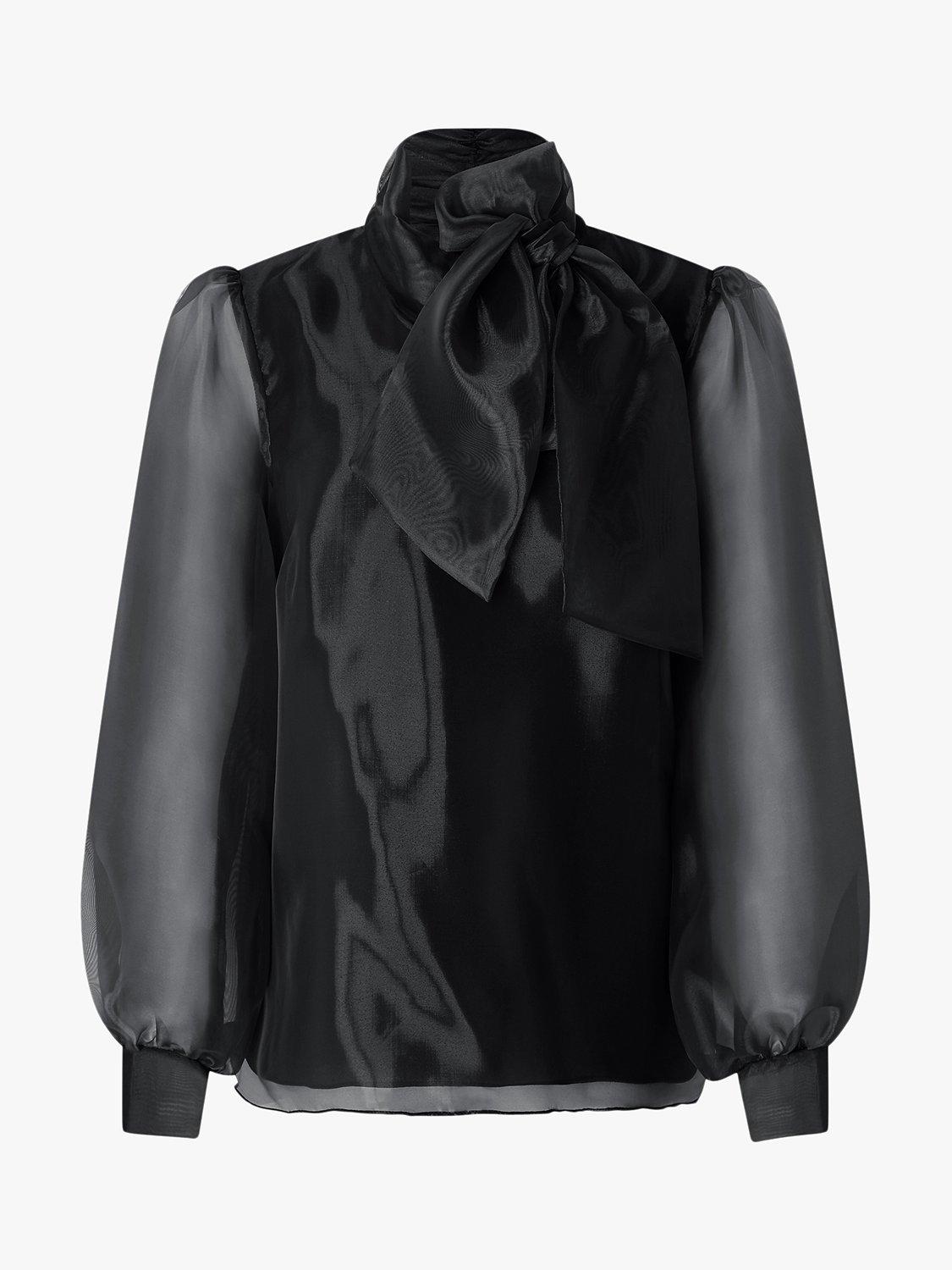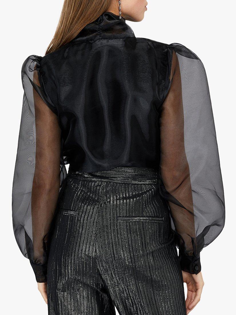Made with a softly lined bodice for easy wear, the sheer organza overlay is fashioned to a dramatic silhouette that wears well tucked into high waisted trousers and stiletto heels for a striking ensemble at your next event.