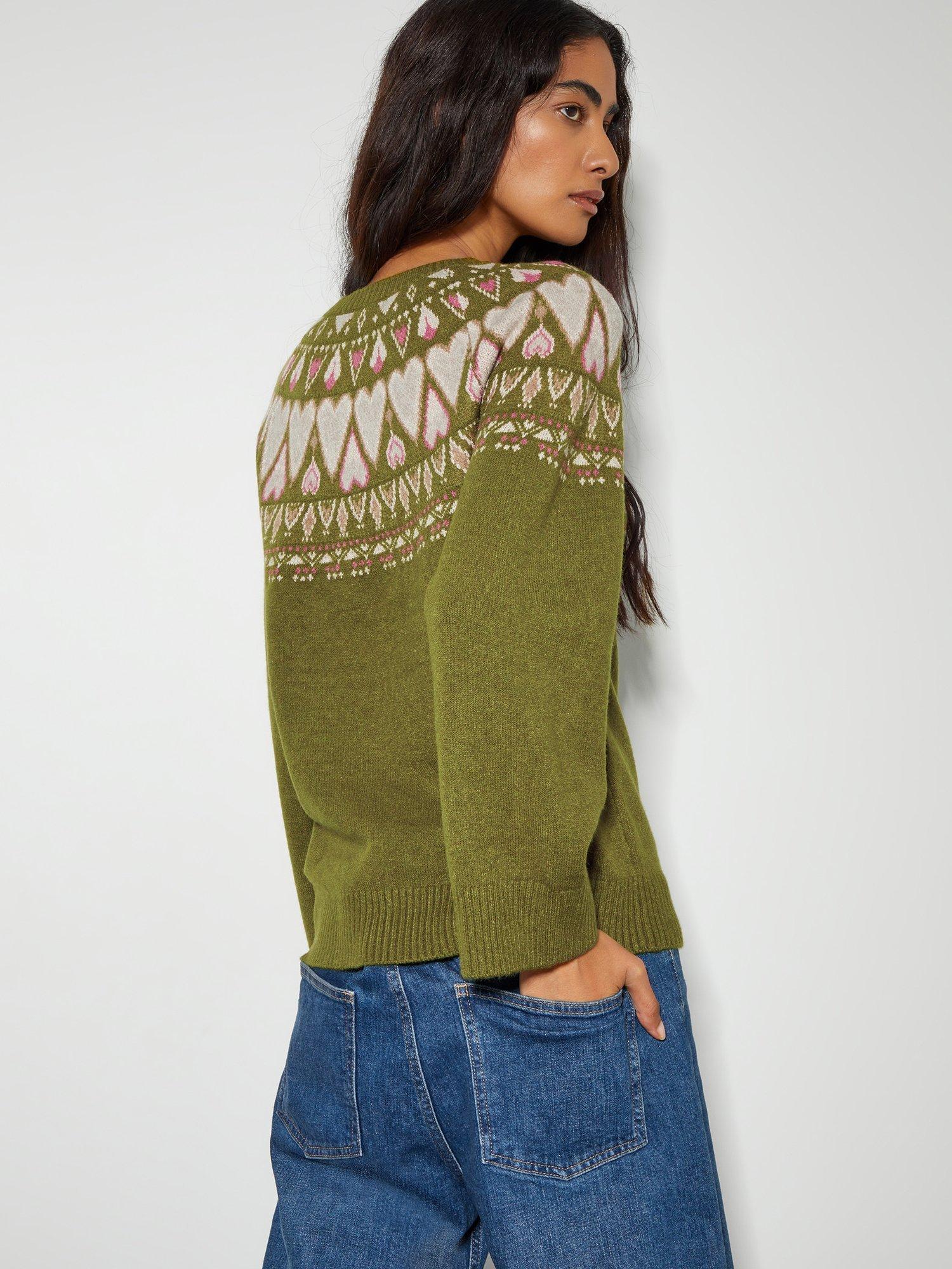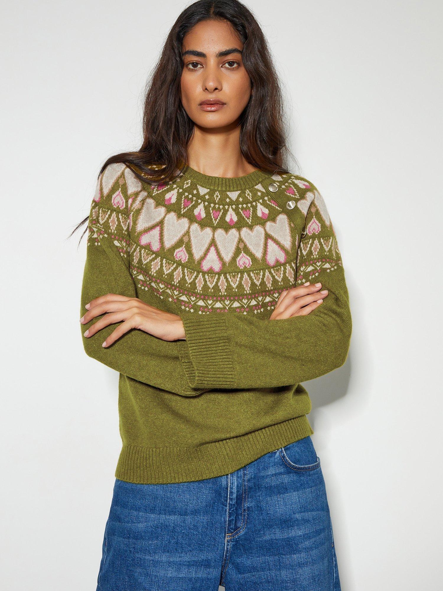We heart this. Woven with pretty-in-pink hearts in a fair isle-inspired design, this jumper is finished with ribbed trims to the cuffs, hem, and crew neckline. Jeans, say hello to your new best friend.