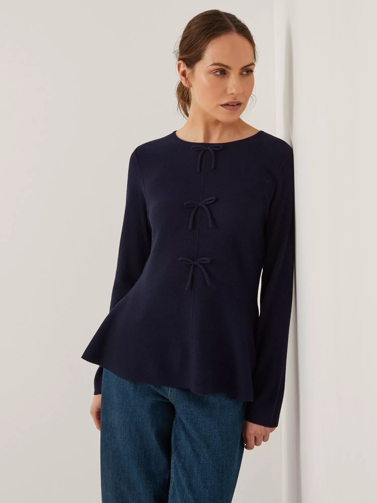 Designed with long sleeves and a peplum-style waist for a cinched finish, this jumper is decorated with a trio of bows through the front.