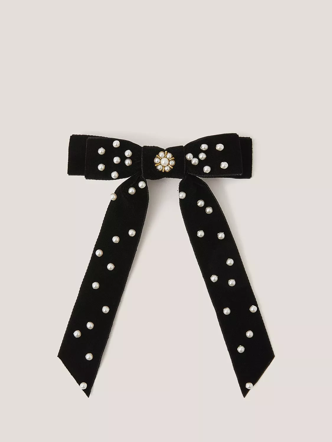 The perfect finishing touch to all their party looks. Designed with velvet ribbon and decorated with pearly embellishments, this hair bow features long ties that cascade down the back. Secures in the hair with a salon clip.