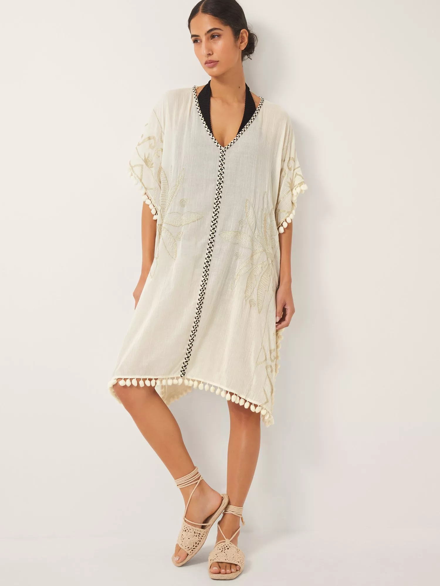 Best paired with a good book and a generous helping of SPF. Boasting a crinkle finish, this kaftan is the perfect throw-on-and-go piece for your upcoming escape to the sun. Finished with metallic embroidery and pom-pom detailing through the trims.