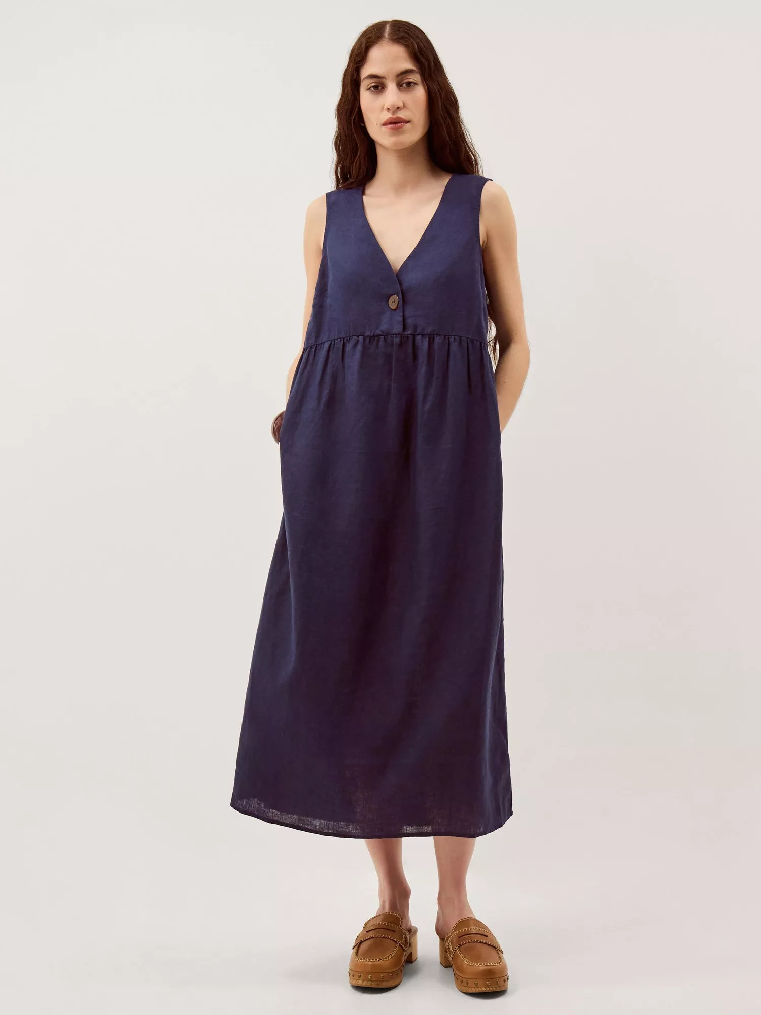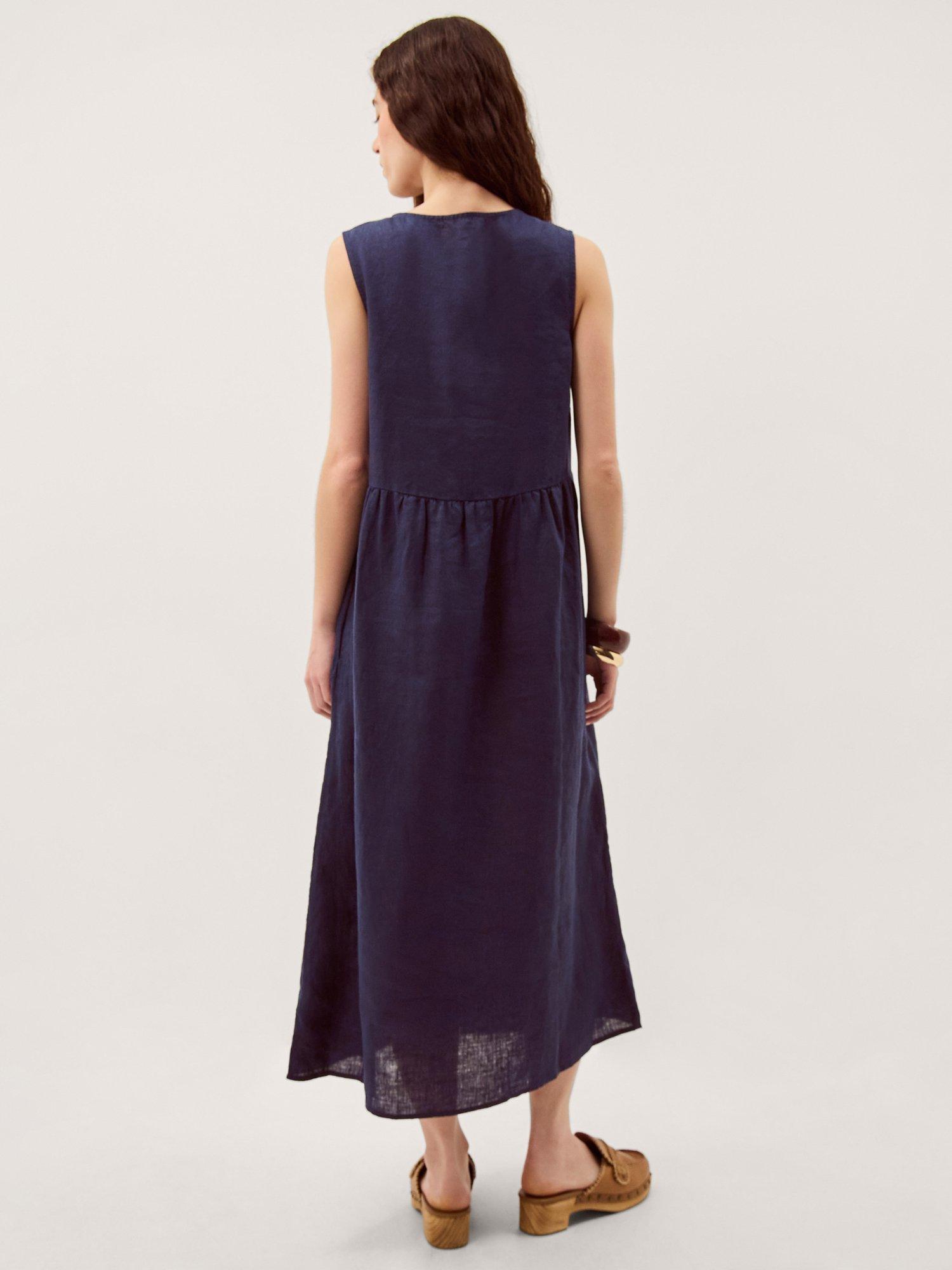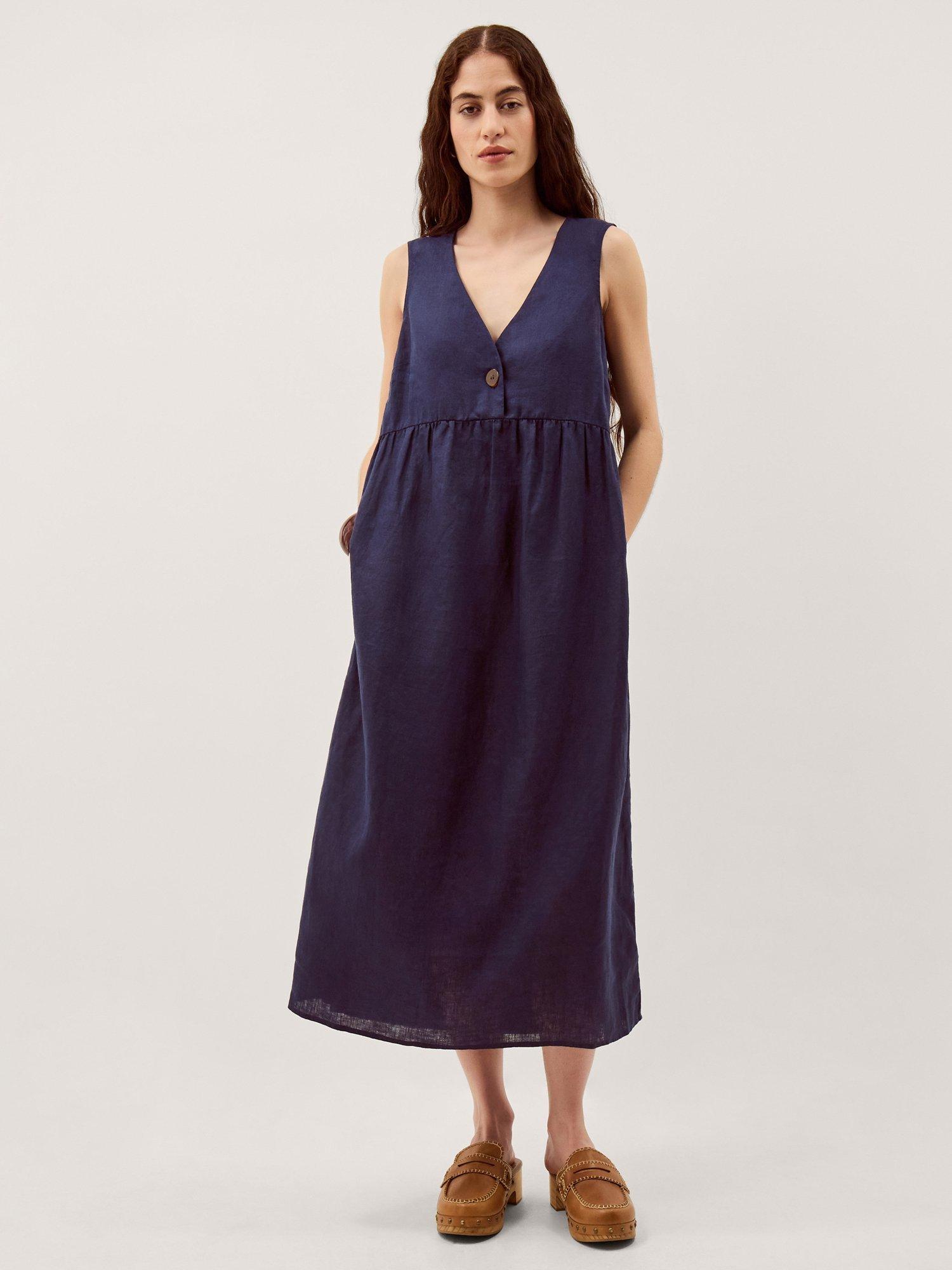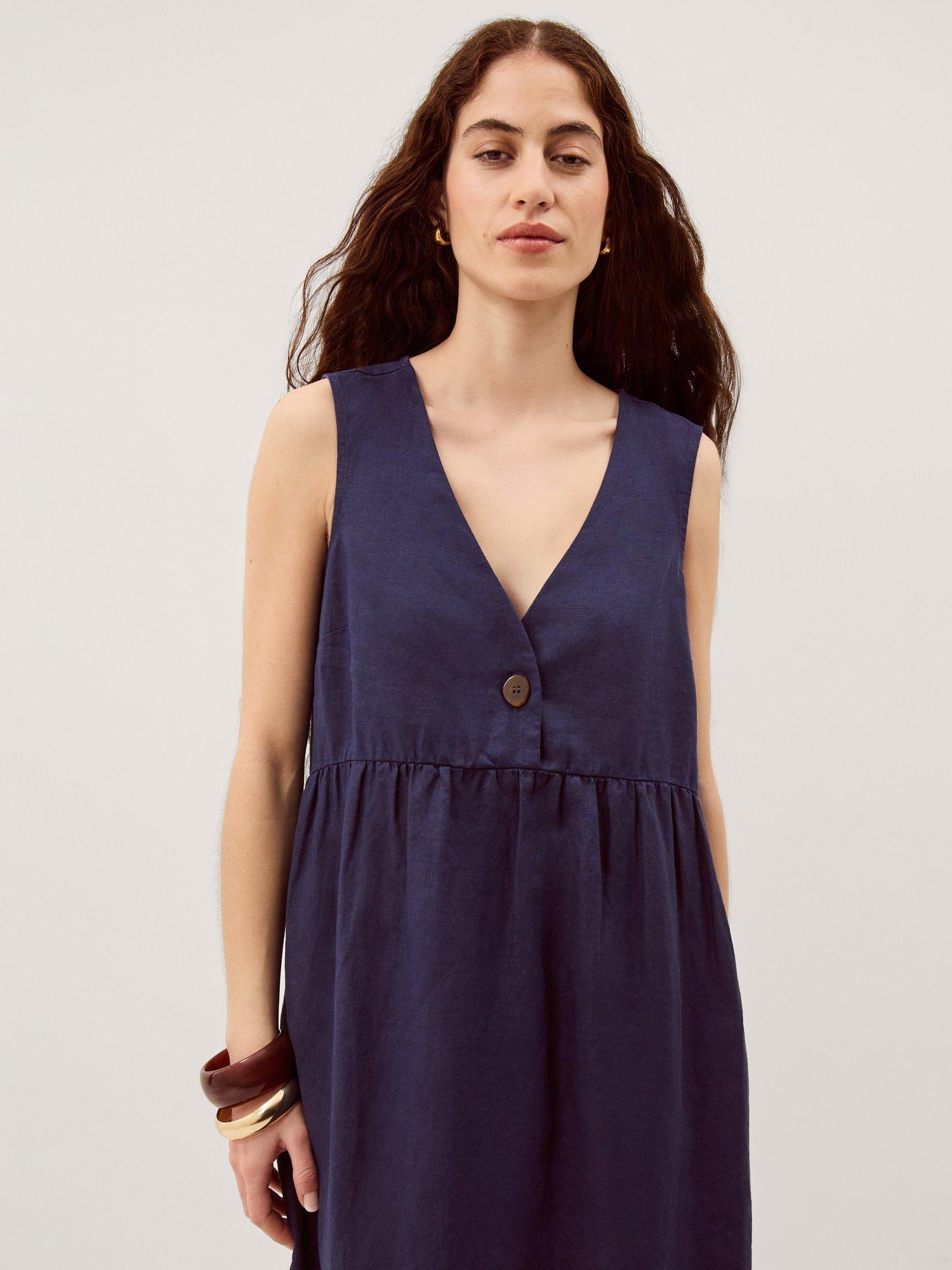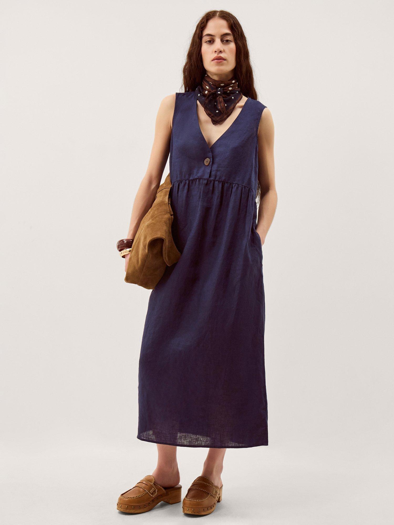 This sleeveless midi dress in pure linen features a straight tunic shape and a flattering V-neck, keeping you cool and comfortable. An easy favourite for your summer plans, finished with button detailing.