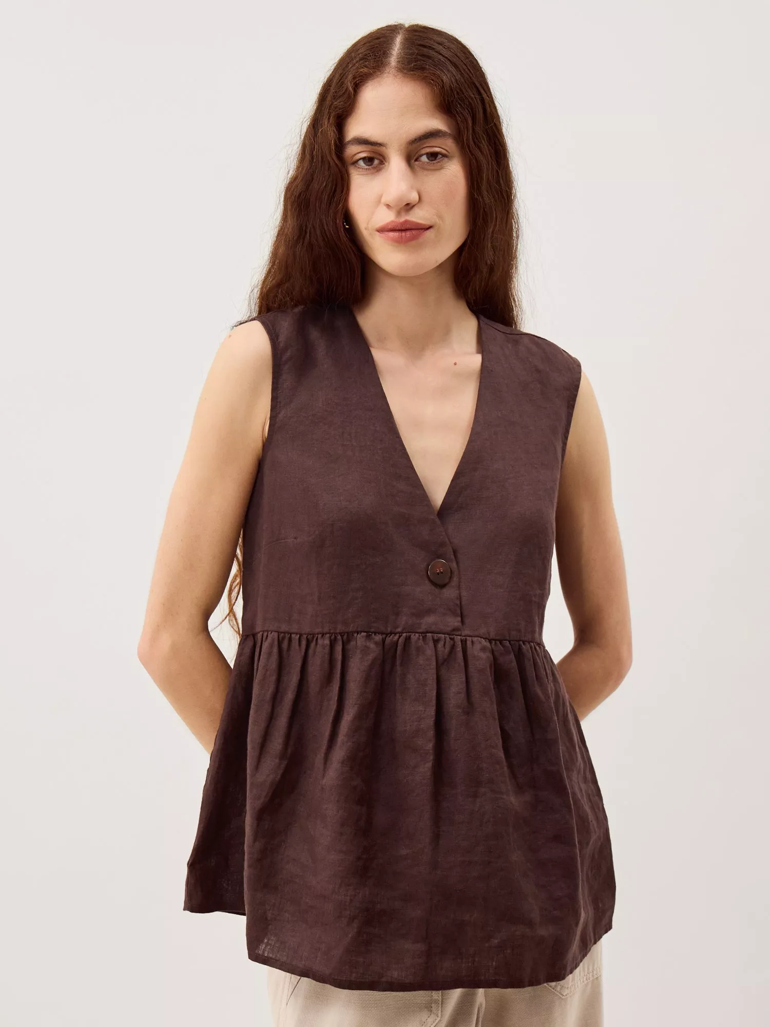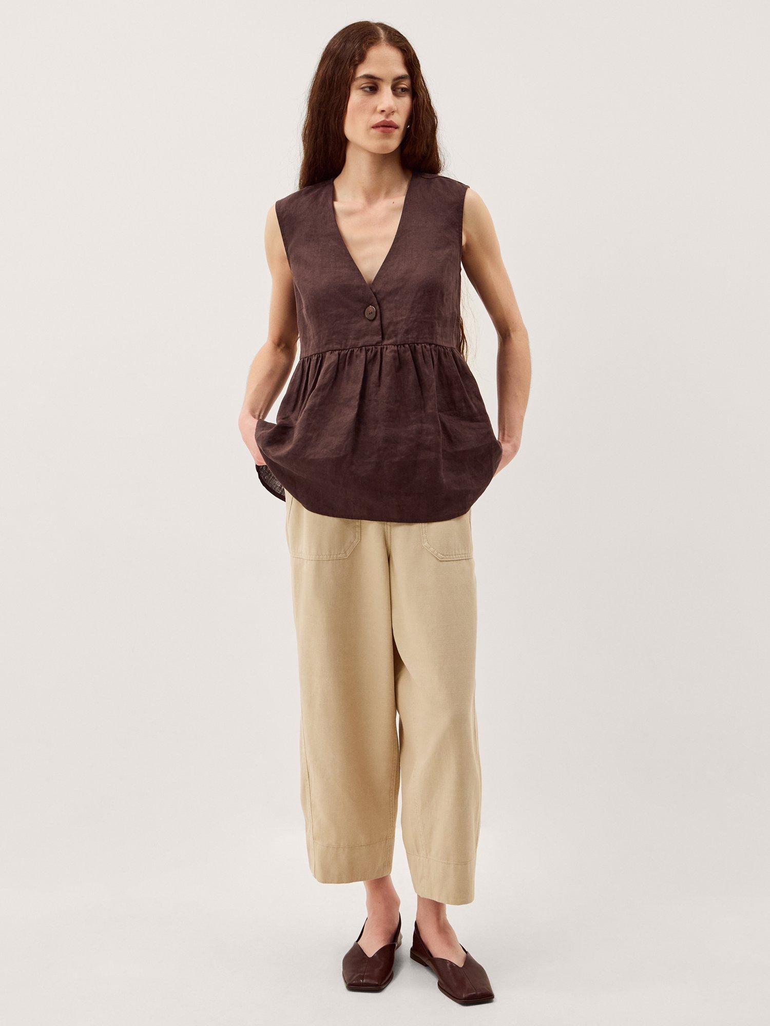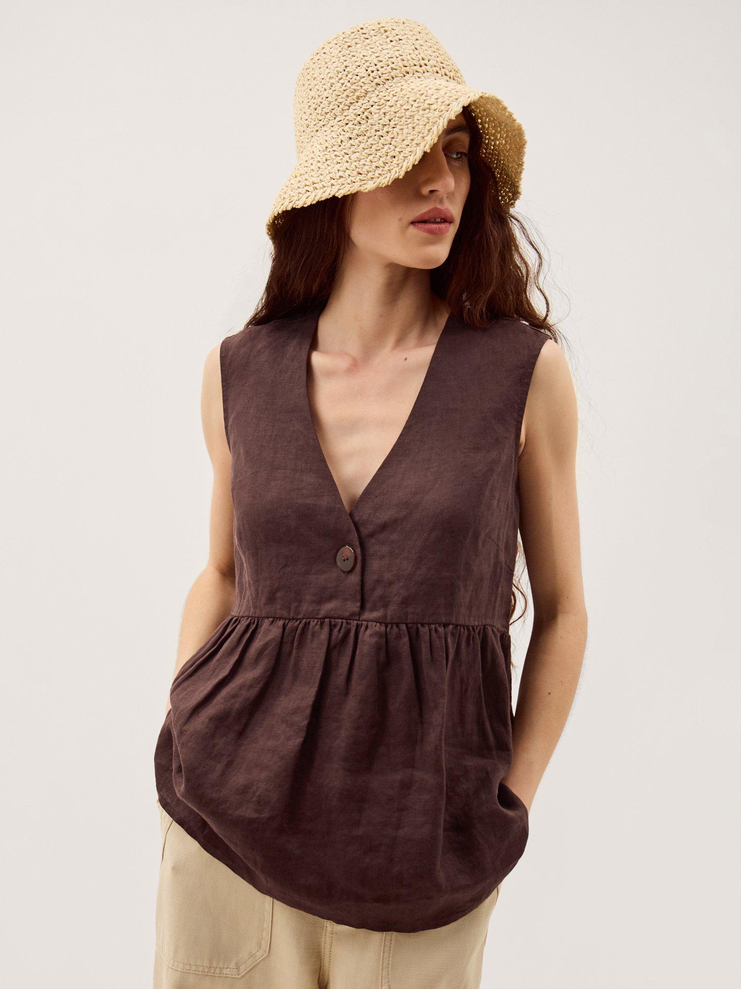 Linen for summer? Always. Crafted for years of use, this sleeveless top is soaked in a versatile tone and designed with a singular tort button under the v-neckline. Whether you double up with linen trousers or style with denim, it'll be a killer combo every time.