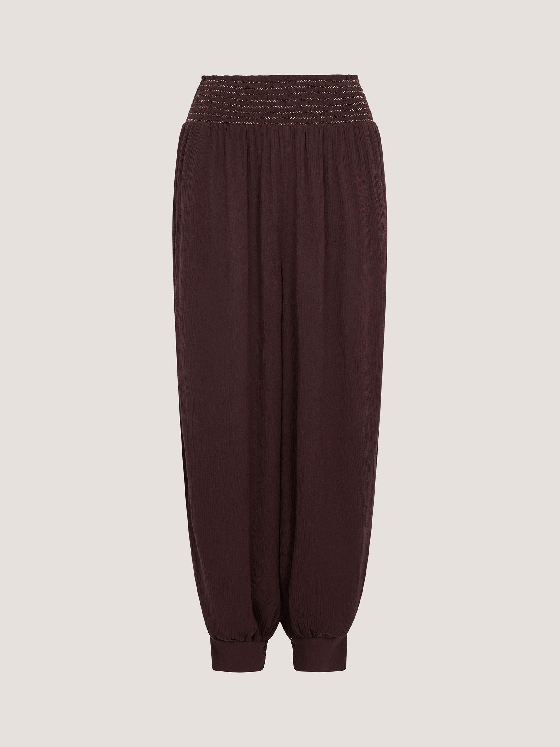 Tapered shape harem trousers by Monsoon. This style is cut to sit mid rise with an elasticated waist and hems that fall to a regular length.