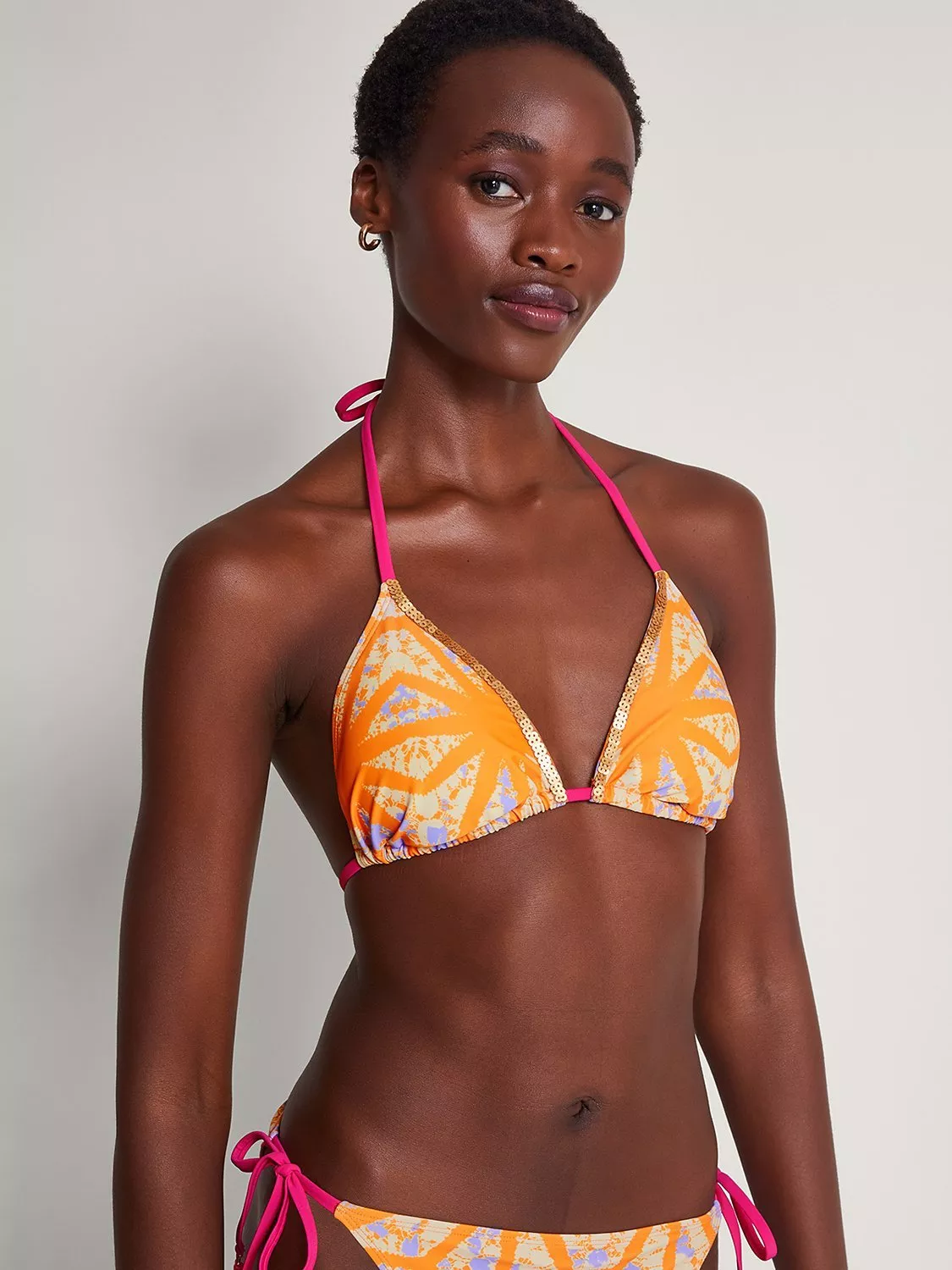 Wrapped in an abstract print that's sure to stand out from the rest, this moulded bikini top from Monsoon has a triangular neckline, an open back and self-tie straps that you can adjust to ensure confidence as you move in the water. Pair with the matching bottoms to create the perfect look fit for tropical getaways and at-home sunbathing alike.